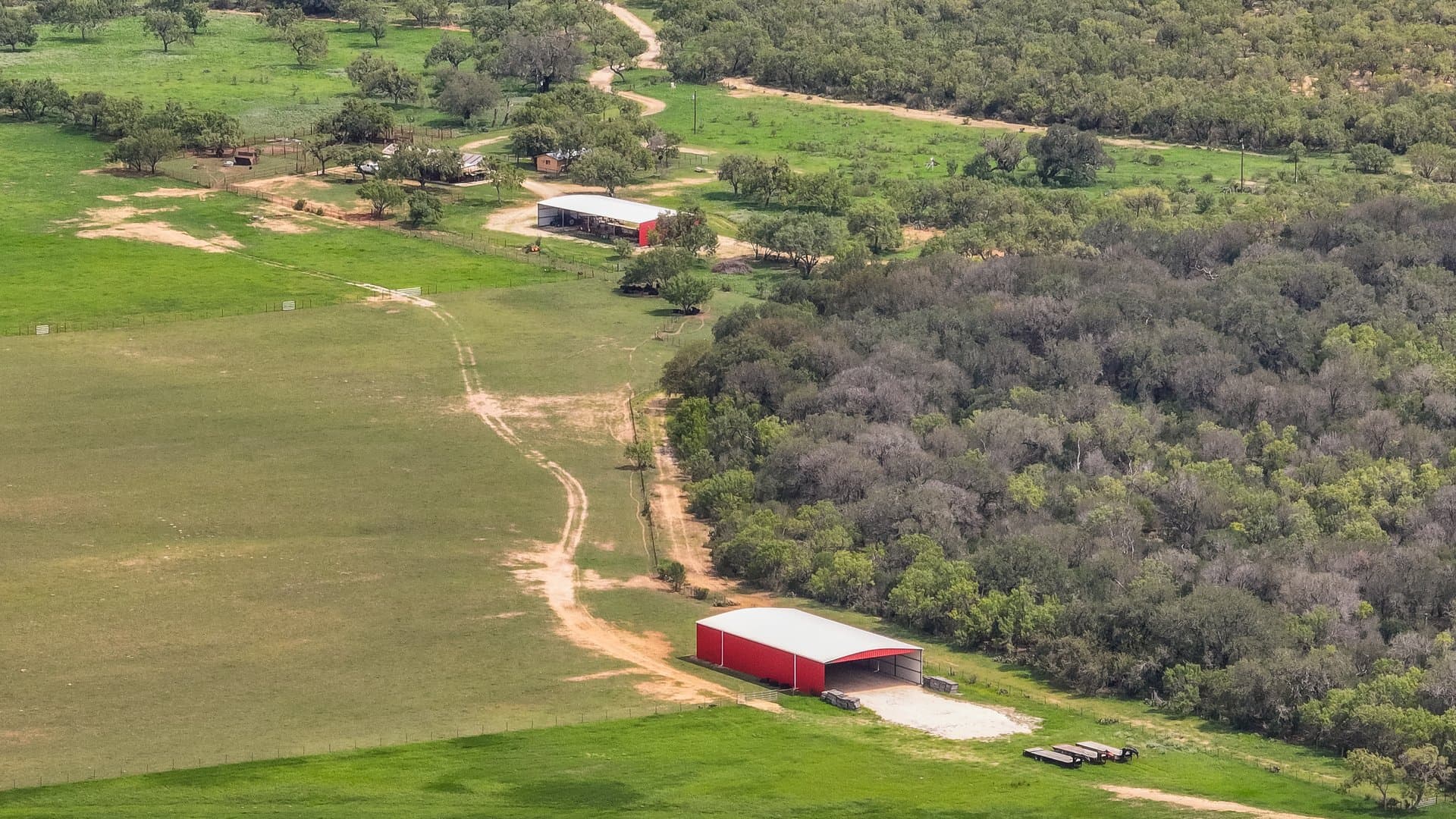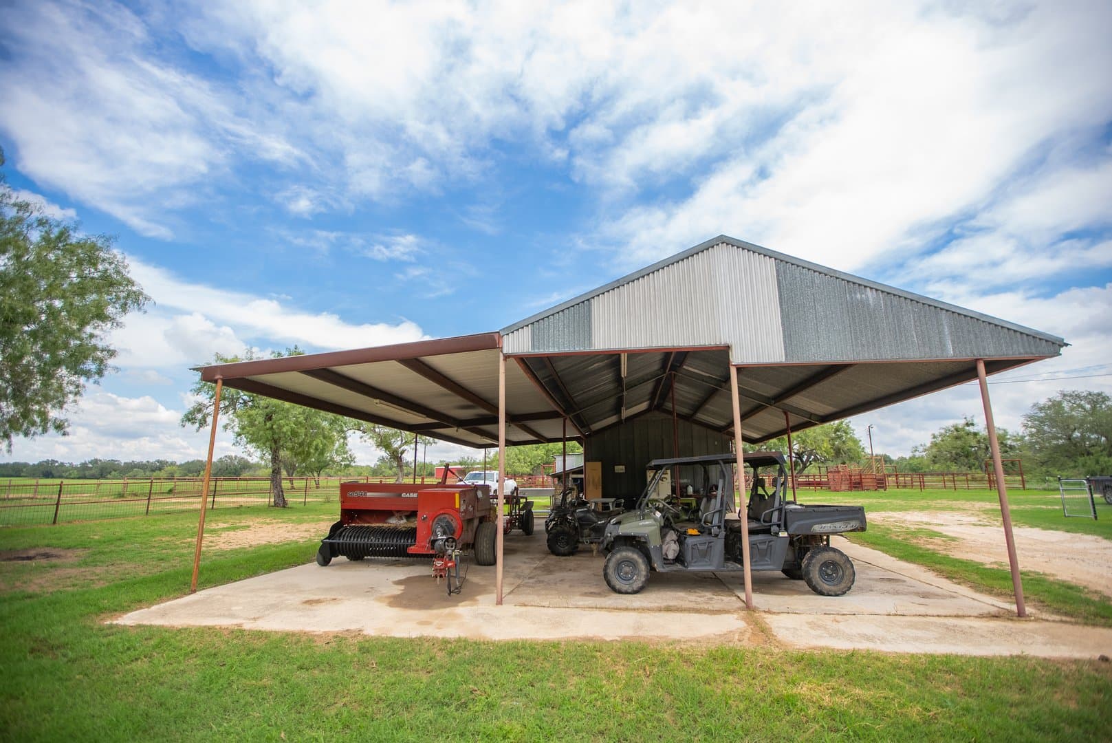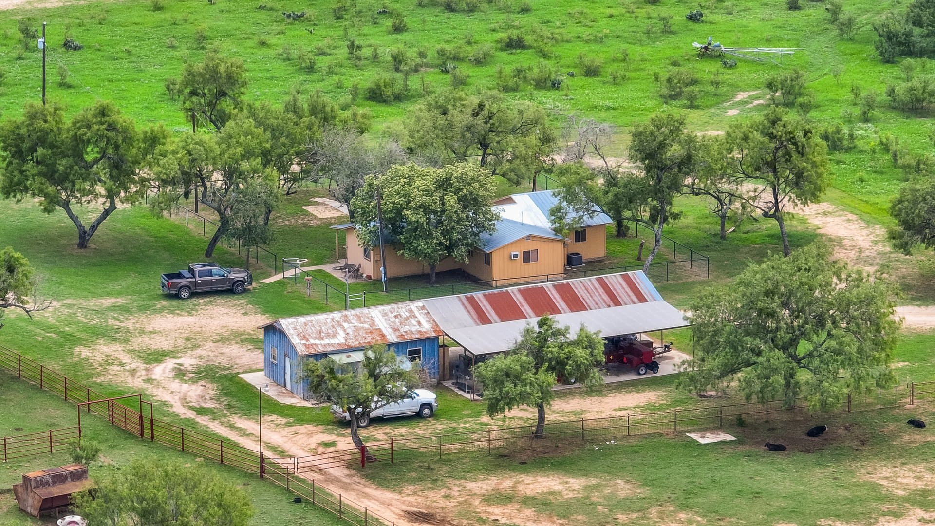The ranch is unique in the fact that it has numerous improvements, and no expense has been spared. The ranch includes 2 Carrizo Irrigation wells and 2 domestic wells. The 3 center pivots on the ranch irrigate approximately 162+/- acres in total. Water is also piped throughout the ranch to a centrally located set of valves. There are two barns on the ranch that are utilized for hay storage, one being 5,000 sq. ft. and the other 8,400 sq. ft. as well as a 4,500 sq. ft. equipment barn and a smaller equipment barn located by the house. The ranch is cross-fenced and has a well-thought-out set of pens that are centrally located for ease of penning, rotating, and working cows. There is a well-built, 3 BR/2B ranch house that is located near the pens. Electricity is provided by Medina Electric Co-Op.