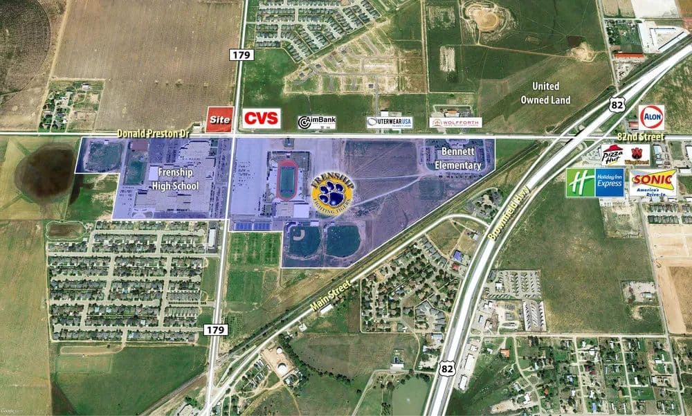 A rectangular commercial tract of land located on a hard corner. Across FM 179 from the location of a to-be-built CVS store and across Donald Preston Drive from Frenship ISD High School.