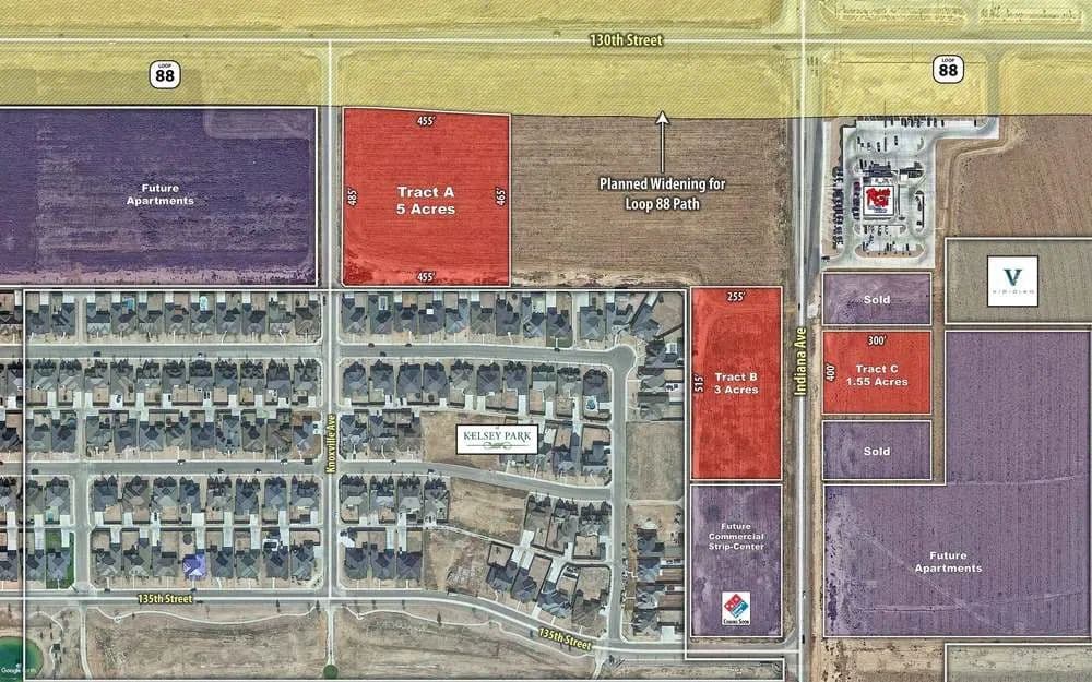 These properties sit south of 130th Street on both the east and west sides of Indiana Avenue. Conveniently located with frontage along the future Loop 88 (broke ground in 2018). This Prime location in growing south Lubbock is teaming with new residential subdivisions and is ideal and ready for commercial development. Tracts are not in the floodplain. Build-to-suit or Ground Lease Tract A - $15.00 per Square Foot - 5.00 Acres Tract B - $15.00 per Square Foot - 3.00 Acres Tract C - $15.00 per Square Foot - 2.75 Acres