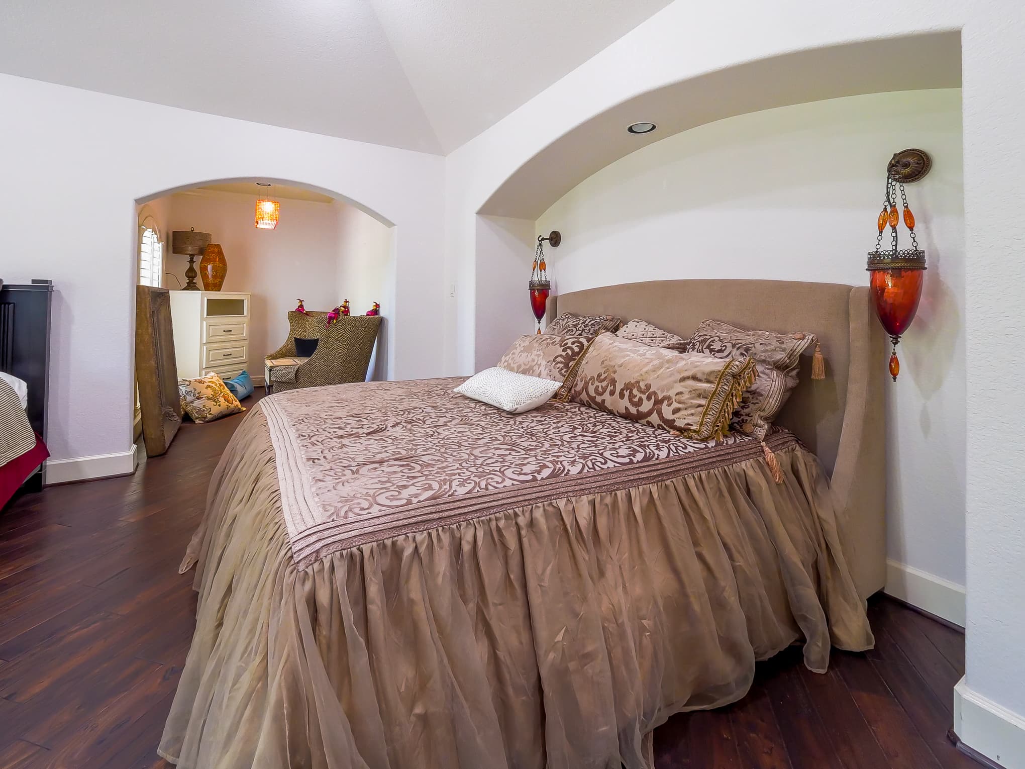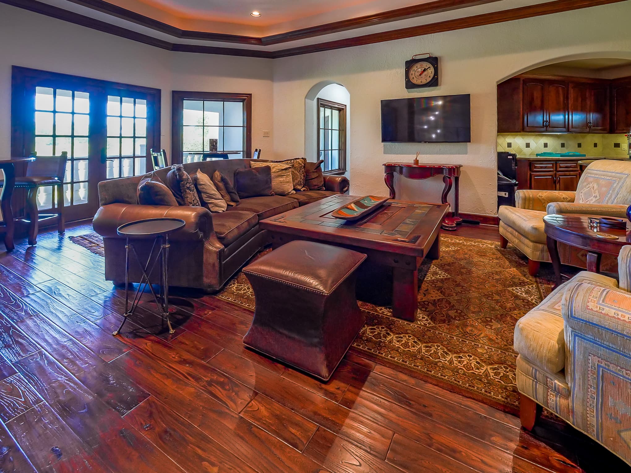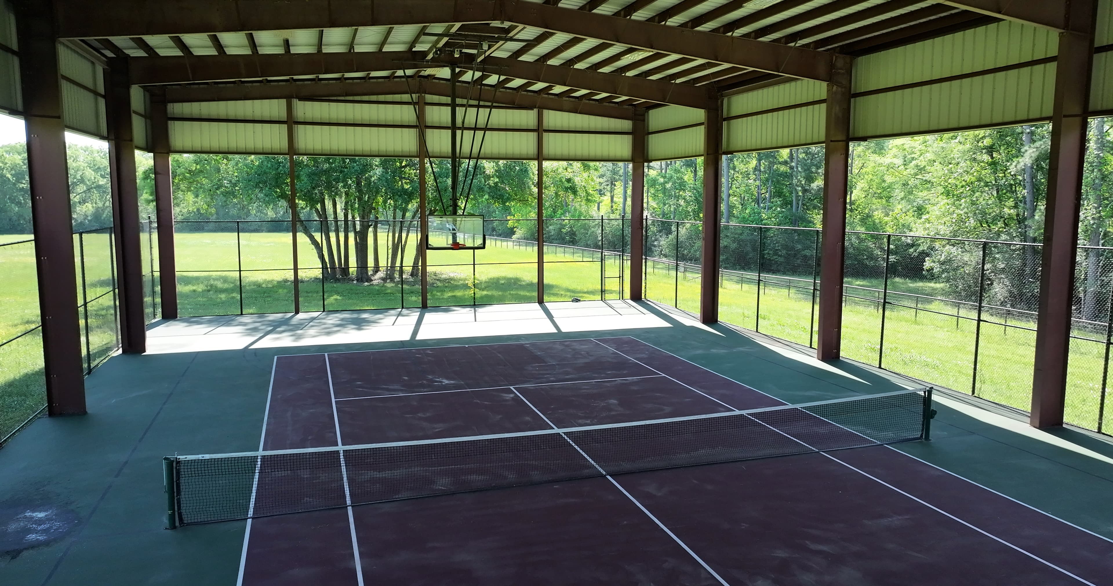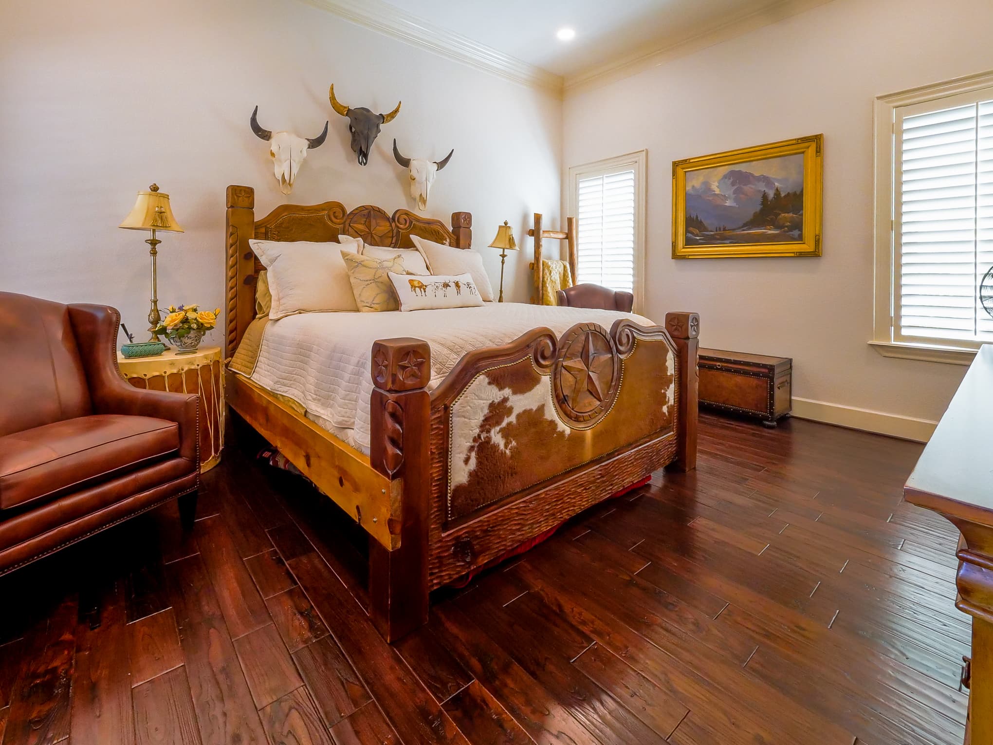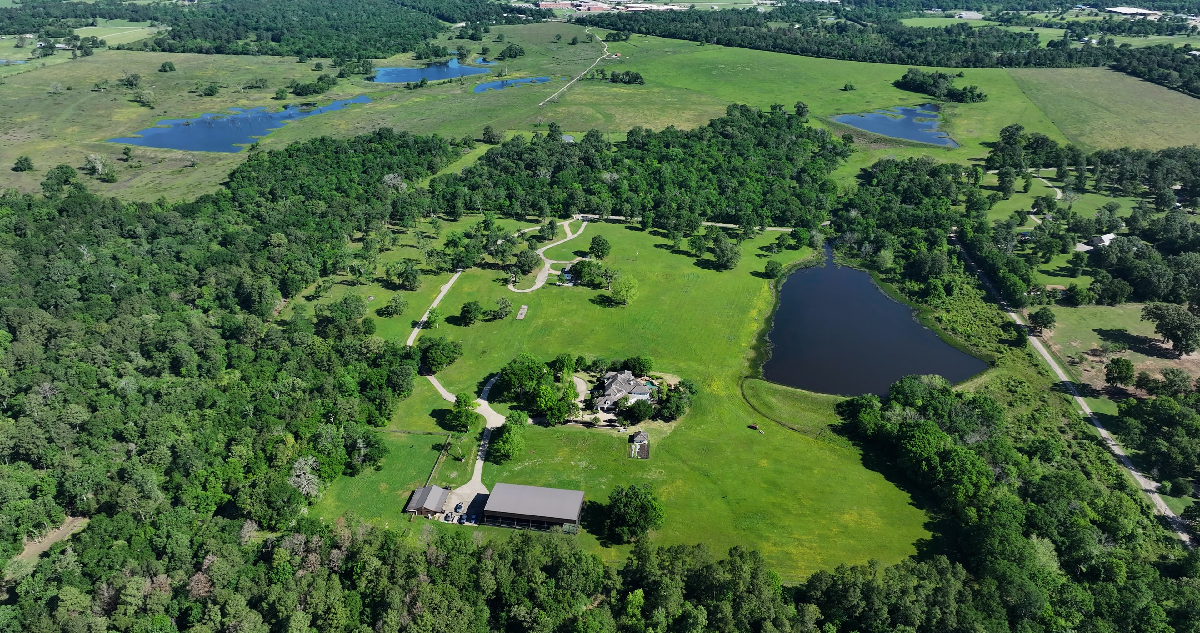 A gated entrance and winding paved driveway welcome you to this stunning 50± acre country estate secluded on a cul-de-sac just outside of historic city of Montgomery. The two story home overlooks a six acre stocked lake. The 8756 square foot home includes a family room , formal dining room, office, gameroom, media room, and an exercise room. The island kitchen features a Wolf Range, Subzero fridge and freezer, wine storage, Coffee Station, and slate flooring. It is open through the expansive windows from the living area to bring the pool with waterfall, water slide and hot tub into the picture. The covered outdoor kitchen next to the pool has cooker, fridge, wood burning fireplace, and grill . There is a full size basketball and tennis court under roof, and a barn with stables for your recreation. Majestic oak and bois d’arc trees add to the allure of this one of a kind estate. Serene Country living horses, cattle, hunting, or fishing awaits you and your family at Womack Estate!