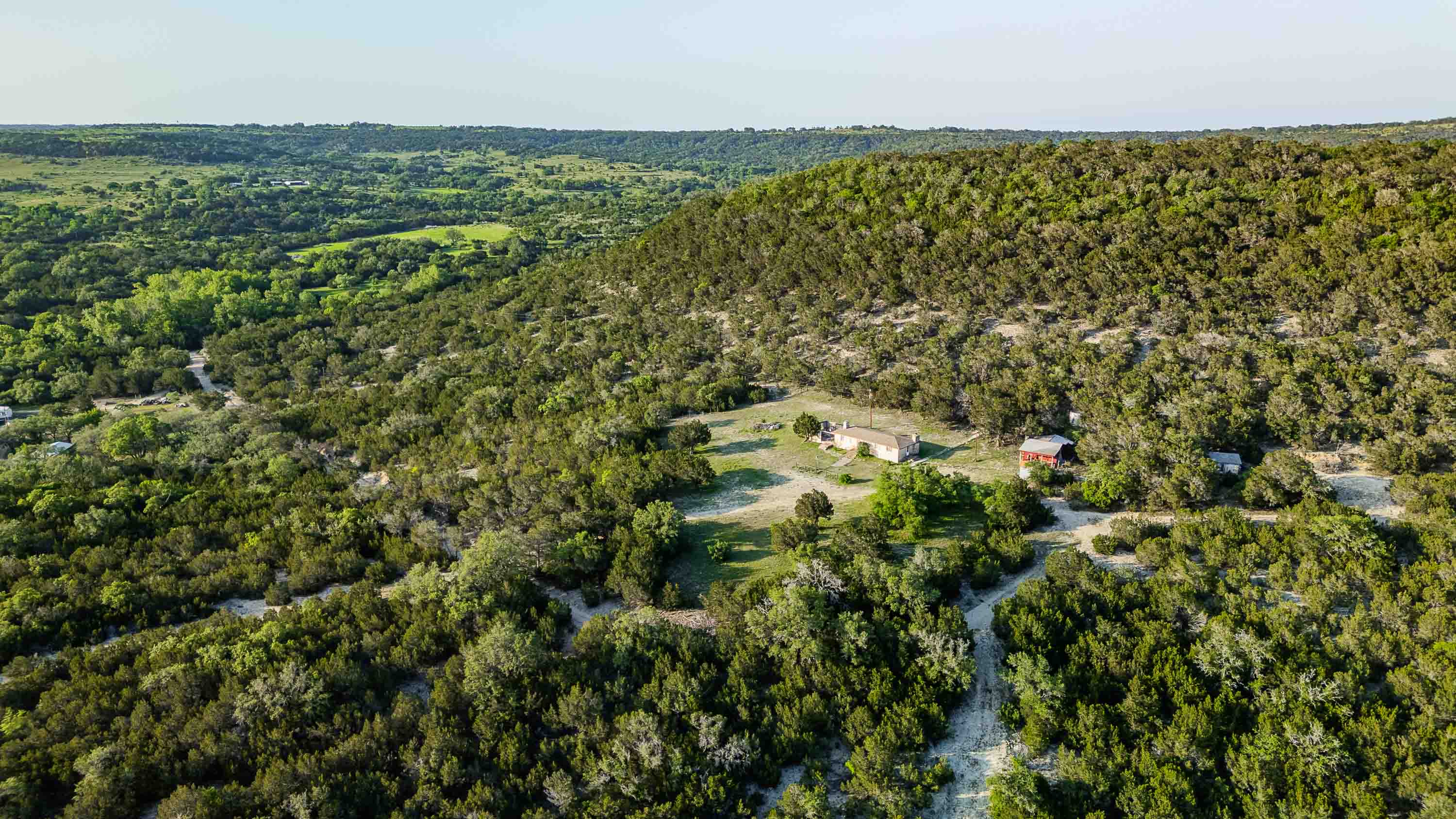 This 405-acre Hill Country ranch is surrounded on two sides by the Balcones Canyonlands National Wildlife Refuge. The property is located in the Balcones Canyonlands area, just 7 miles north of Lake Travis, east of Marble Falls and just on the northwestern edge of Travis County. The area is well known for its spectacular Hill Country views and scenic countryside and this property has it all. It is unrestricted, rugged and ready for new ownership. Potential uses include a family recreational ranch or homesite, subdivision into large tract homesites or commercial operations such as glamping, rental cabins or other recreational type development. The property includes a 1400 sqft livable cabin, a water well with a new pump, electric and septic. Also includes two smaller, approximately 500 sqft, hunting cabins that need work.