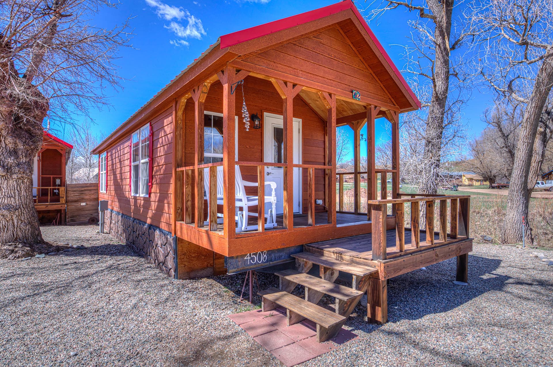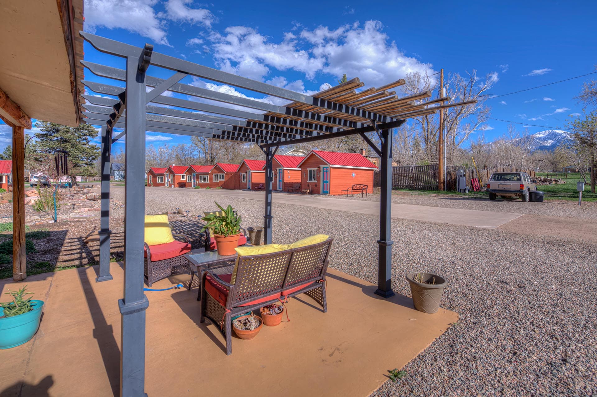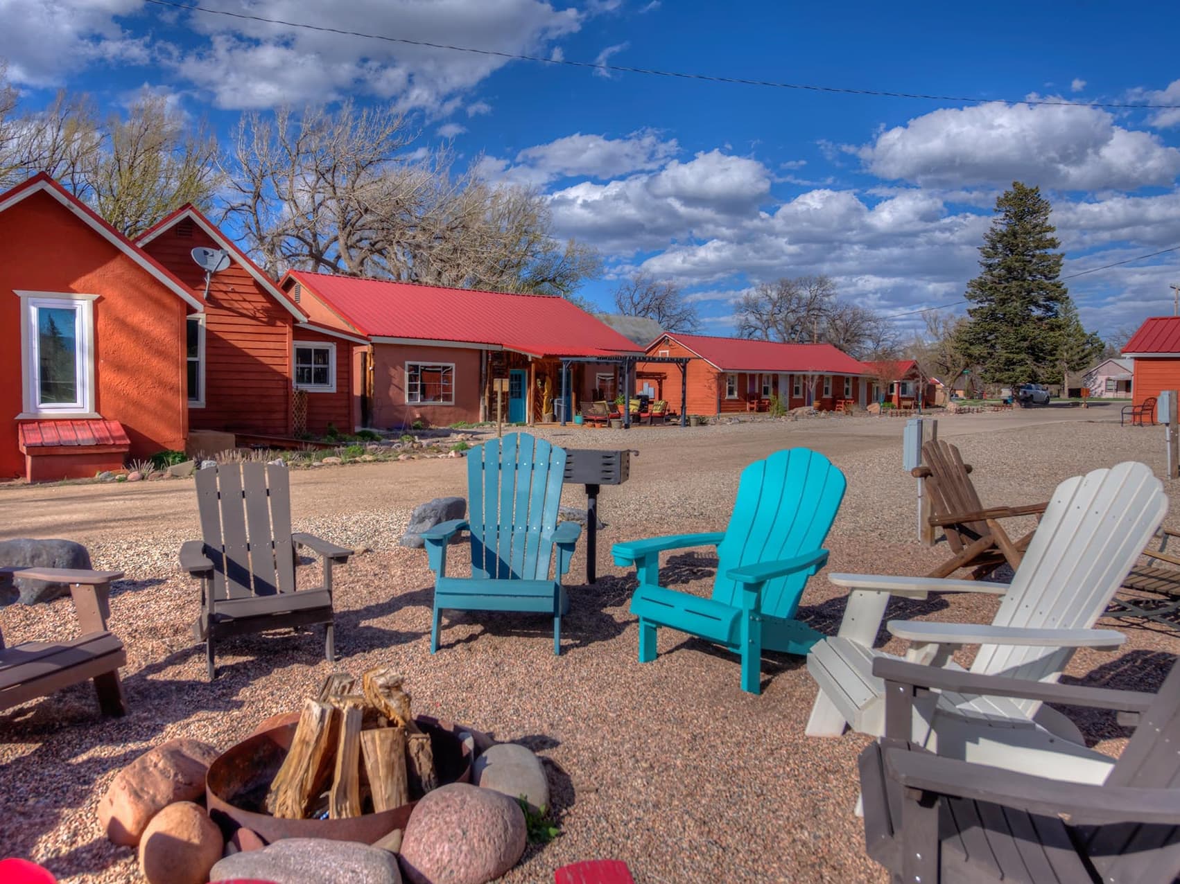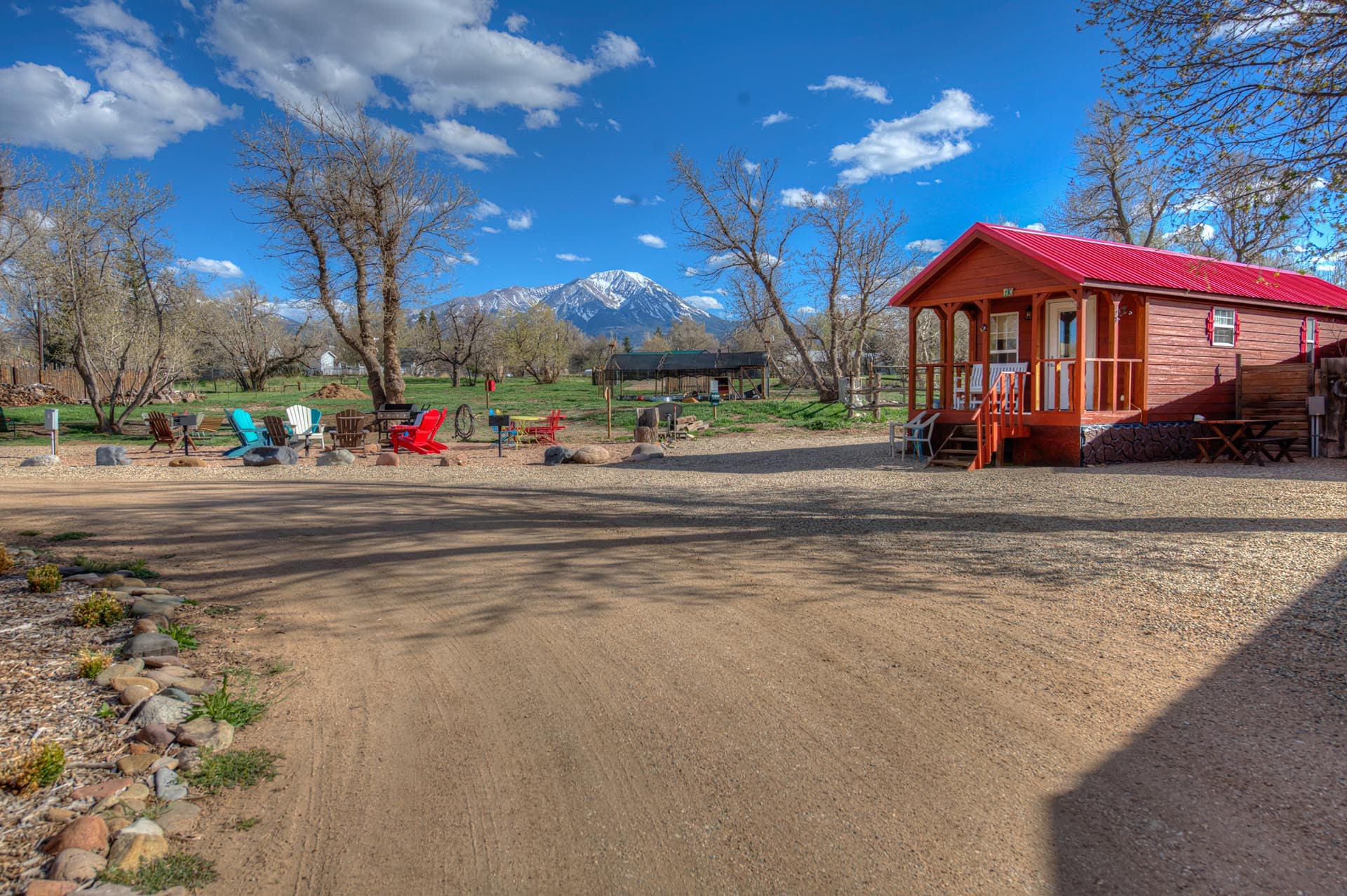 Two Fox Cabins consists of 12 individually styled cabins and rooms, each with its own layout and personality. The accommodations are thoughtfully themed and situated on or near the Cucharas River, which runs along the edge of the property. This natural setting adds to the charm and appeal of the grounds, which also feature hookups for small RVs, a couple of tent campsites, and a beautifully landscaped outdoor area. Guests can enjoy yard games, a fire pit, a porch swing by the river, and peaceful walks with scenic views of the Spanish Peaks.