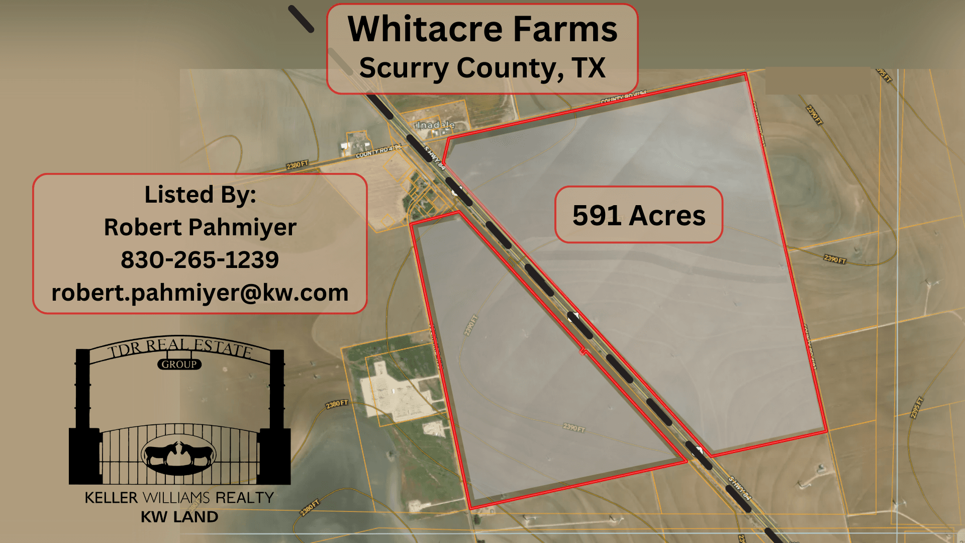 This 591-acre North Central Texas Farm is located in the southeast corner of Scurry County and on the edge of Nolan and Fisher Counties. The property is located ~17 miles NW of Sweetwater and ~20 miles SE of Snyder. It is bisected by State Highway 84 with roughly 396 acres on the NE side of Hwy 84 and 195 acres on the SW side of Hwy 84. Over 1 mile of frontage on divided State Highway 84 and 4,200 feet of frontage on County Road 466.
