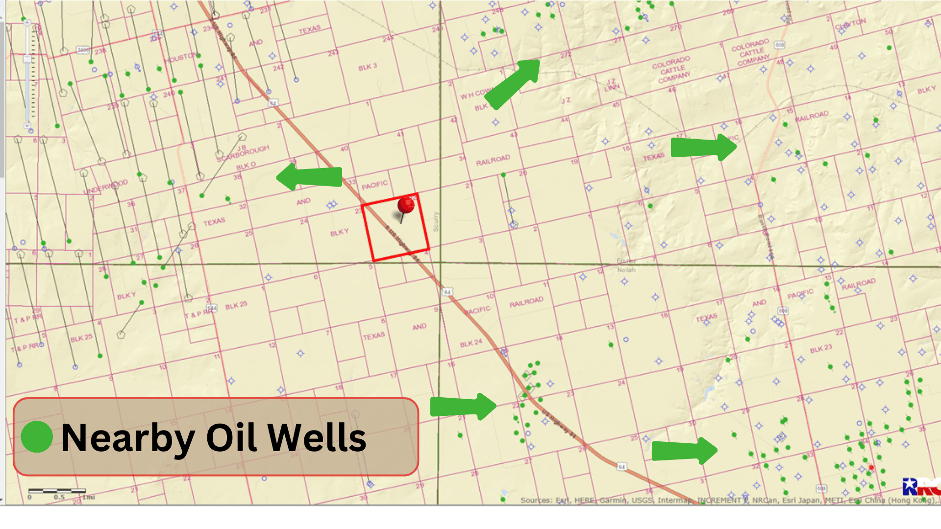 c. There are multiple oil fields near this property, with ongoing production from the Strawn, Wolfcamp, Canyon Sand, Ellenburger, and Penn Reef formations. There are also other geologic horizons nearby.