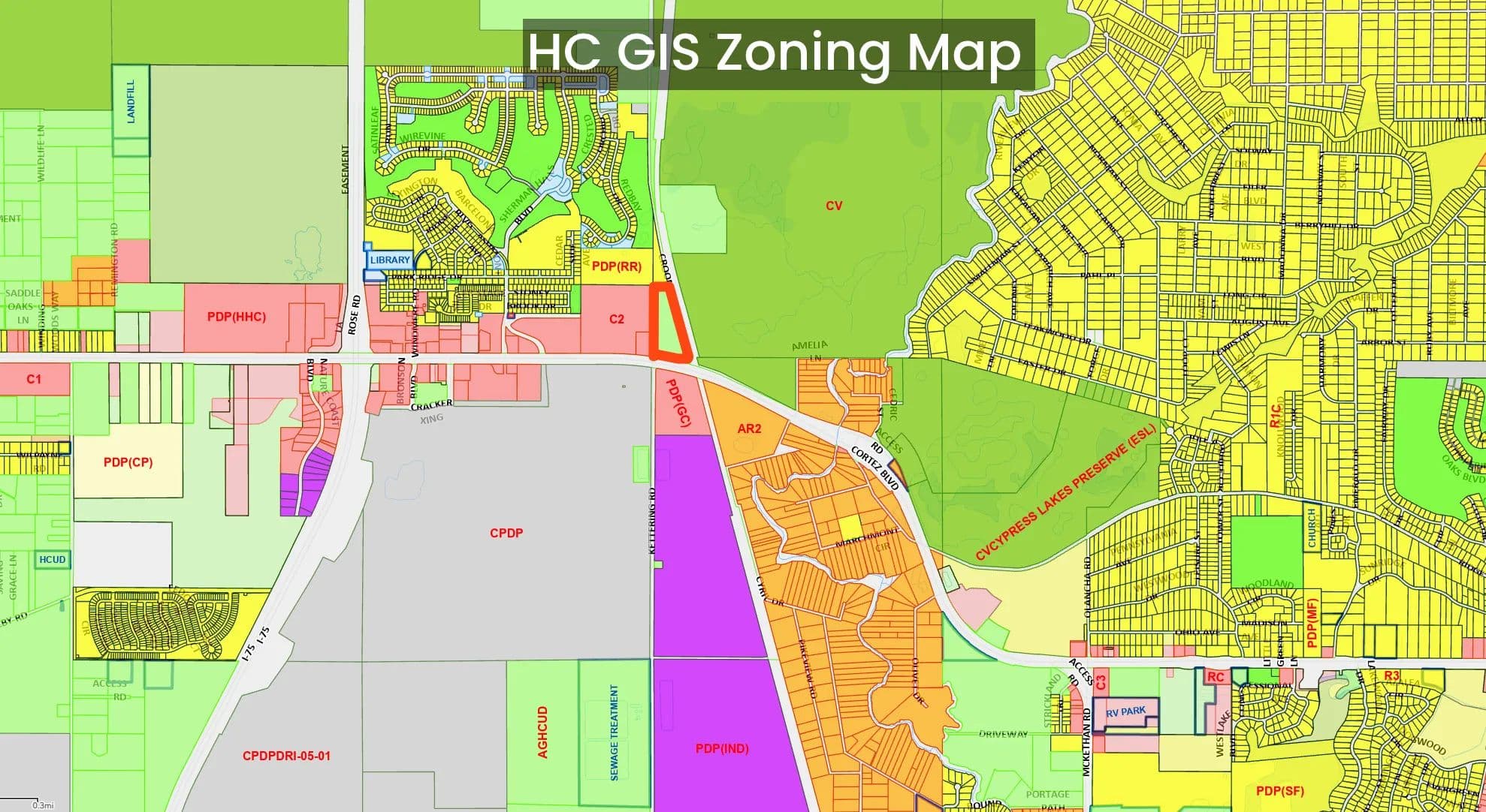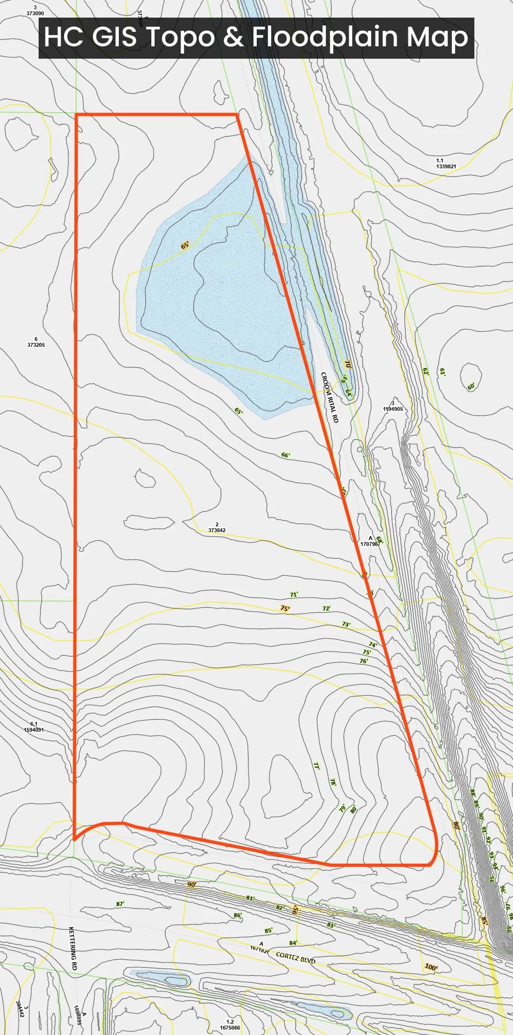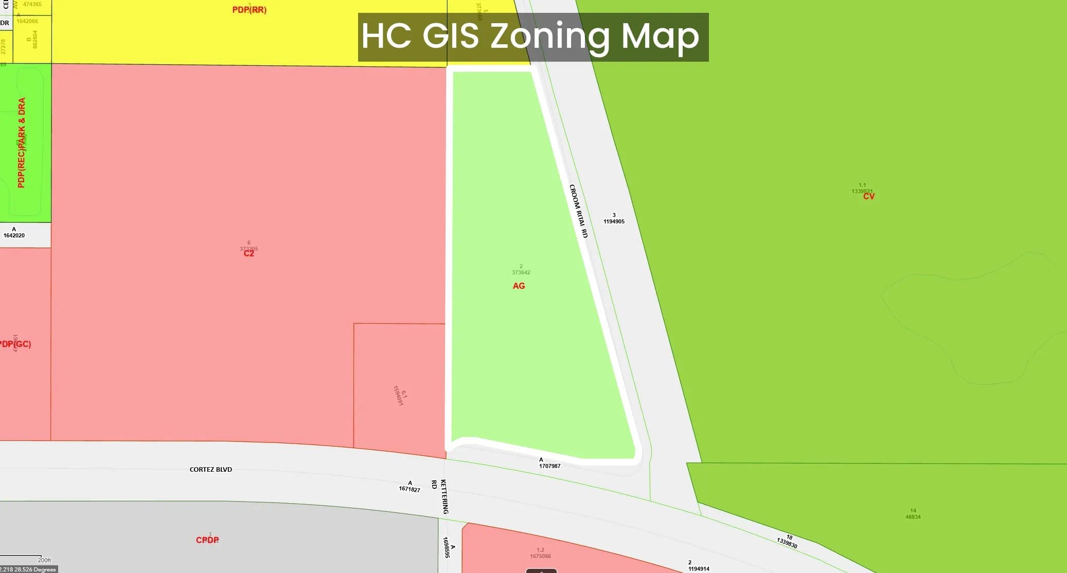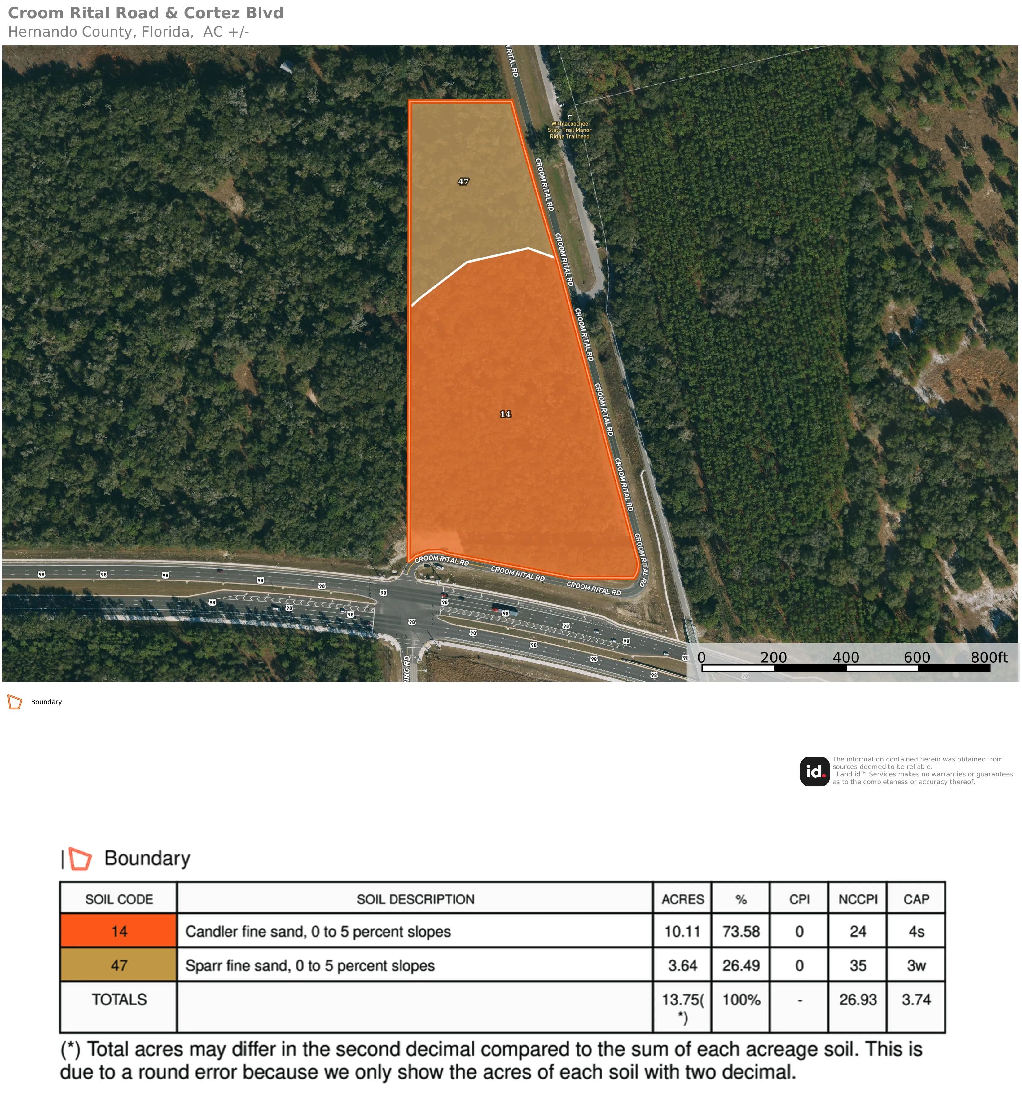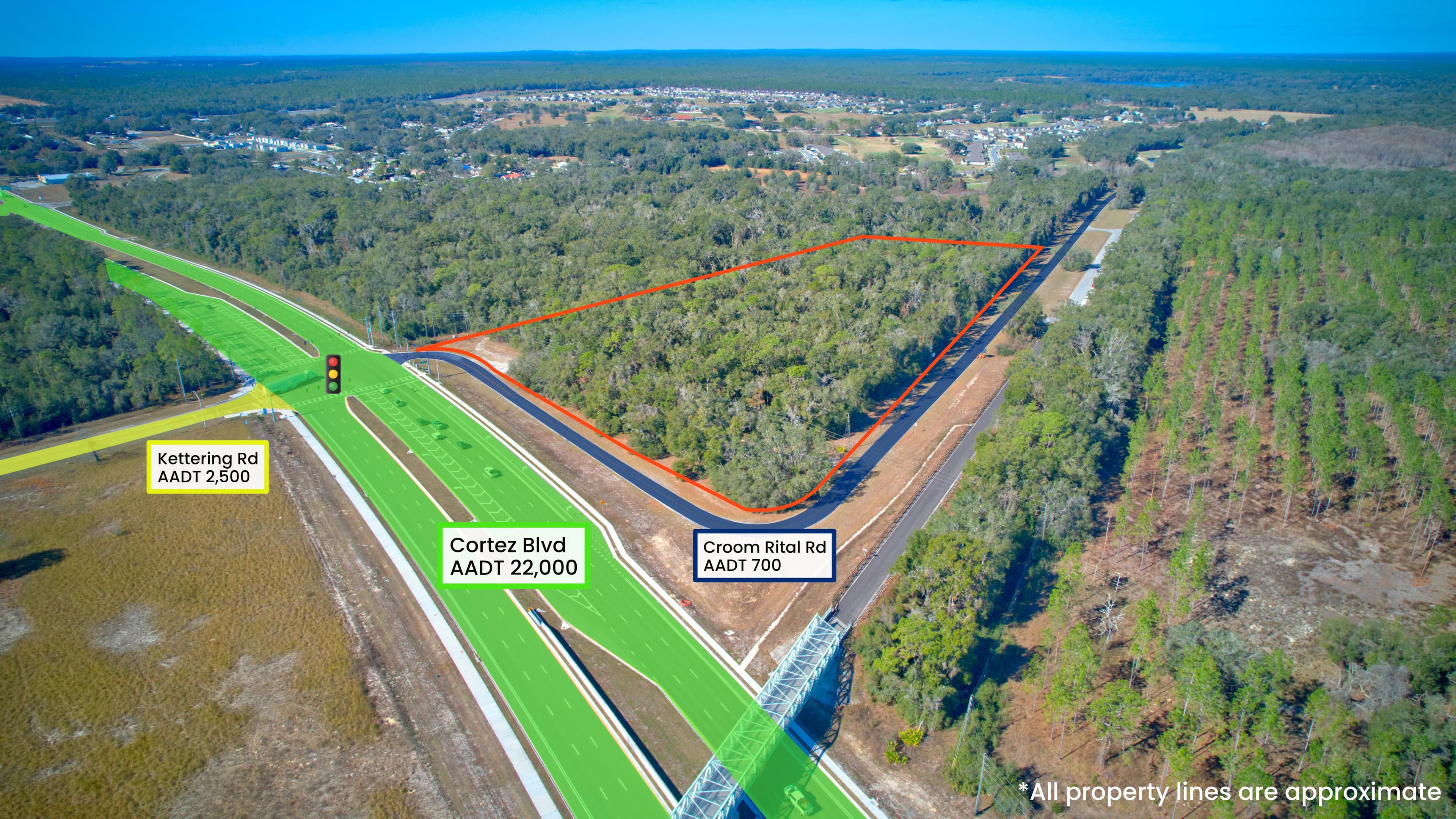 Do not miss out on a prime development or investment opportunity for 14.5 acres +/- at a signaled intersection in an area with an imminent major residential development of 4,200 homes located directly across the road and to the west! This land is located on Croom Rital Rd which immediately connects to Cortez Blvd. (SR 50) at a traffic light intersection. Potable water line along Cortez Blvd, in front of the subject property. Sewer force mains are on the opposite/south side of Cortez Blvd or 1,300 FT to the west on the north side (utilities map available). Existing access elements include the lighted intersection, a right turn deceleration lane, and a dedicated left turn signal lane onto Croom Rital Rd. This property has ~640 Ft of frontage on Croom Rital Rd and is directly visible from Cortez Blvd which experiences 22,000 vehicles per day. This property has a small floodplain area located towards the rear around 1.94 acres in size (flood and topo map available). Dimensions are property lines are approximate.