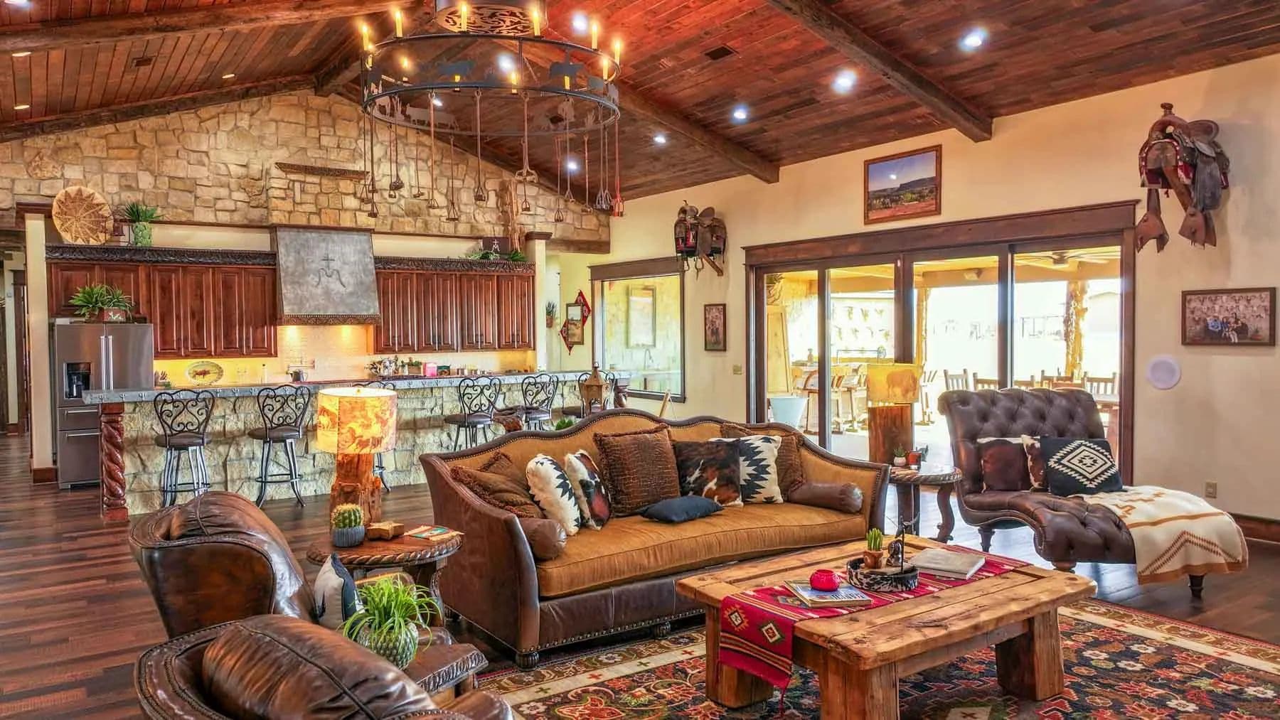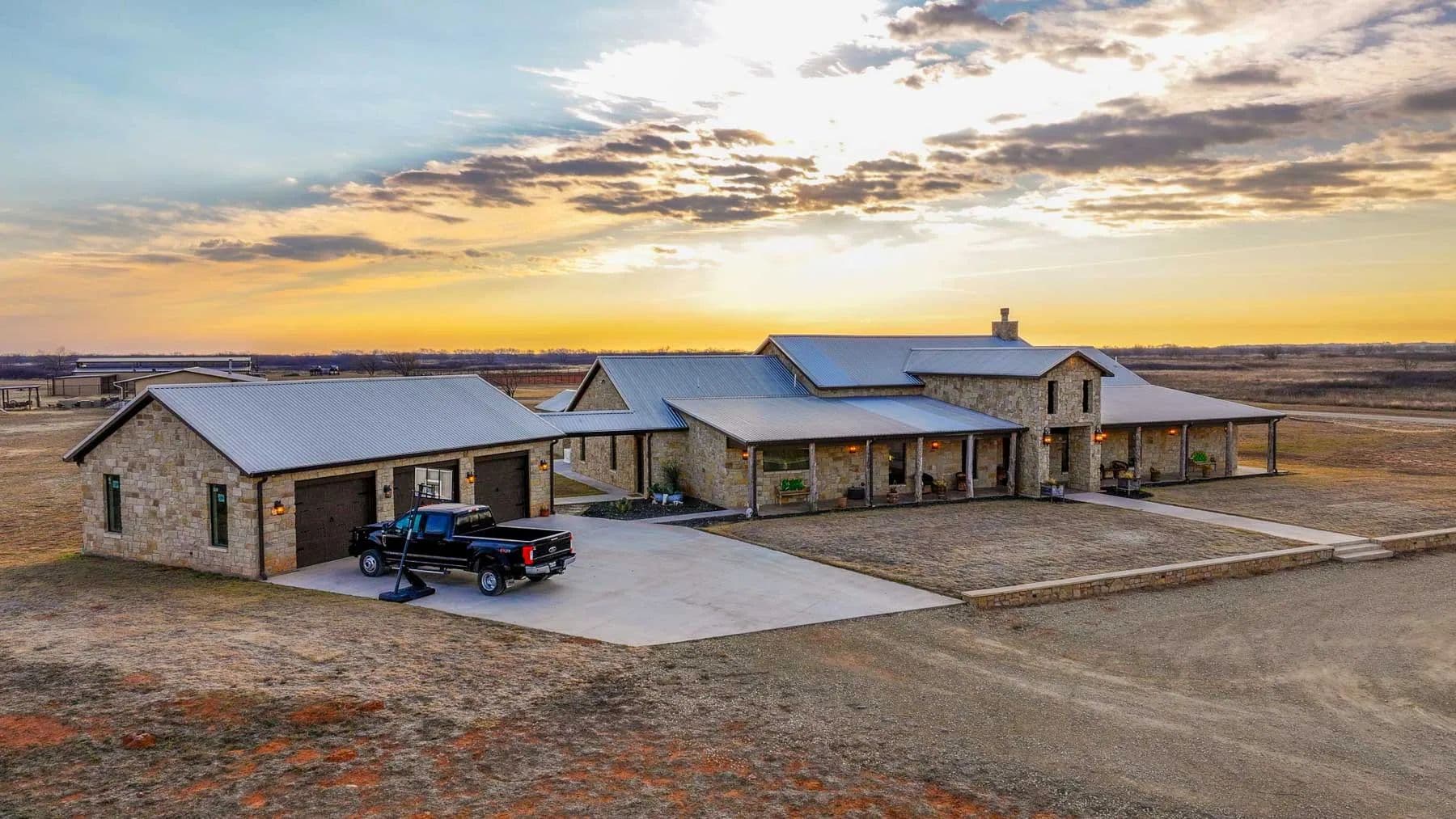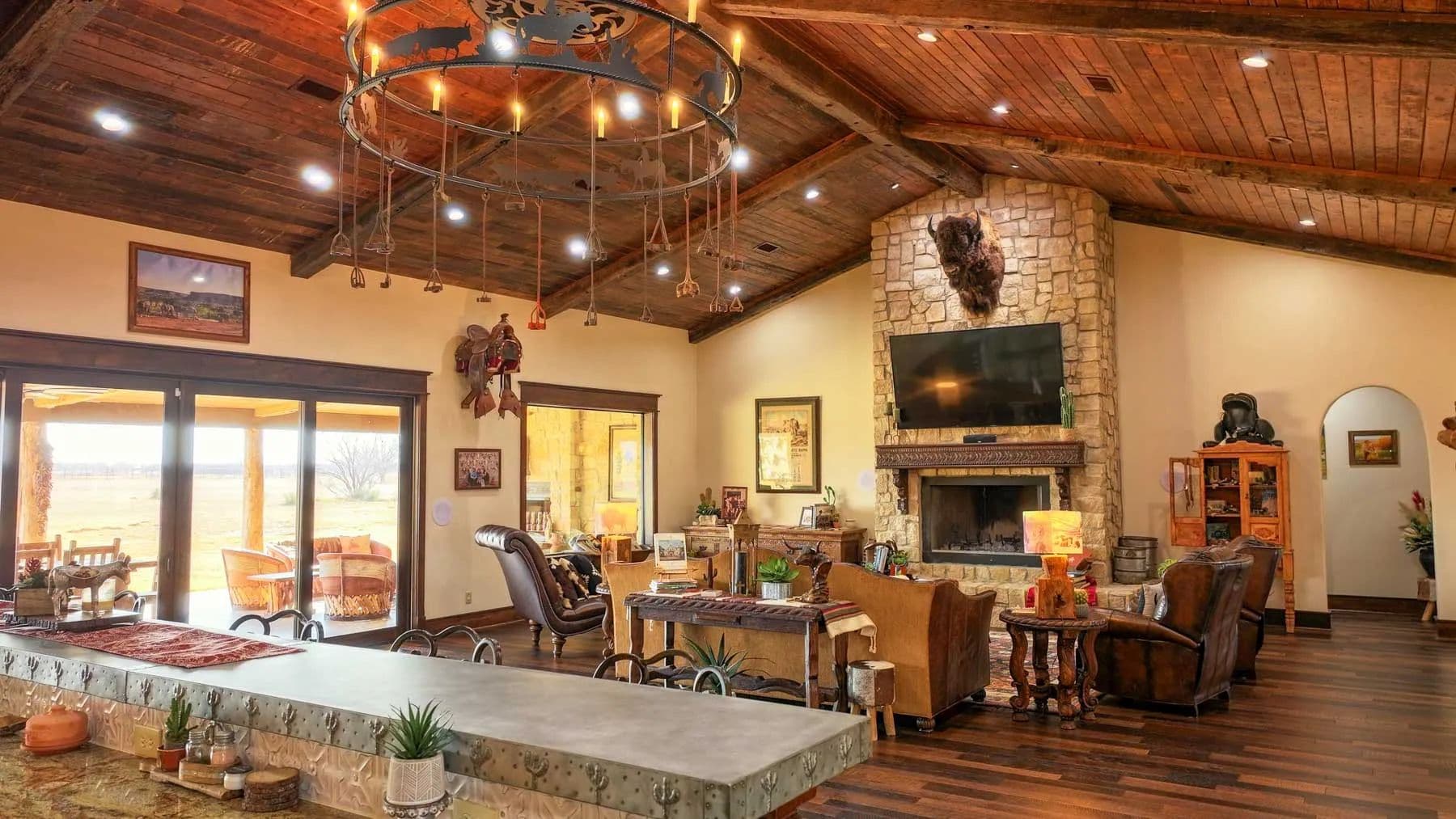 The main house, completed in 2022, spans 8,000+/- square feet and includes four bedrooms, three bathrooms, and luxurious features such as four rock fireplaces, reclaimed wood ceilings, solid oak beams, and a custom bar seating for nine. Practical features include a mudroom, large laundry room, three-car garage, and backup generator. The outdoor entertainment area has a custom grill, smoker, and refrigerator. Additional structures include a fully furnished four-bedroom guesthouse, a horse barn with four stalls, a 330-square-foot tack room, and a 150' x 300' outdoor pipe arena.