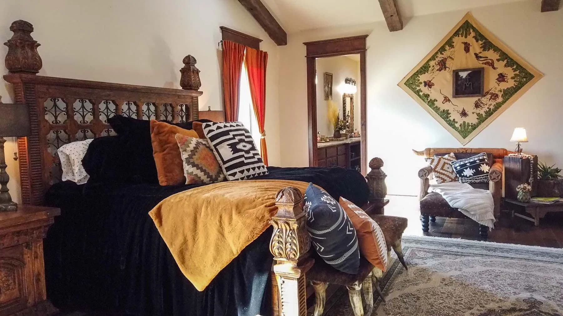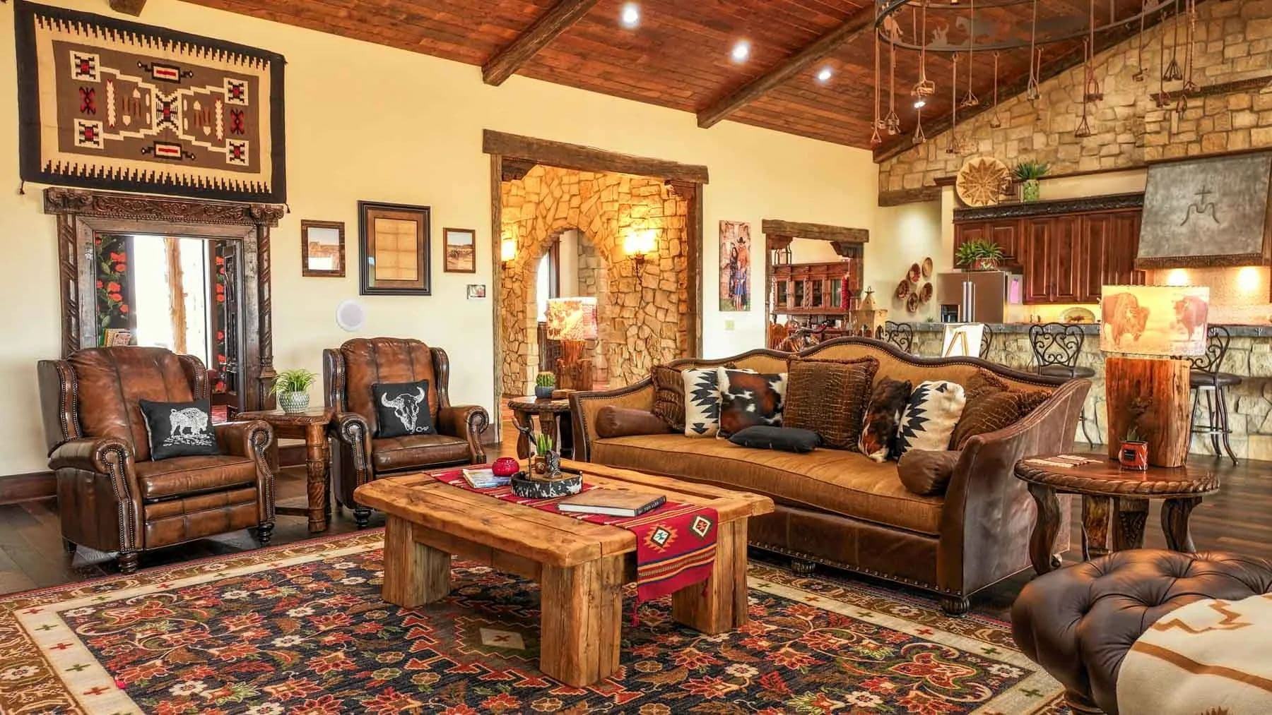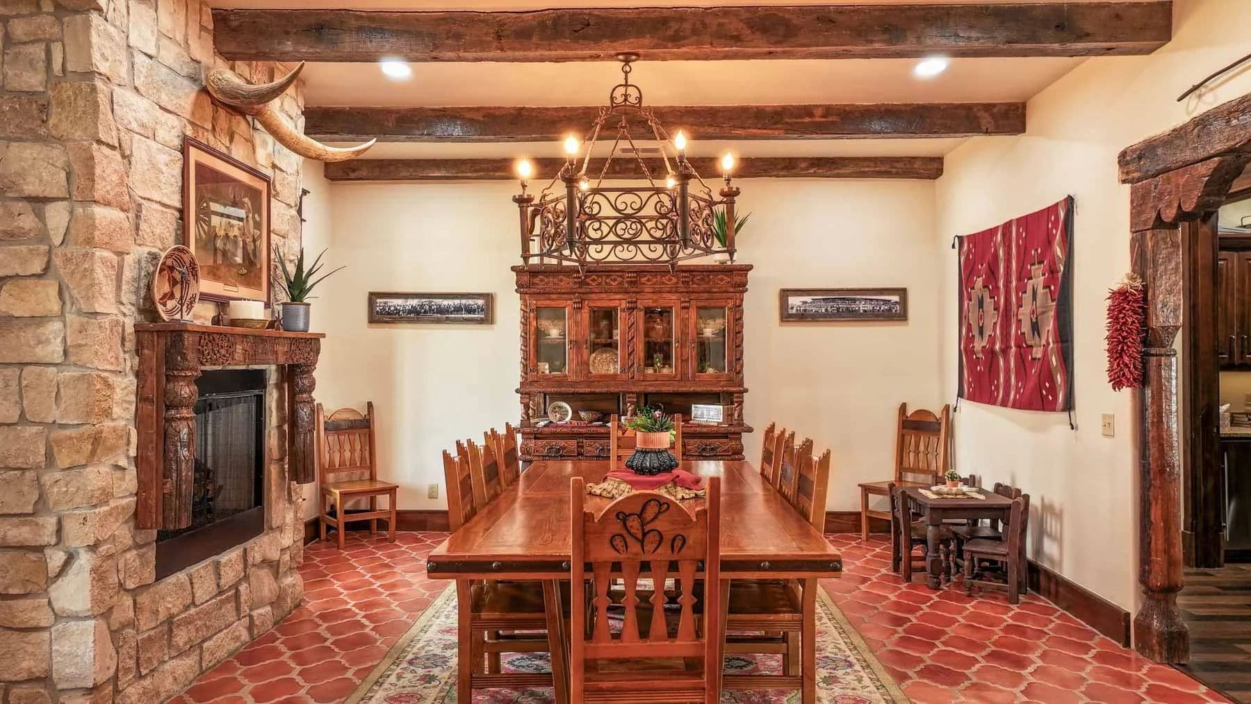 The main house, completed in 2022, spans 8,000+/- square feet and includes four bedrooms, three bathrooms, and luxurious features such as four rock fireplaces, reclaimed wood ceilings, solid oak beams, and a custom bar seating for nine. Practical features include a mudroom, large laundry room, three-car garage, and backup generator. The outdoor entertainment area has a custom grill, smoker, and refrigerator. Additional structures include a fully furnished four-bedroom guesthouse, a horse barn with four stalls, a 330-square-foot tack room, and a 150' x 300' outdoor pipe arena.