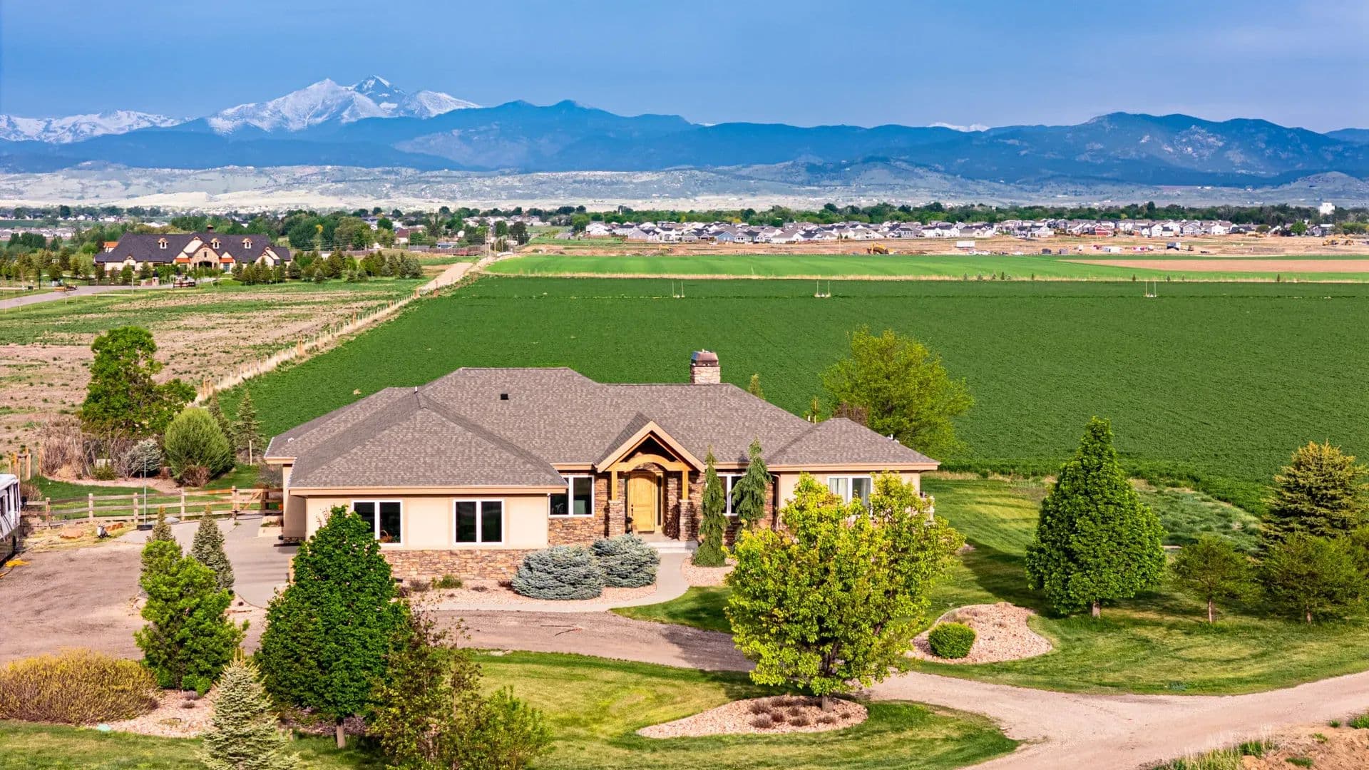 This stunning 77.09-acre property in Berthoud offers a custom 5-bed, 5-bath home with breathtaking mountain views. Featuring expansive agricultural potential, water rights from multiple ditches, and state-of-the-art irrigation, it’s perfect for farming or development alike. With multiple outbuildings, greenhouses, and fertile land, this property is a rare opportunity for investors, farmers, or developers looking to expand operations. Land Spanning 77.09 acres, this parcel offers fertile land for agriculture with water rights from 4 shares of The Handy Ditch Company, 4 shares of The McIntyre Ditch Company, and 1 share from The Loveland Lake and Ditch Company. An underground Netafim irrigation system efficiently distributes water to the fields. The land has supported various crops, including nursery tree seedlings, sorghum, alfalfa, corn, and hemp. The fields can yield approximately 2,800 bales per cutting.