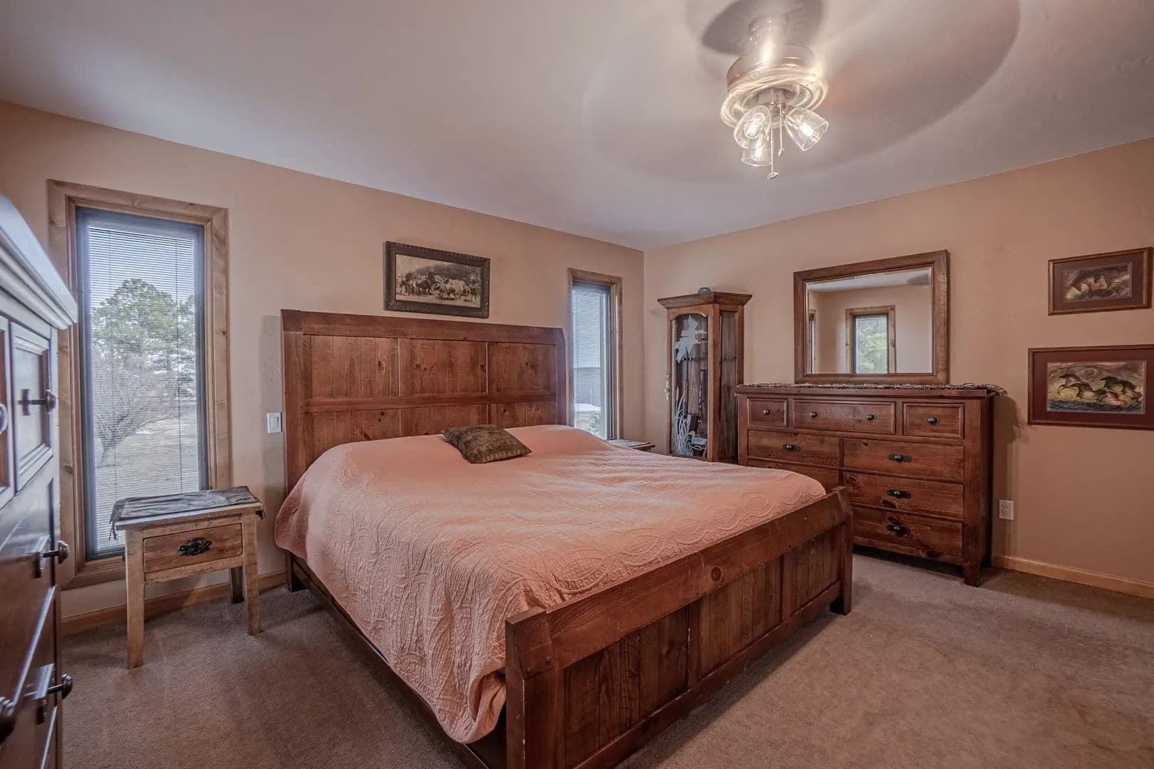 Master Bathroom A luxurious retreat, the master bathroom features a 65” jetted corner whirlpool tub, a large walk-in shower with dual showerheads and a built-in corner bench, a 48” pine vanity with a copper sink, and a deluxe NuTone heat-a-vent system. Heated porcelain tile flooring ensures cozy mornings in any season.