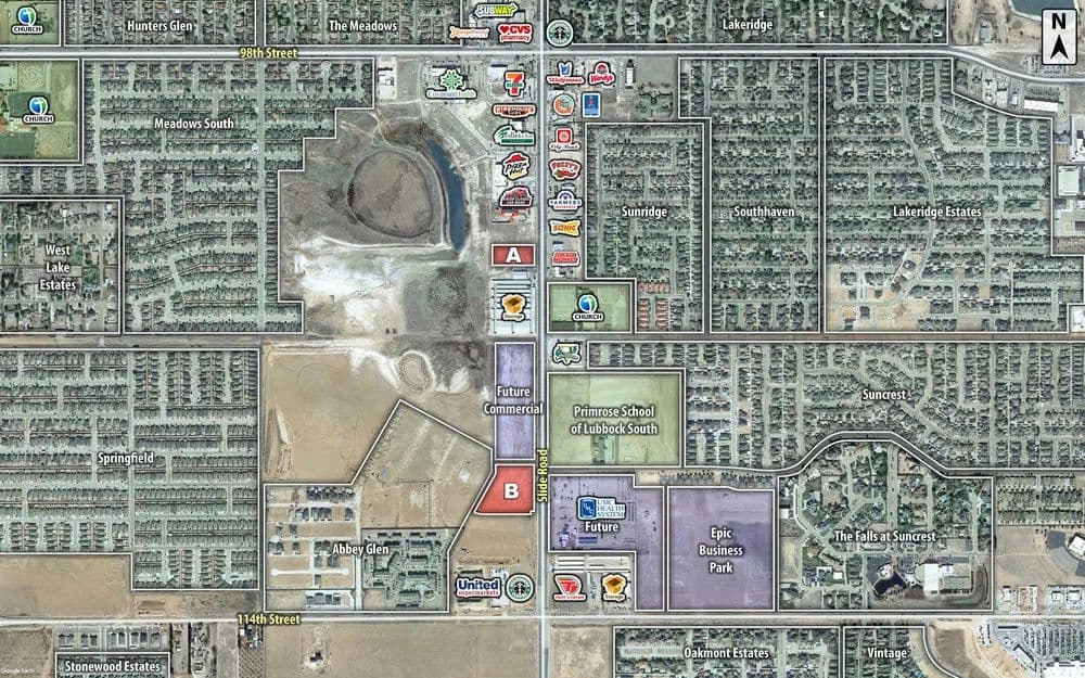 Generous size tracts of land in the heart of growing southwest Lubbock with Slide Road frontage. These four acres are right in the middle of the Slide Road’s growing retail corridor. These sites also have excellent visibility and access. Properties are not in the floodplain. Properties can be subdivided.