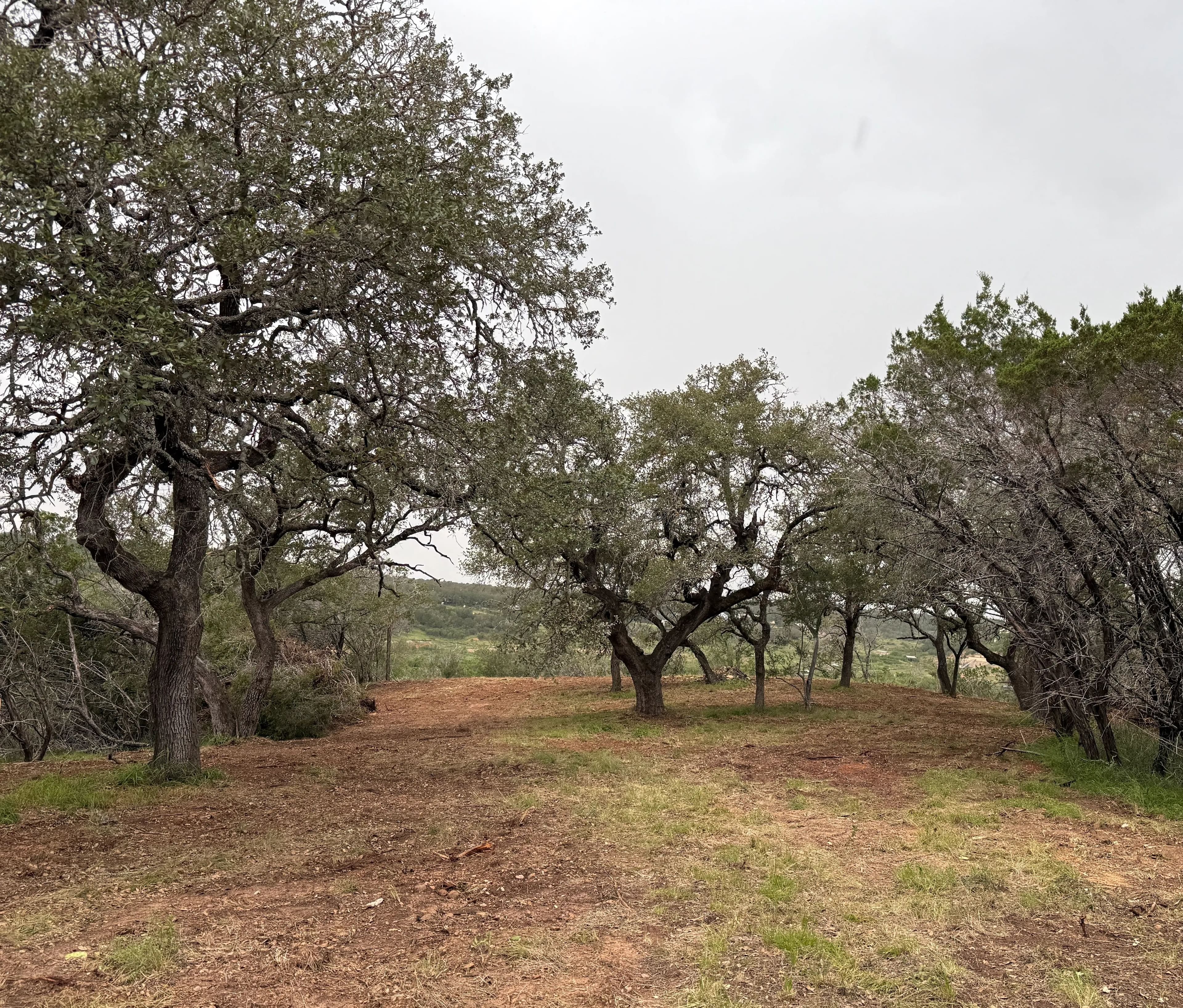 Gently rolling terrain with mature live oak trees offering natural shade and privacy.