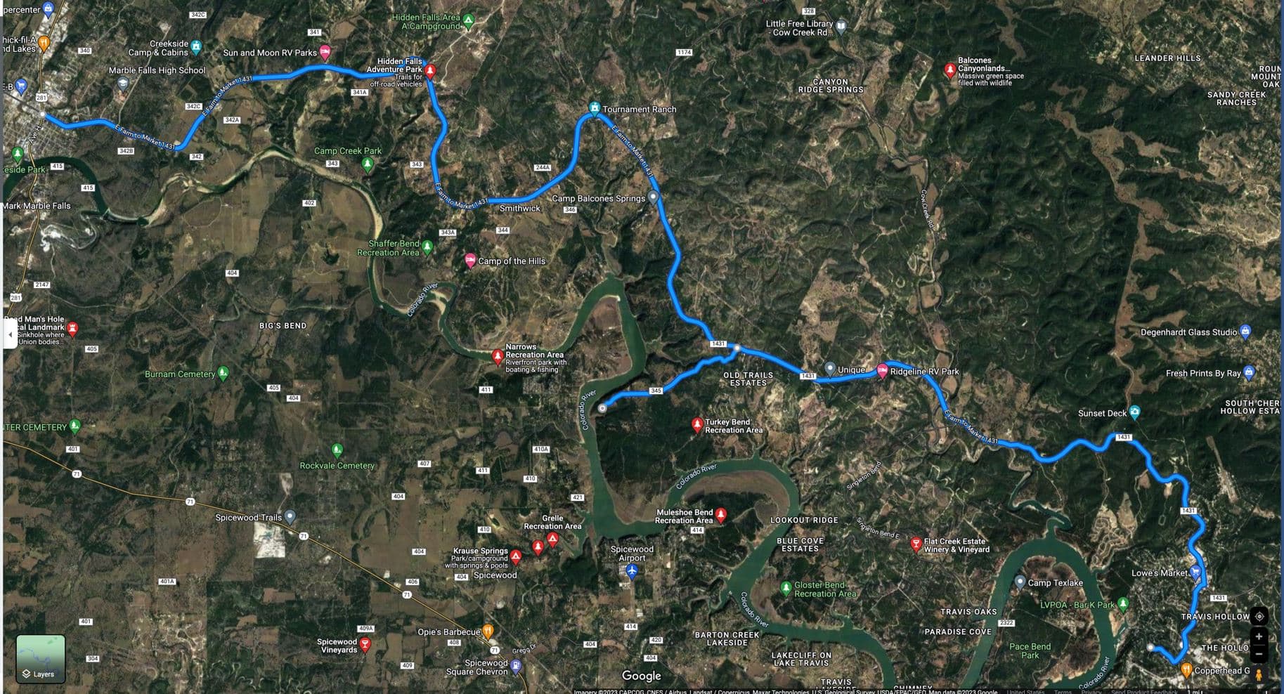 Just off E. Ranch Road 1431 and CR 345 (Boultinghouse Road). Only 45 minutes to Austin and under 10 minutes to both Marble Falls and Lago Vista.