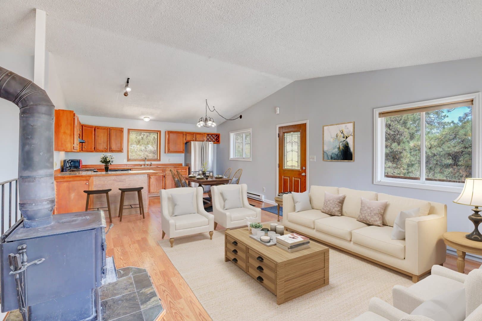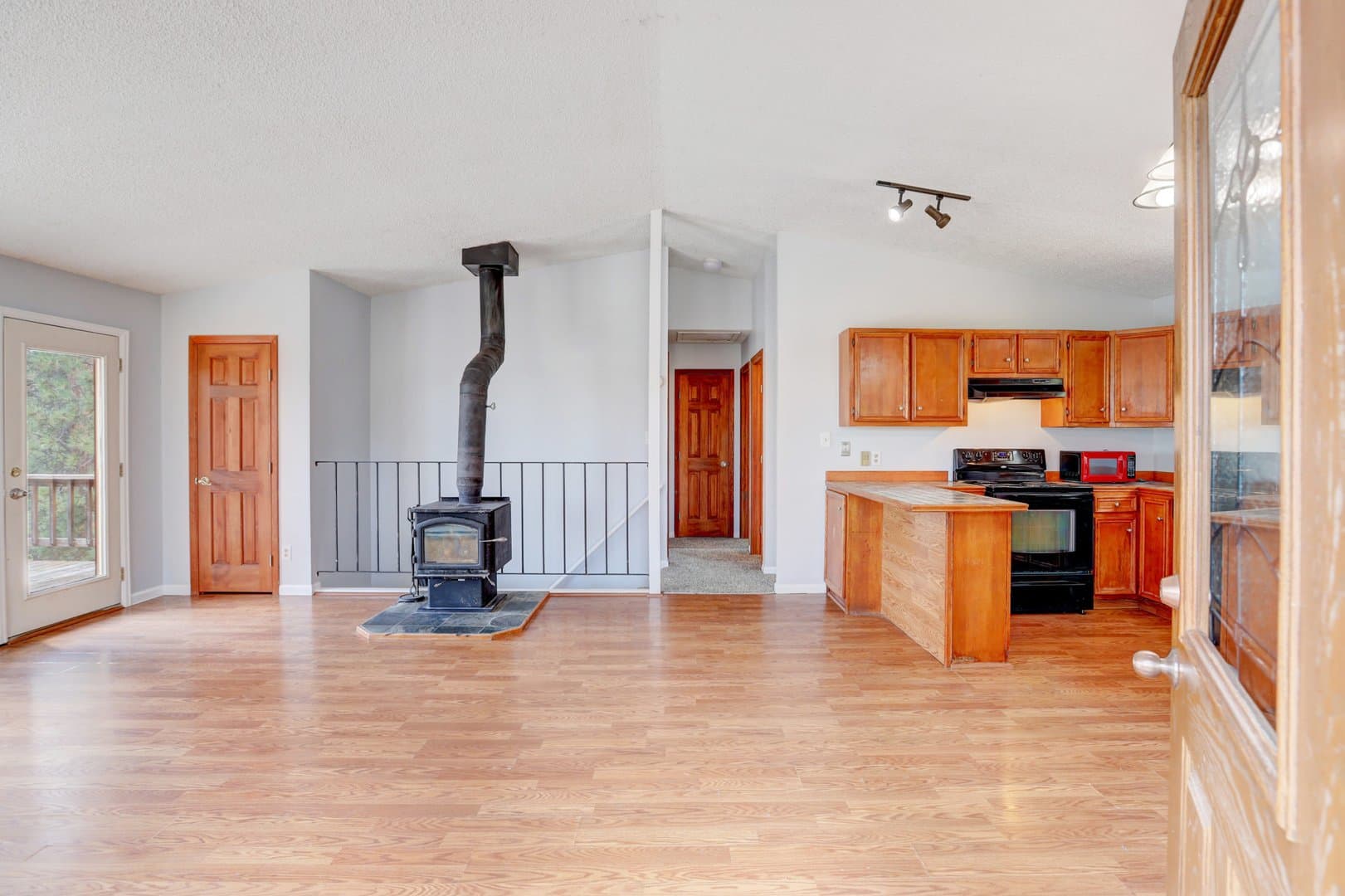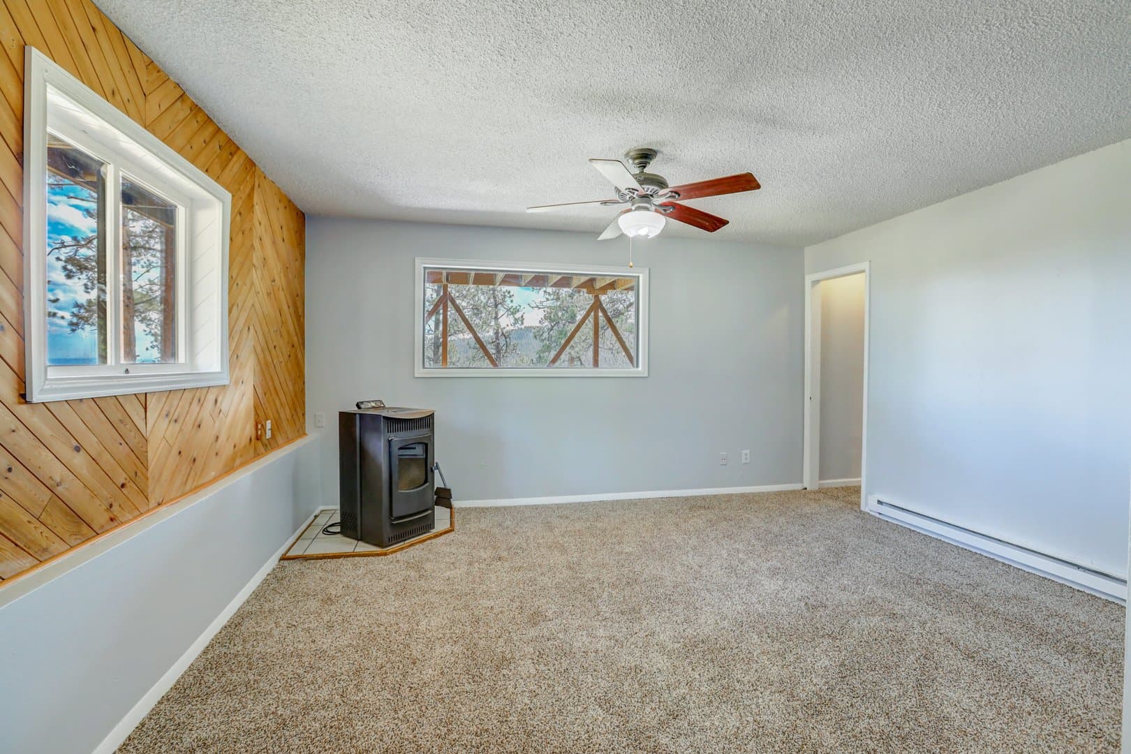 Improvements The cabin was built in 1985 and features over 1750 sf (per assessor) with 3 bedrooms and 2 bathrooms. This wood sided, 2 level cabin has a lower covered deck and open air upper deck with expansive views. The upper floor features and open concept kitchen and living area with vaulted ceilings, wood stove, a full bath, and two guest bedrooms. The Lower Level Master Suite has its own walk out entrance to the lower deck also has its own theatre/sitting room with pellet stove and private en suite with shower and massive jetted tub.