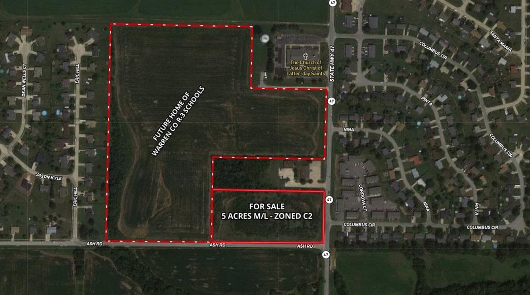 5± acre commercial lot for sale zoned C-2 commercial with a perfect location near new 242 unit apartment complex that has recently been approved and adjacent to Warren County Schools property. The lot has over 1,000 feet of road frontage and a perfect location on North Highway 47 and Ash. The surrounding properties are a mix of established and new build multi-family, and single family homes as well as farmland primed for further development. Great location for retail or self-storage or RV/Boat lot storage. Do not miss this great opportunity to purchase prime commercial acreage. Brand new sidewalks installed 2021-2022. City utilities borders property on 47 and Ash.