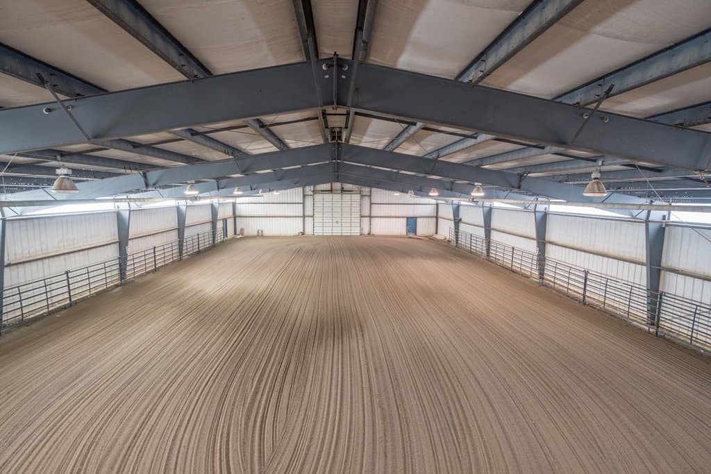 Equestrian Facility, state of the art 80’x200’ steel structure with 80’x 144’ indoor arena with living quarters, overhead radiant heat , Halogen lighting, indoor and/or outdoor wash stations, 6 Preifert Premier horse stalls w/ outdoor runs, tack room, storage/maintenance room, intercom system, ½ bath with laundry, observation deck, and outdoor patio. An optional 160’ x 240’ outdoor arena and separate 68’ round pen for training and warm ups. 7 stock water stations each facilitating multiple paddocks & pastures. Several support buildings & 3 grain bins for equipment, feed, stable bedding, and machinery storage.
