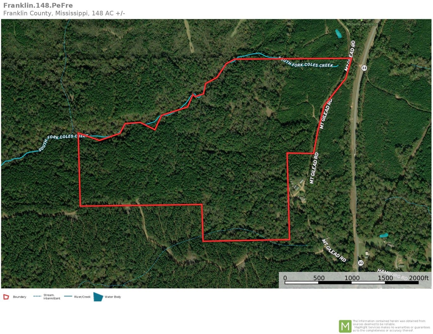 Franklin County, MS +/-148 Acres- Rolling hills with older pine timber with hardwood along the creek and hollows. Good deer and turkey hunting. Extensive interior roads/trails to access all parts of the property. Road frontage along Mt. Gilead Rd with utilities available. Highest and best use: Timber investment and recreation.