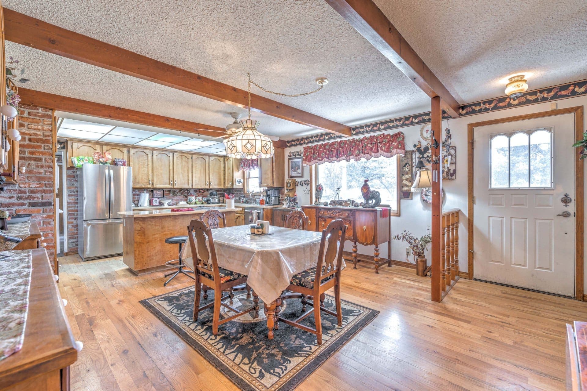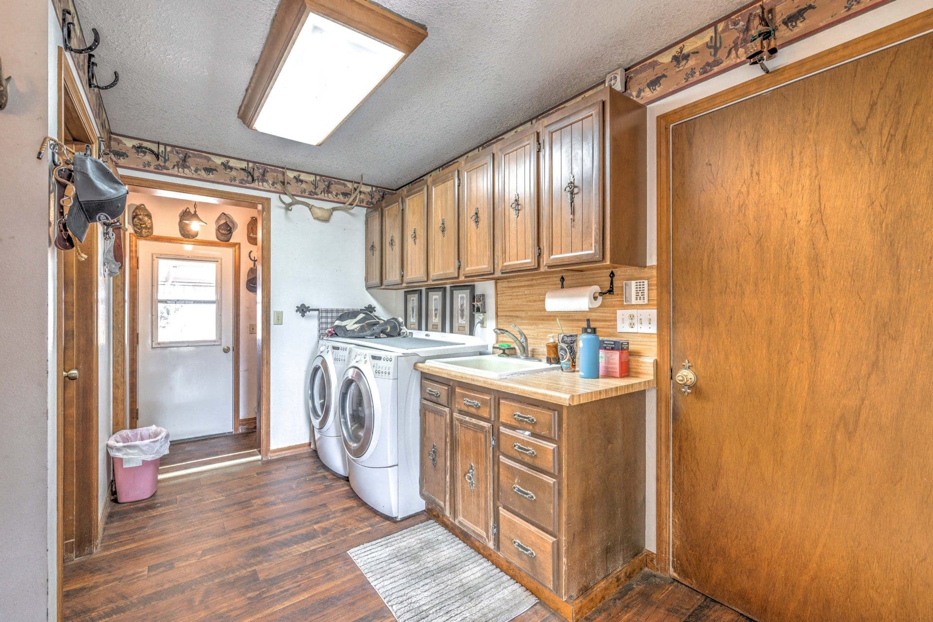 The custom two-story farmhouse was constructed in 1980 and features three bedrooms, two offices (which could serve as additional bedrooms), and three bathrooms. Additional housing includes a modest bunkhouse, perfect for ranch/farm hand housing.