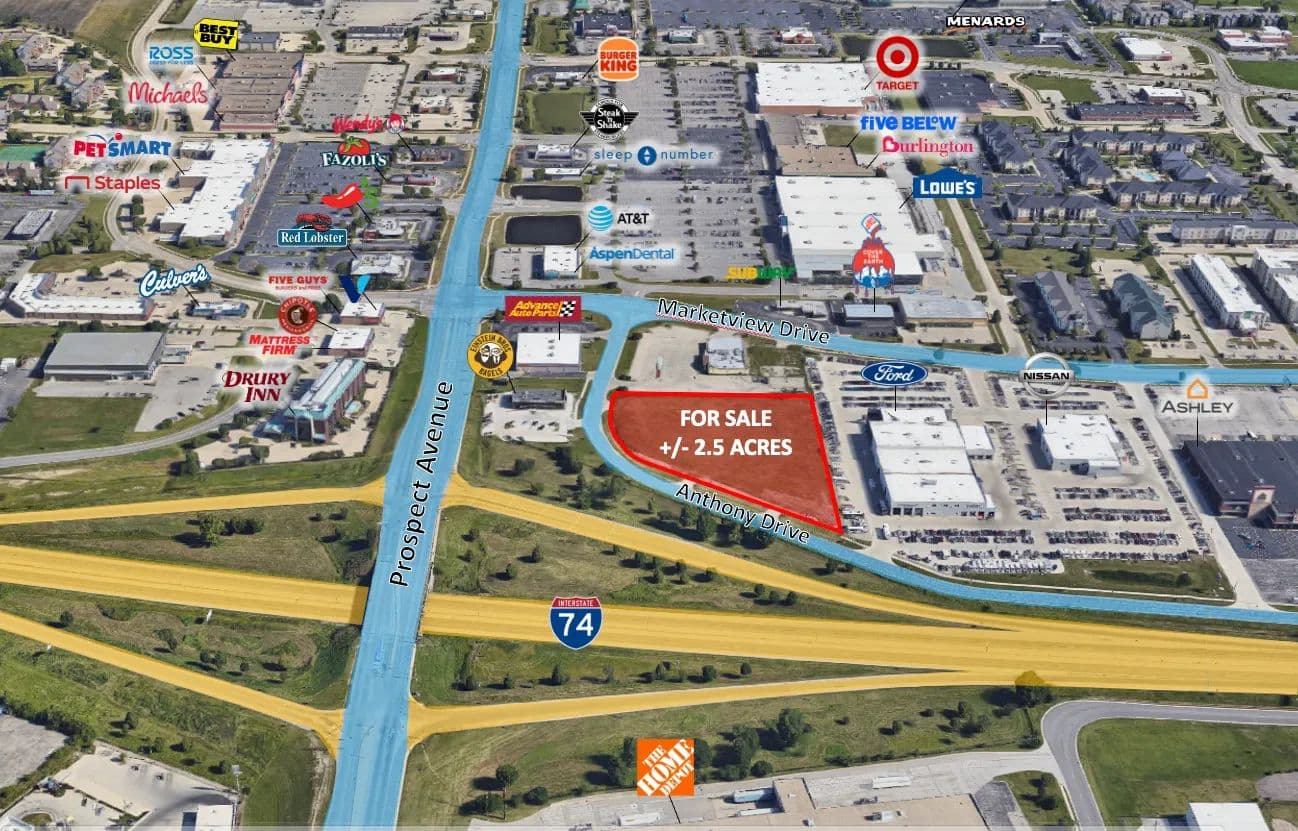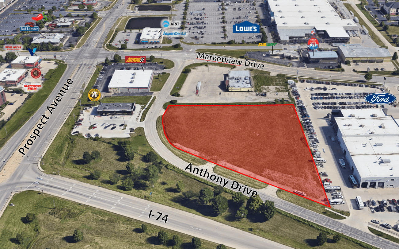 Incredible development site within the North Prospect / North Neil Retail Corridor. This +/- 2.502 acre site is zoned CG – Commercial General and ready for immediate development with all utilities to the site. The site benefits from three curb cuts along Anthony Drive, tremendous visibility and easy accessibility from I-74 and Prospect Avenue and is one of the few remaining development sites of this size and character in the area, which is the primary regional retail corridor in the market.