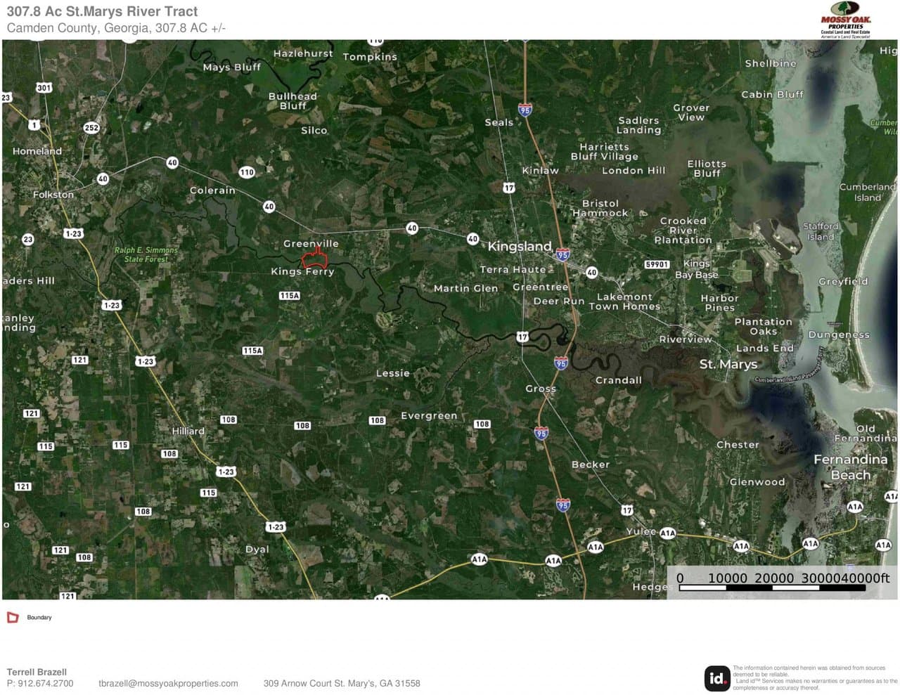 Rare opportunity to own 307 Acres with more than a mile of frontage on the St.Marys River in Kingsland, GA. The property is just west of the City of Kingsland on the river directly across from Kings Ferry and The White Oak Conservation Center on the Florida Side. The property would make a great Private Retreat for hunting and outdoor recreation or potential for future higher and better investment tract. Approximately 56+/- Acres of recently re-planted pine and the balance of the property has a mix of Hardwood, Oaks and Mature Pine Islands. There is a main road that runs through the middle of property and with a few smaller trails around. The property is not currently enrolled in any CUVA or Conservation Easements of any kind and presents a lot of opportunity for conservation projects. Excellent Deer, Turkey and Duck hunting opportunities. Great Weekend Getaway, Cabin Site or Private Country Estate. This property is only 35 minutes to the Jacksonville Fl International Airport, 40 Minutes to FLETC / Brunswick, GA and St.Simons Island, GA. 20 Minutes to Kings Bay Naval Submarine Base / St.Marys, GA. 10 Minutes to Kingsland, GA with Schools, Shopping, Dinning and I-95 Access. Riverfront Property for Sale. Georgia River Front Land for Sale. Land for Sale. For more information contact Terrell Brazell with Mossy Oak Properties for more information at 912-674-2700 or