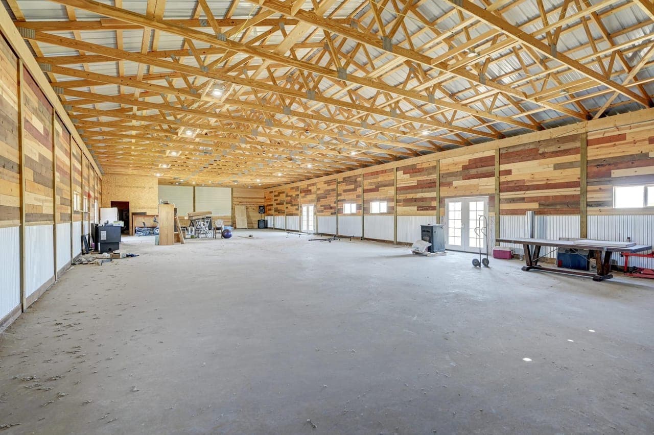 Continuing down this rectangular shaped property is a large 90' x 45', multi-use building that is finished with barn-wood interior and gable ceiling.