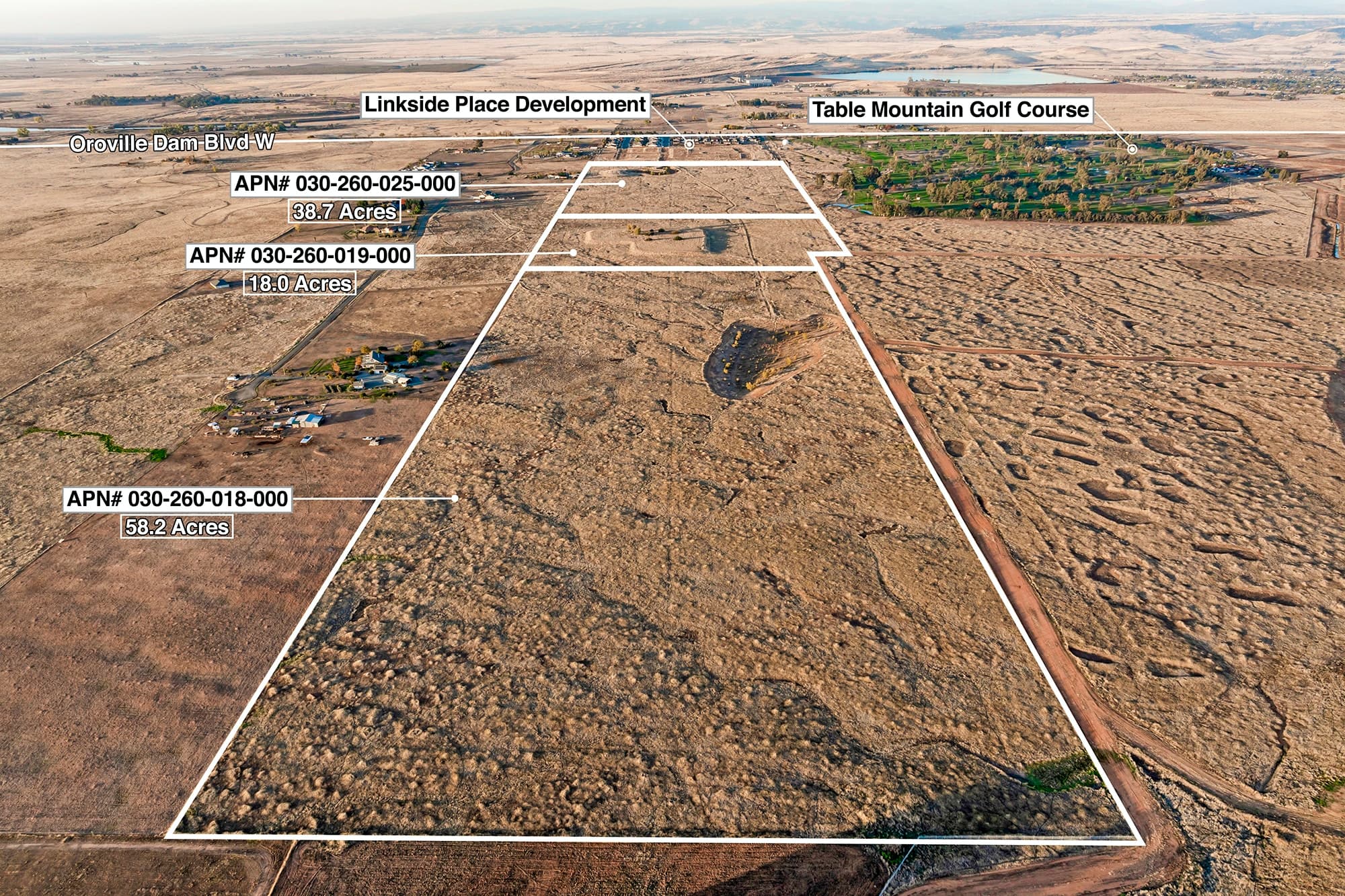 PRIME DEVELOPMENT POTENTIAL with this 115+/- ACRE land tract! Land touches both the City Limits of Oroville as well as the 18 Hole Table Mountain Golf Course just to the east. To the north, this property touches the current Linkside Place Development Phase II project. The original Linkside Place Phase I sits furthest north bordering Oro Dam Blvd which was completed just recently consisting of 65 finished homes that once sat on right around 18 acres prior to its city annexation and development. This prime property consists of the following 3 legal parcels: AP#030-160-019 at 18.08+/- Acres, AP#030-260-025 at 38.79 Acres & AP#030-260-018 at 58.24+/- Acres. If location is your thing, a portion of this property spans 2,200+/- feet along the golf course. Just a little over 1,000 feet to the west of this land sits the “Prior City Approved 421 Acre Oro Bay Development” where the city approved the Development Plan which was to consist of 2,400+/- homes back in October of 2010; development plan has since went un-executed upon and expired. With Oroville’s quickly expanding population, multiple new apartment developments, and a need for decent housing developments, this 115+/- acres sit in the path and right in the line of future development opportunities. Just south of Oro Dam Blvd the area's main thoroughfare between Highway 99 and Highway 70. 4 miles into the town of Oroville, 25 miles north to Chico, Ca and right around 70 miles north Sacramento. Oroville sits at the base of the Sierra Nevadas and is home to Lake Oroville & The Feather River. As well as the sprawling Afterbay Recreation area just west of these parcels. Currently Zoned RR5; which is the same zoning that was approved prior by the city with the “Oro Bay Development Project Proposal” just over. Power, water & sewer stop at Linkside Place Phase I. Perfect 1031 Replacement, Land Bank Holding, or property for the individual with capital and the mindset to make things happen! Owner May Finance A Large Amount; Submit Proposal For Seller Consideration. Priced at just over $28,500 per acre!