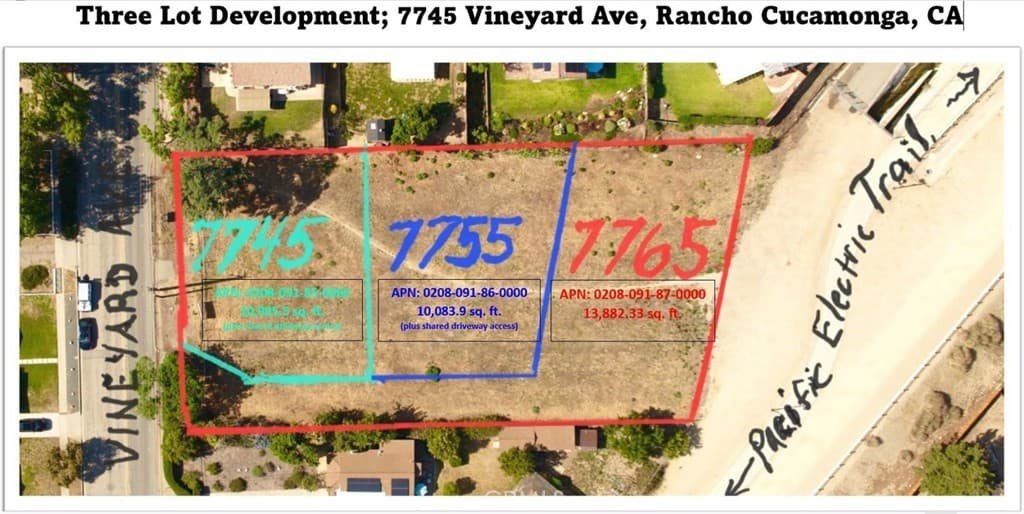 This Value Added Parcel is the BACK LOT of Three of the Best Residential Parcels in Rancho Cucamonga! This fully-entitled, three lot subdivision boasts three nearly level, large lots (see also MLS listings for 0208-09-185-0000 and 0208-09-186-0000; each lot exceeds 10,000 sq. ft. and they average over one quarter acre each). The location is superb for family living, for high-quality rental properties, and for optimizing unit count using ADU's. This parcel is adjacent to the Pacific Electric Trail, on Vineyard Ave. north of Foothill Blvd, and a very short walk from Red Hill Park. The City of Rancho Cucamonga has been advised to expect ADU's on each lot, per all discussions to date. Each lot has house plans (prepared, but not yet submitted), and the proposed unit distribution is for a Main Home (~ 2,400 sf), a Jr. ADU (~ 500 sf), and a detached ADU (~ 1,200 sf) on EACH LOT. This project is ideal for "Build to Rent" investment purposes (see projected rents in notes below), or building the Main Home for oneself and renting the ADU's. Many development steps are complete - Approved Parcel Map (subdivision done), Survey, Rough Grading, Soils Report, House Plans, Street Improvement Plans, Performance Bond, and more. The City of Rancho Cucamonga has expressed general verbal agreement to the development plan as broadly outlined. Sellers relocating in 2024. All the above documentation and reports available to the best Buyer/Builder as needed. This nearly flat, approximately rectangular 13,882 sq. ft. vacant lot is the Pacific Electric Trail adjacent lot of the three, with the shared driveway (approx. 3,580 sq. ft.) included in the parcel square footage. The two above referenced adjacent lots may also access their parcels by the shared driveway (which is at least 20 feet wide). If the above noted unit mix were built as suggested (Main, ADU, and JADU), the current comparable rents on each unit would be $3,700, $2,700, and $1,600 respectively (based on average rents in Rancho Cucamonga). This rent configuration would yield $8,000 per month and $96,000 per year ON EACH LOT in gross rents. Future rent increases would obviously result in even higher rent yields in years to come. Serious inquiries only. DISCLOSURE: Listing Agent related to sellers.