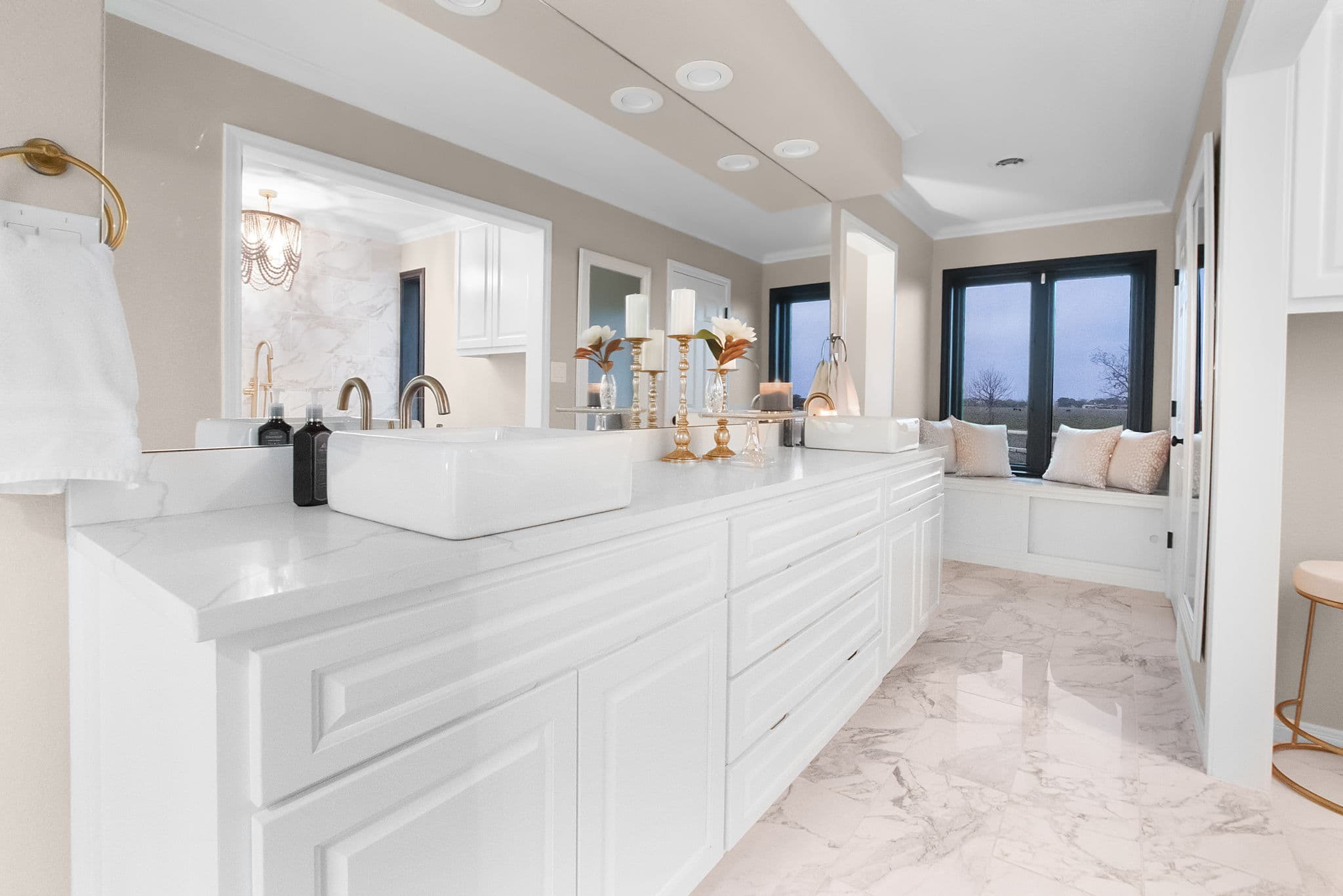 His and Her sinks with new gold faucets that flow into vessel sinks
