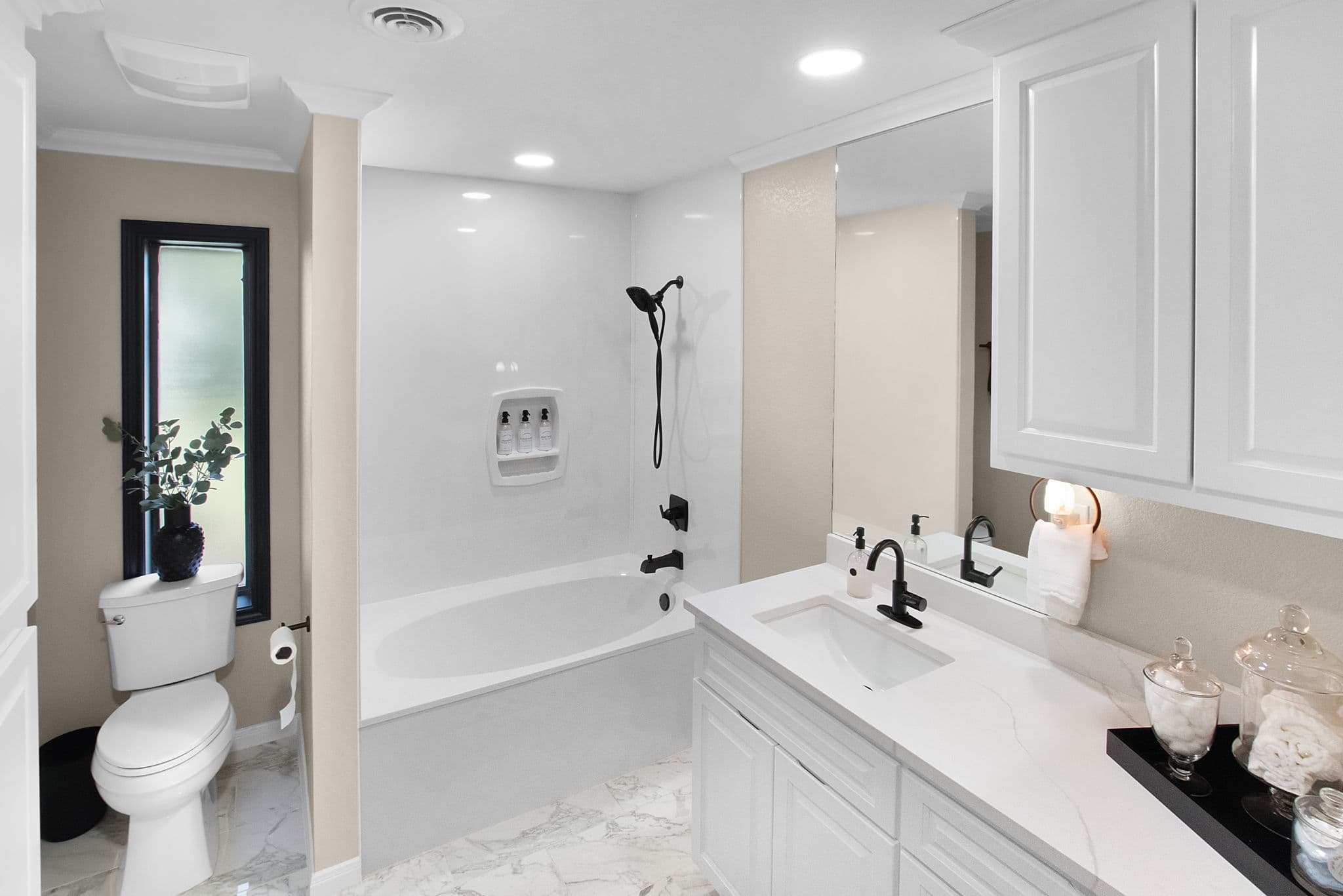 The two full baths feature new fixtures, beautiful marble tile flooring with custom cabinets and storage