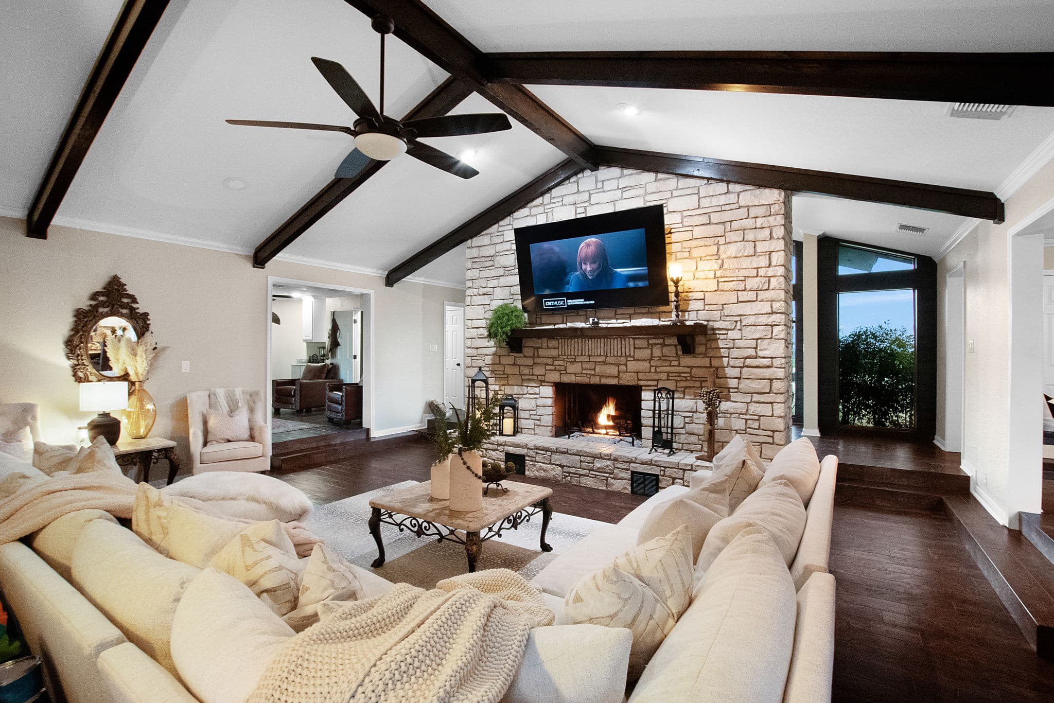 Custom wooden beams were built and added for vaulted ceiling in the living room