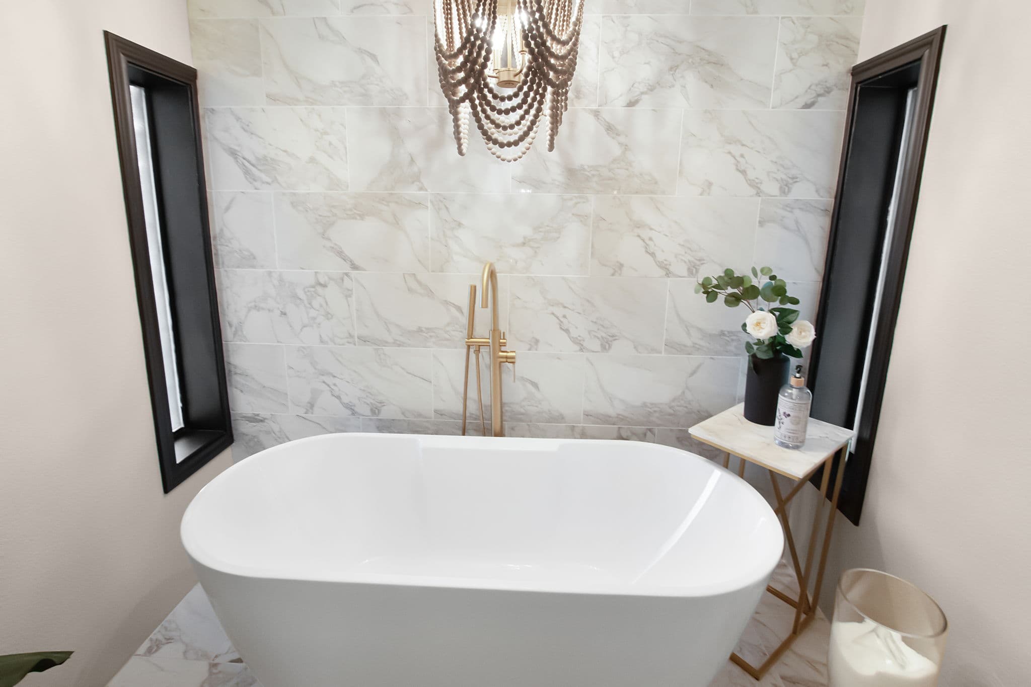 Master bathroom has marble tile from floor to ceiling behind the free-standing bathtub