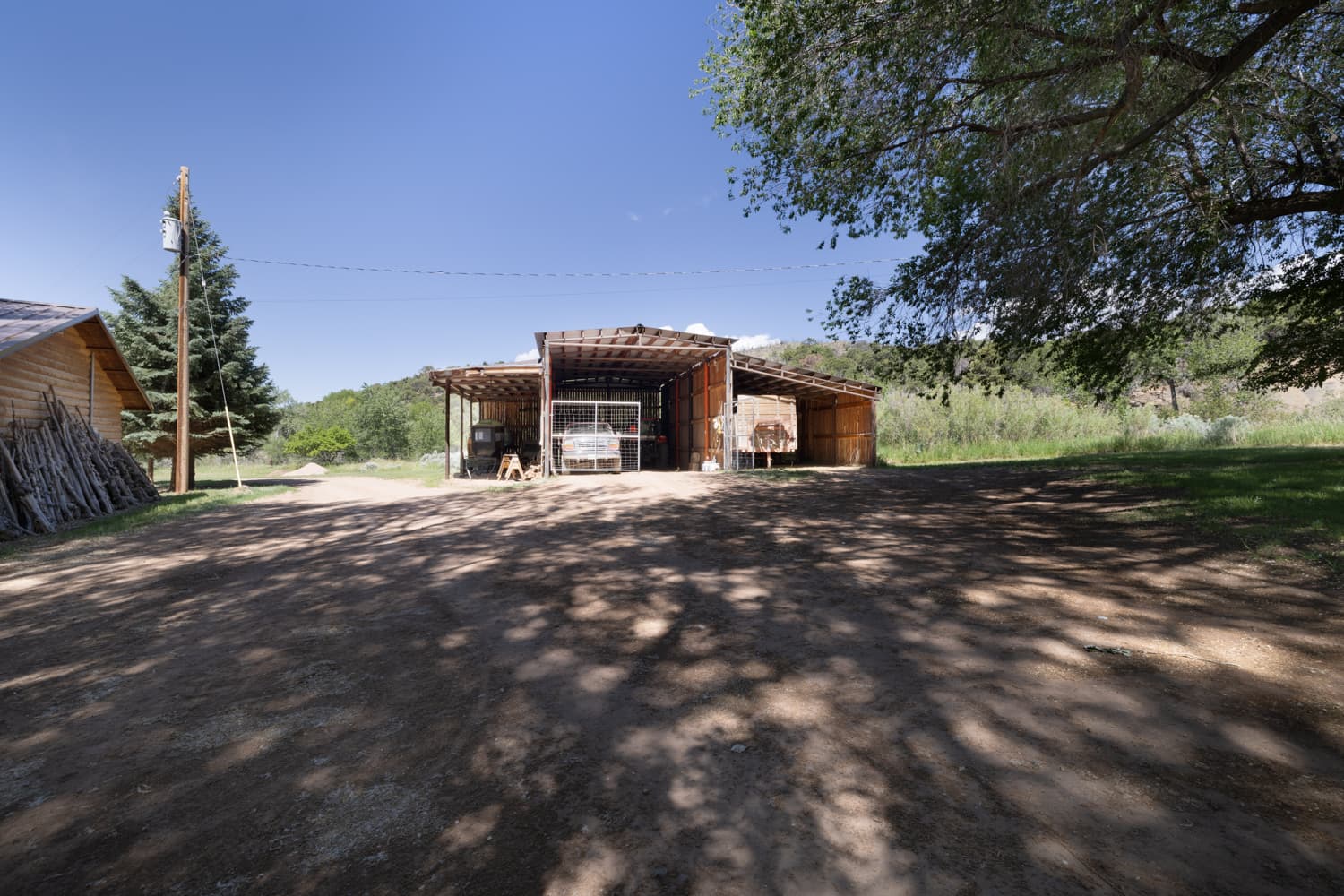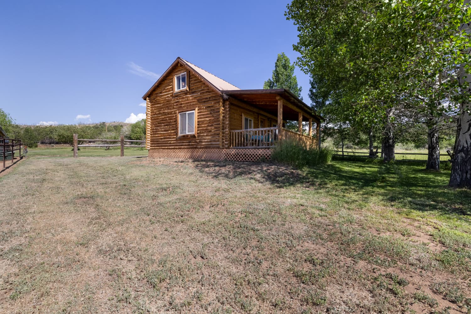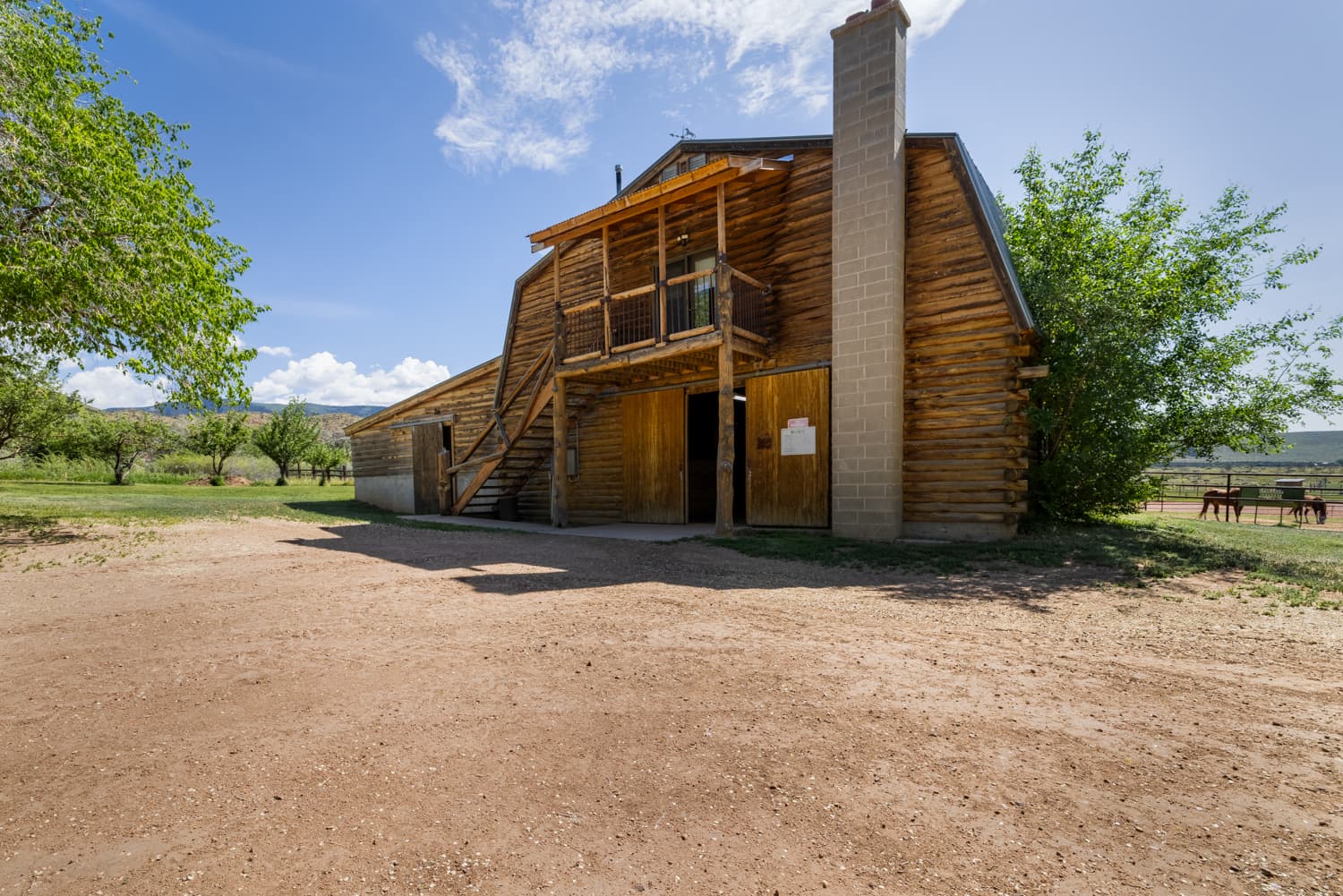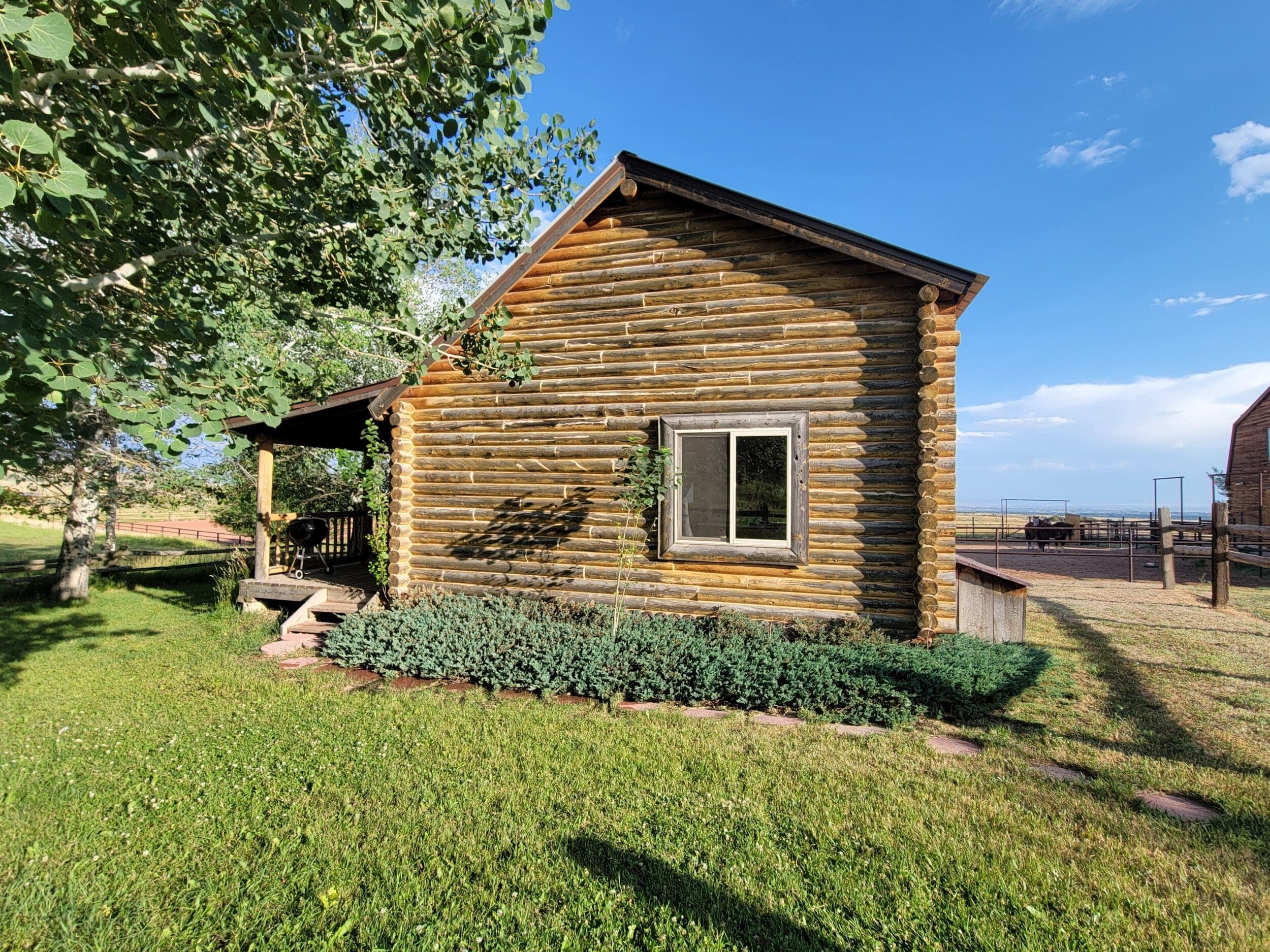 Next door to the barn is a sweet Log Guest Cabin with a shady front porch surrounded by Aspen trees, that overlook the pasture and mountains. It has a downstairs queen size bedroom with a sleeping loft. The sitting room and kitchen are open and cozy, with a propane heater for winter. The full bath has been recently remodeled. This cabin has been very popular with Airbnb rentals and is income producing. A controlled tributary of the Whiterocks river meanders through the entire north end of the property.