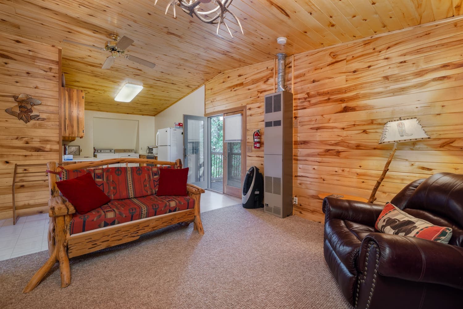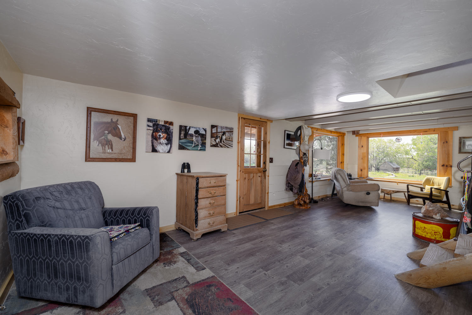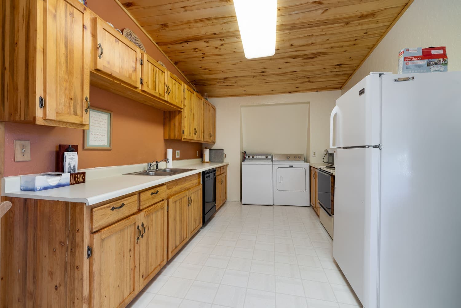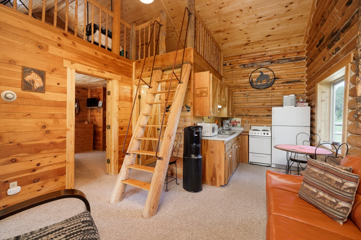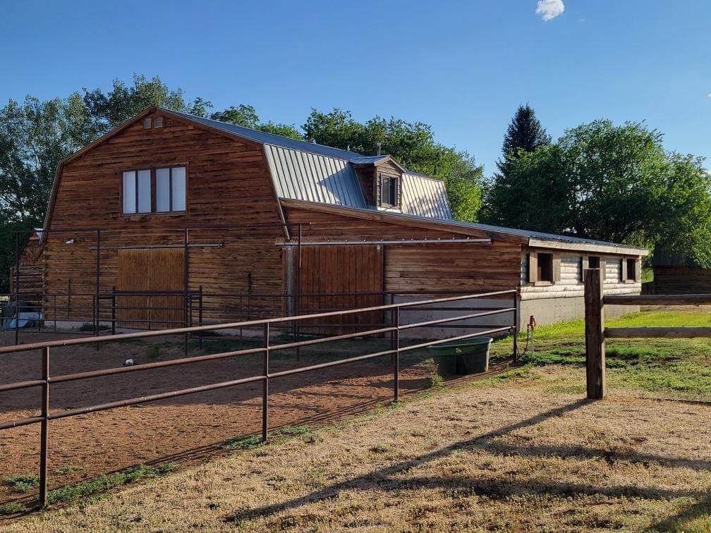 Above the barn is a three Bedroom Apartment with Living Room, full bath with shower. The Aspen wood vaulted ceilings in the living room and the main bedroom give the cabin a great western feel. The kitchen is well equipped with refrigerator, dishwasher, electric stove and laundry area.
