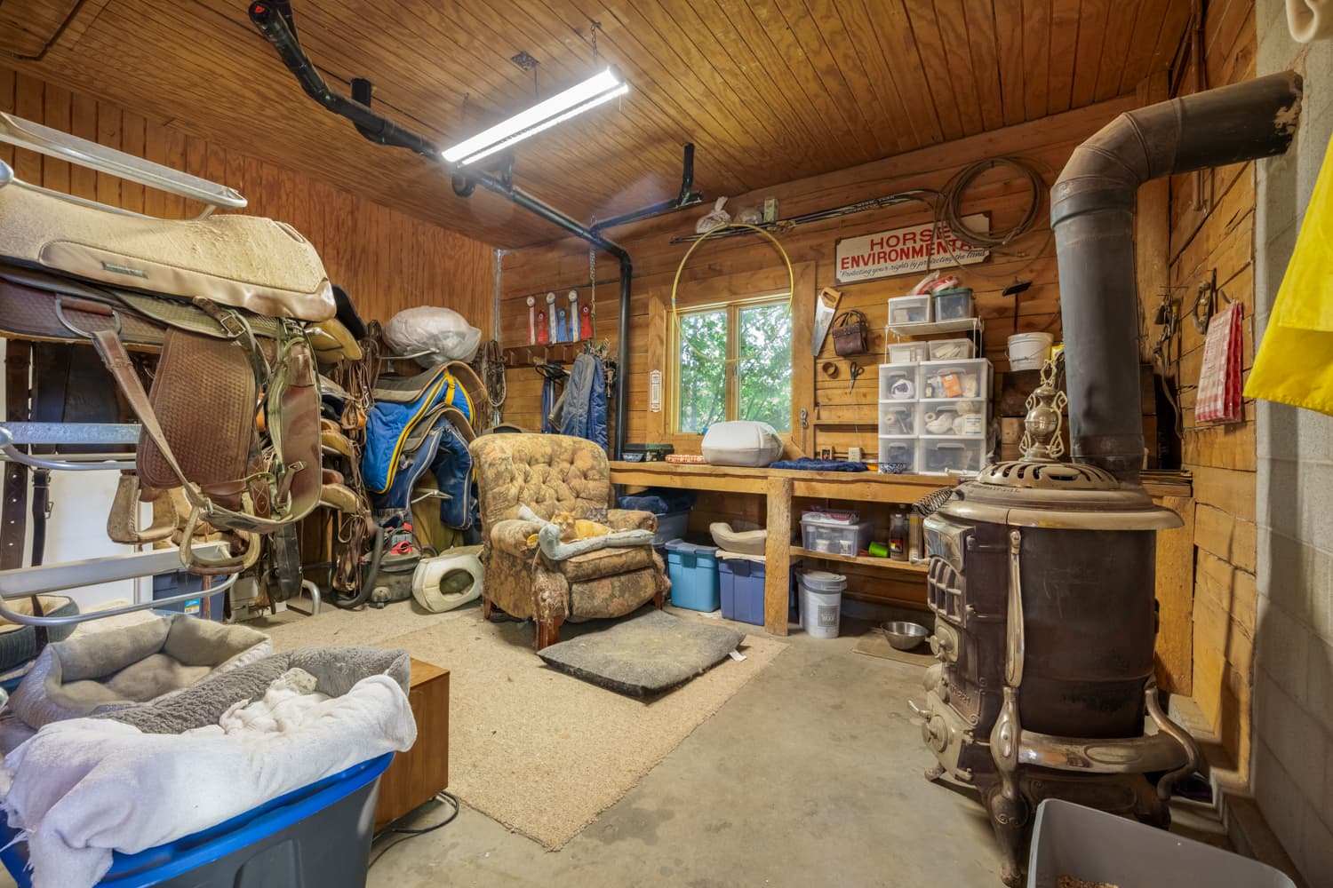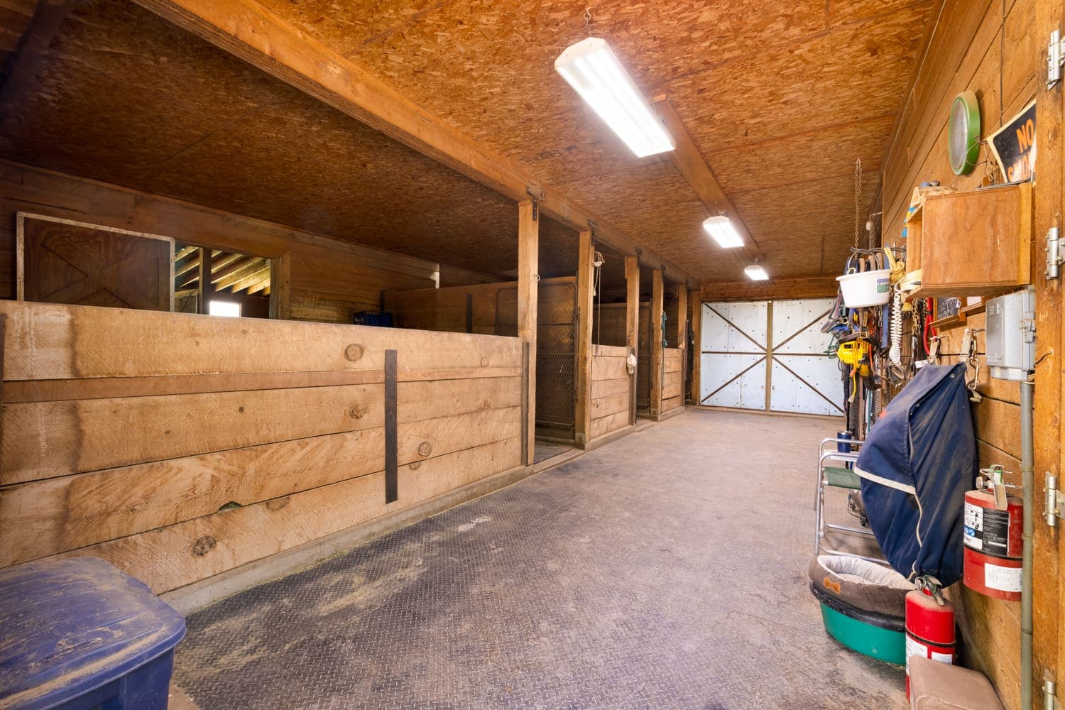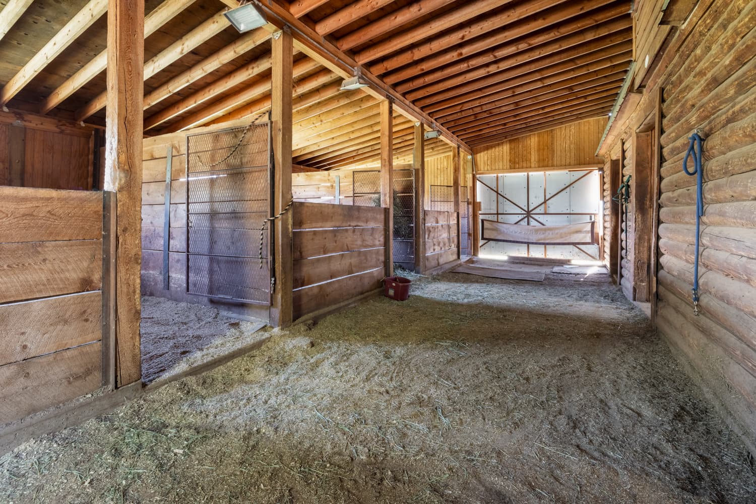 Improvements There is a six stall Log Horse Barn with tack room, feed room and shower stall with hot and cold water. The stalls and main aisle way are rubber matted. The 2nd aisle has a dirt floor that can be used as a small indoor turnout during inclement weather. The barn stays cool in summer and warm in winter.