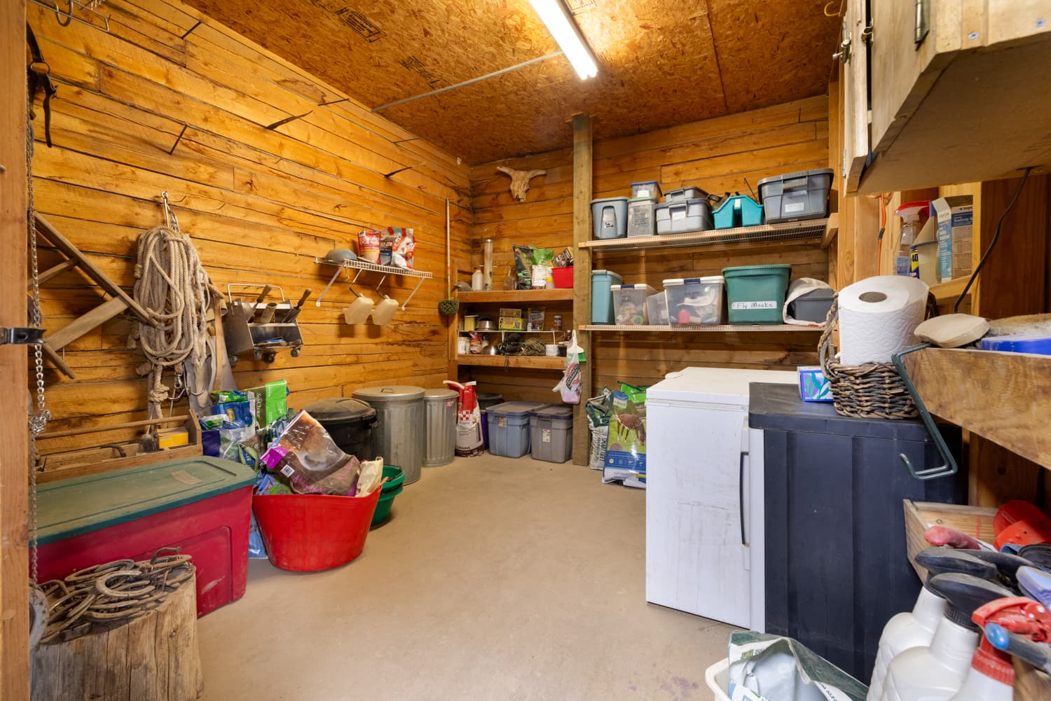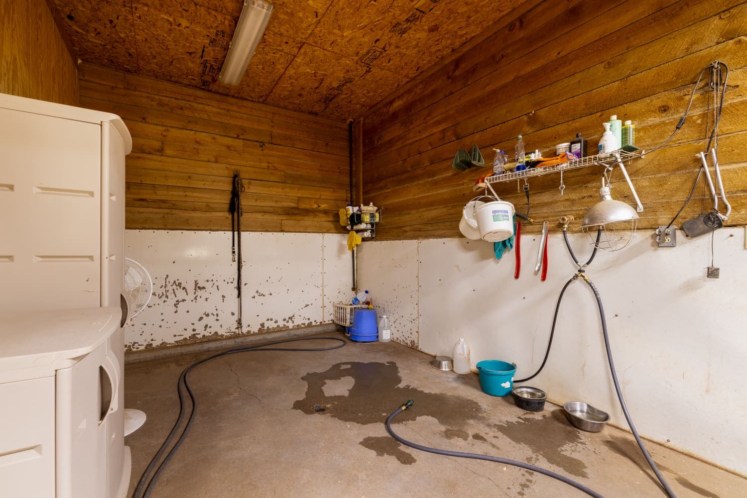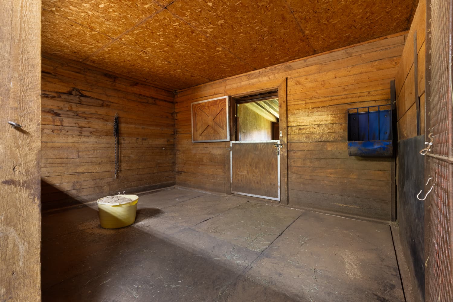 Improvements There is a six stall Log Horse Barn with tack room, feed room and shower stall with hot and cold water. The stalls and main aisle way are rubber matted. The 2nd aisle has a dirt floor that can be used as a small indoor turnout during inclement weather. The barn stays cool in summer and warm in winter.