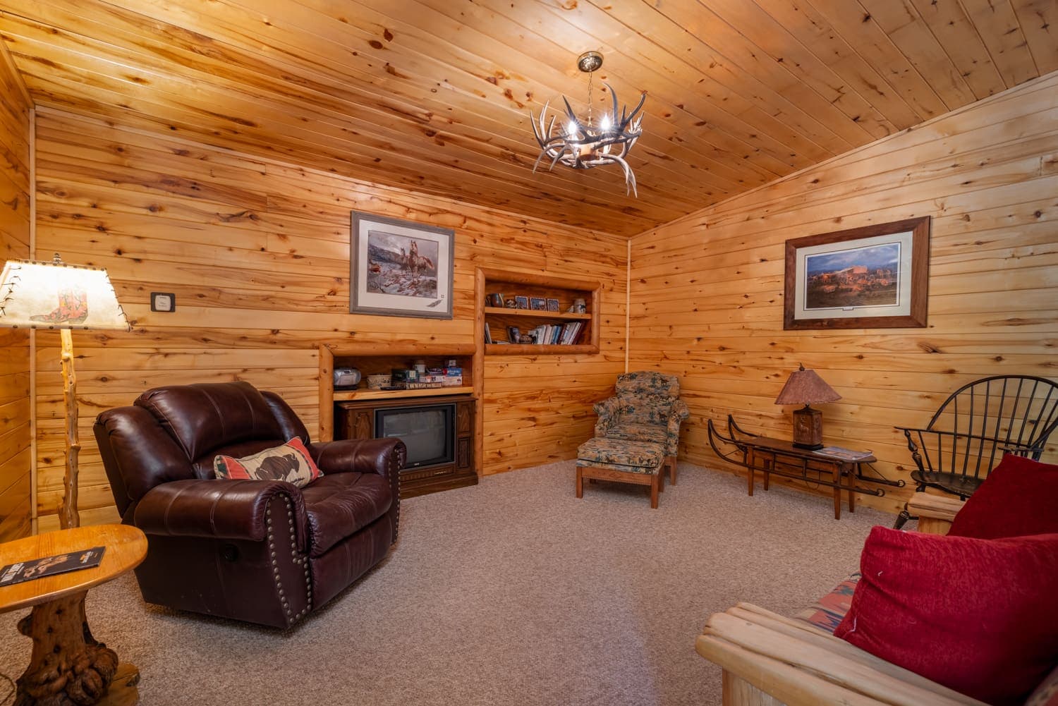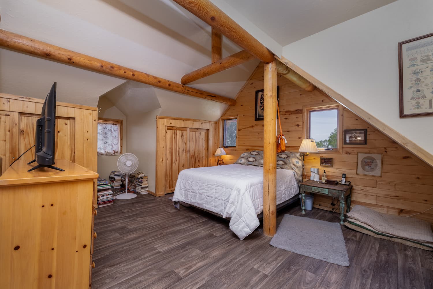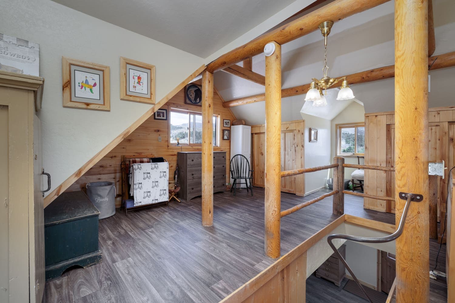 The upstairs is one large bedroom/sitting area with vaulted ceiling, Aspen wood and Log beams. The floor has recently been updated with laminate wood flooring. There is a large deck out the French doors with a great view of the mountains. Very secluded setting with no neighbors in sight!