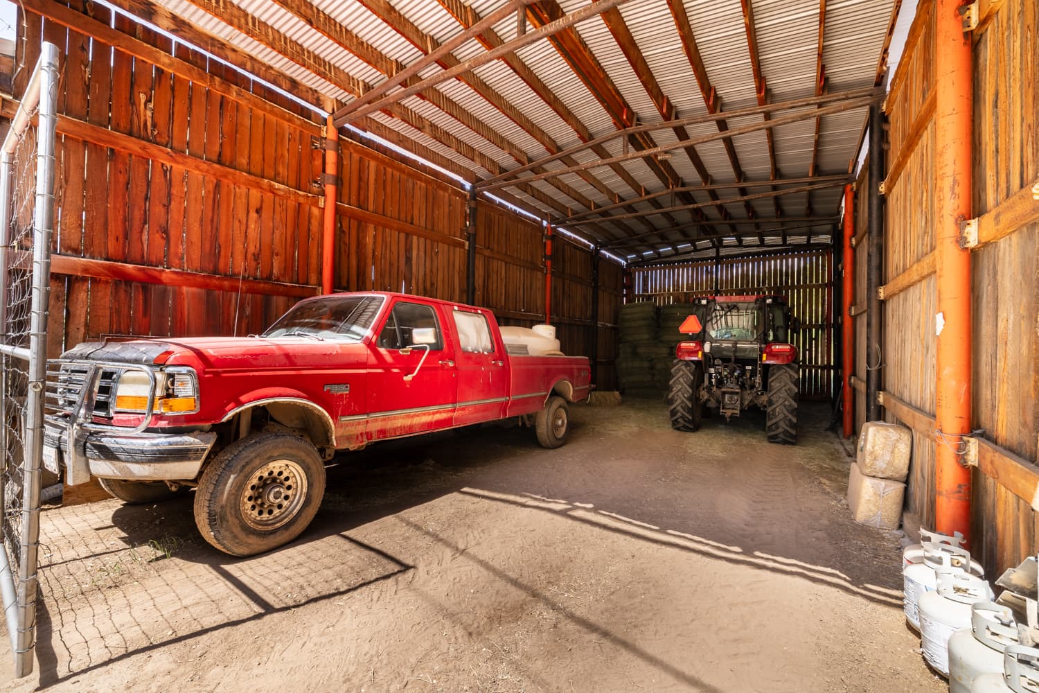 A large metal horse run-in barn or equipment storage barn is on the far East side