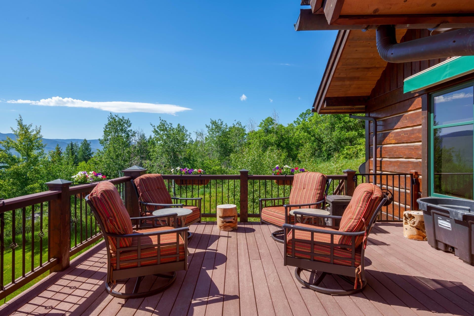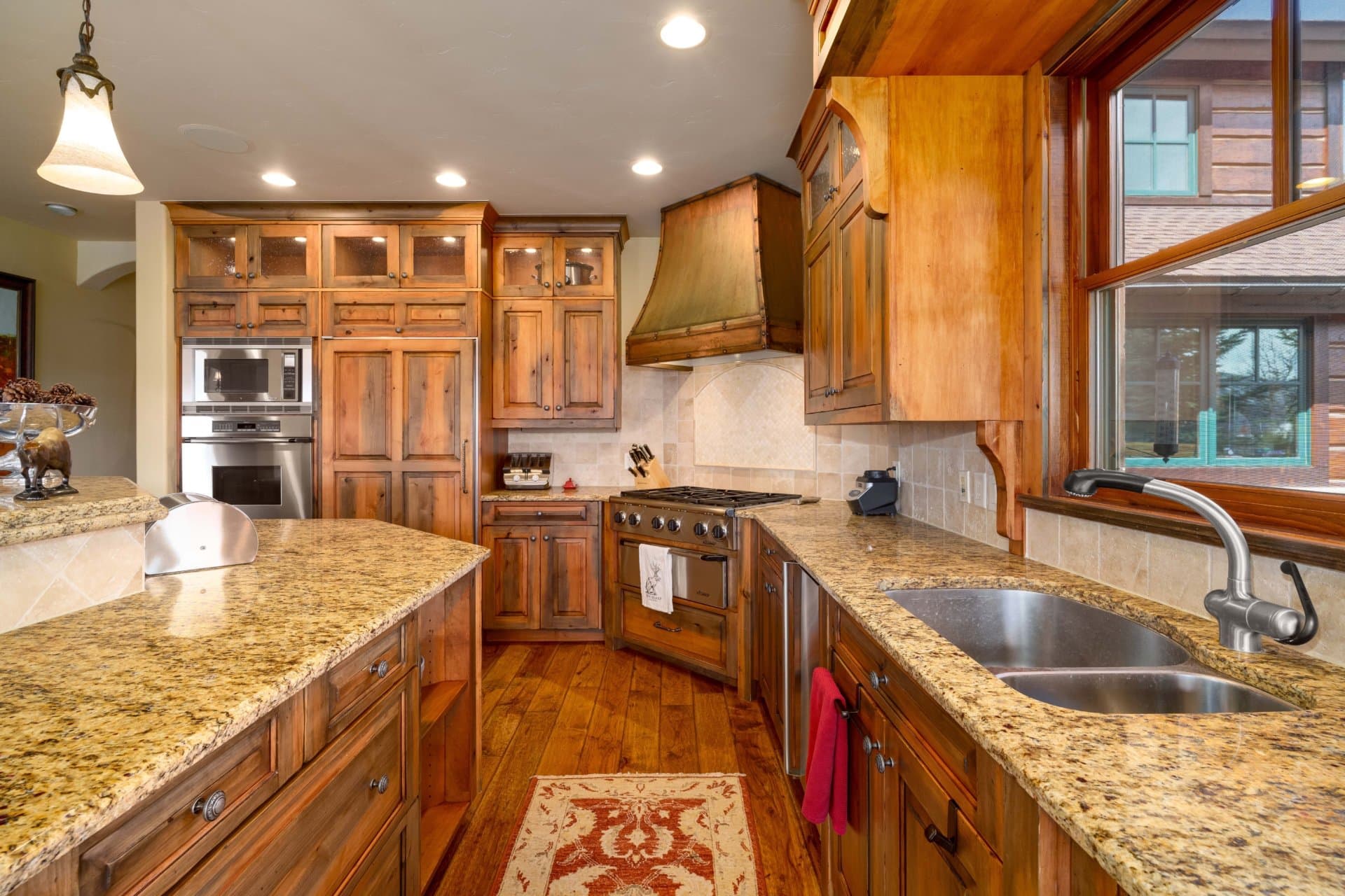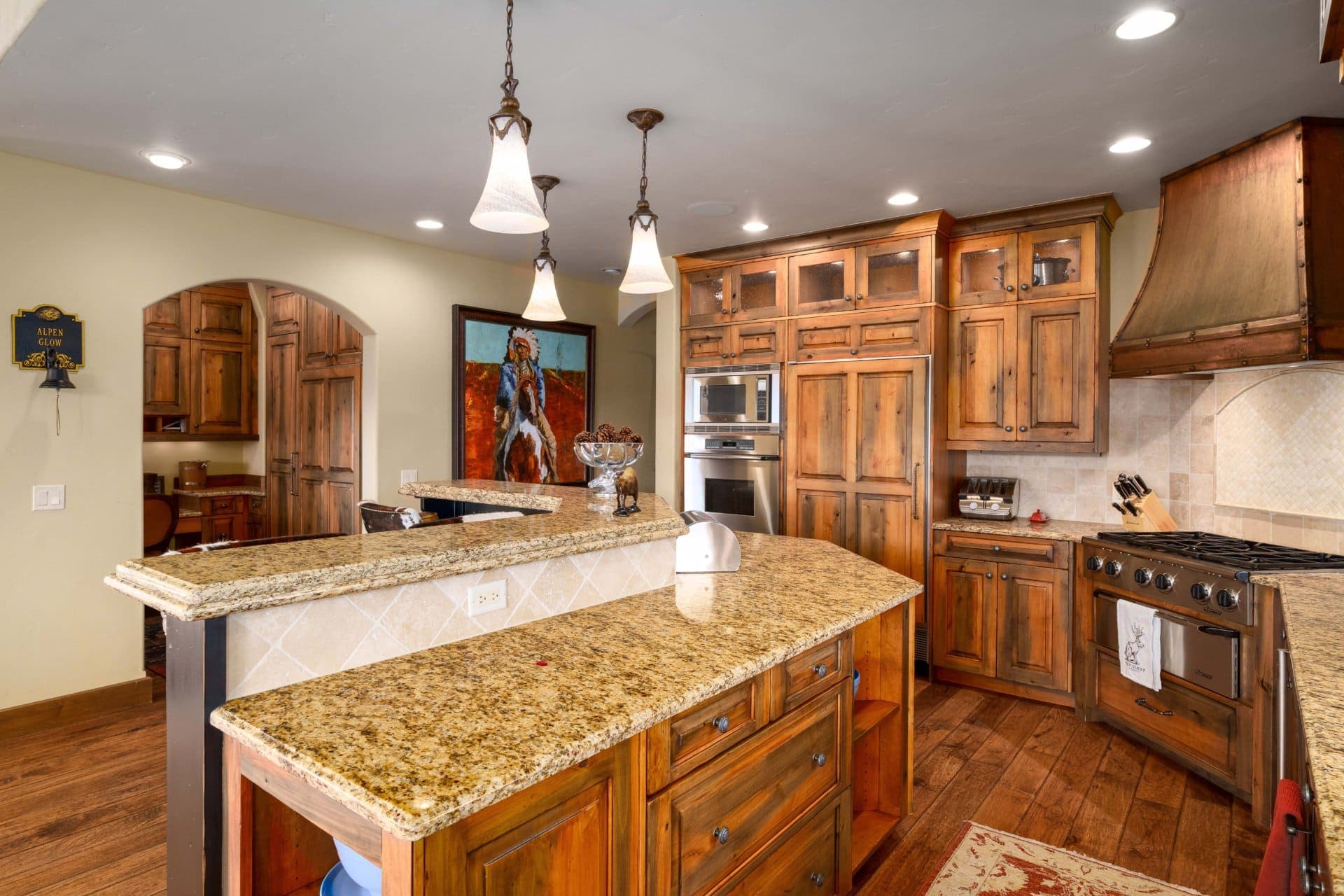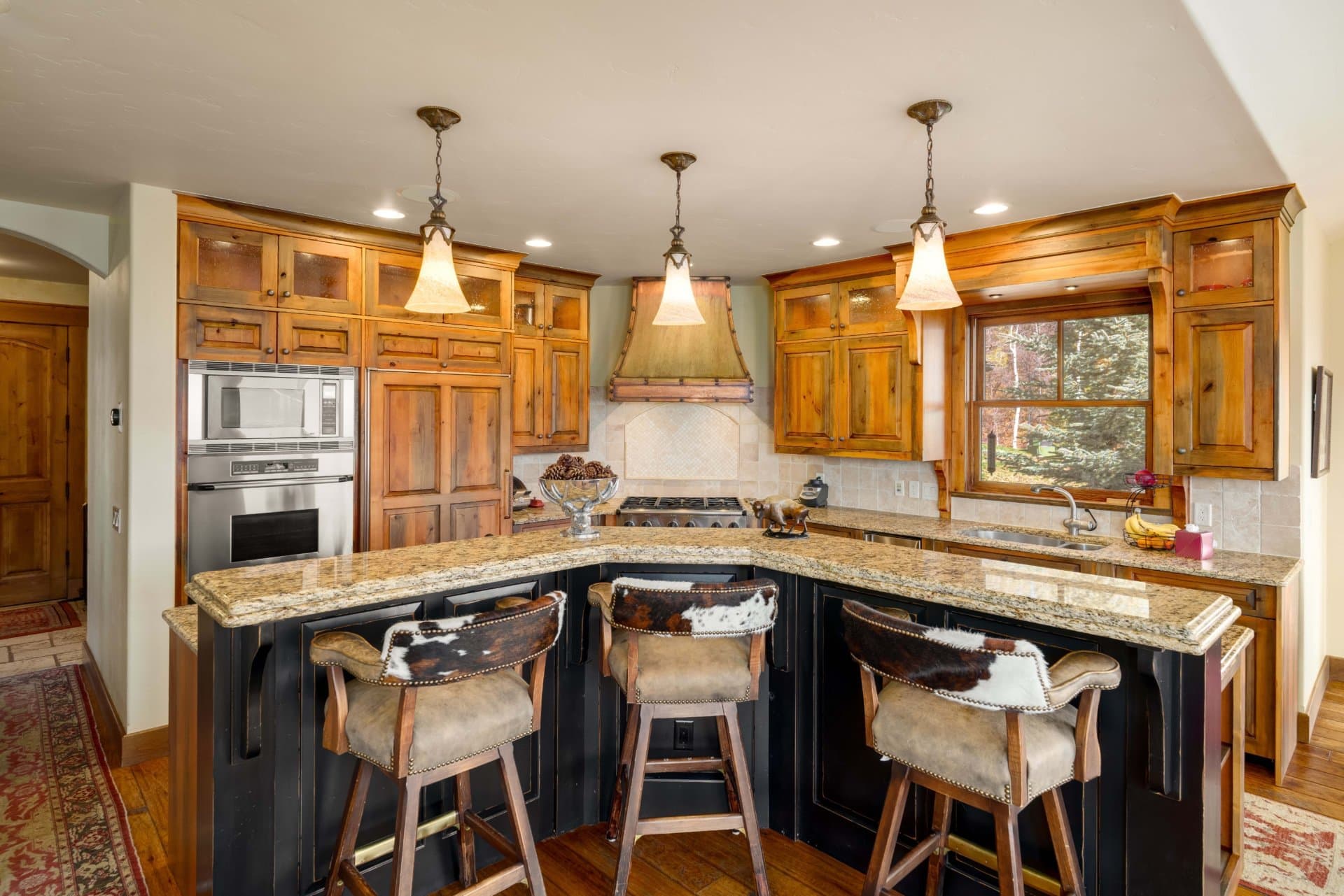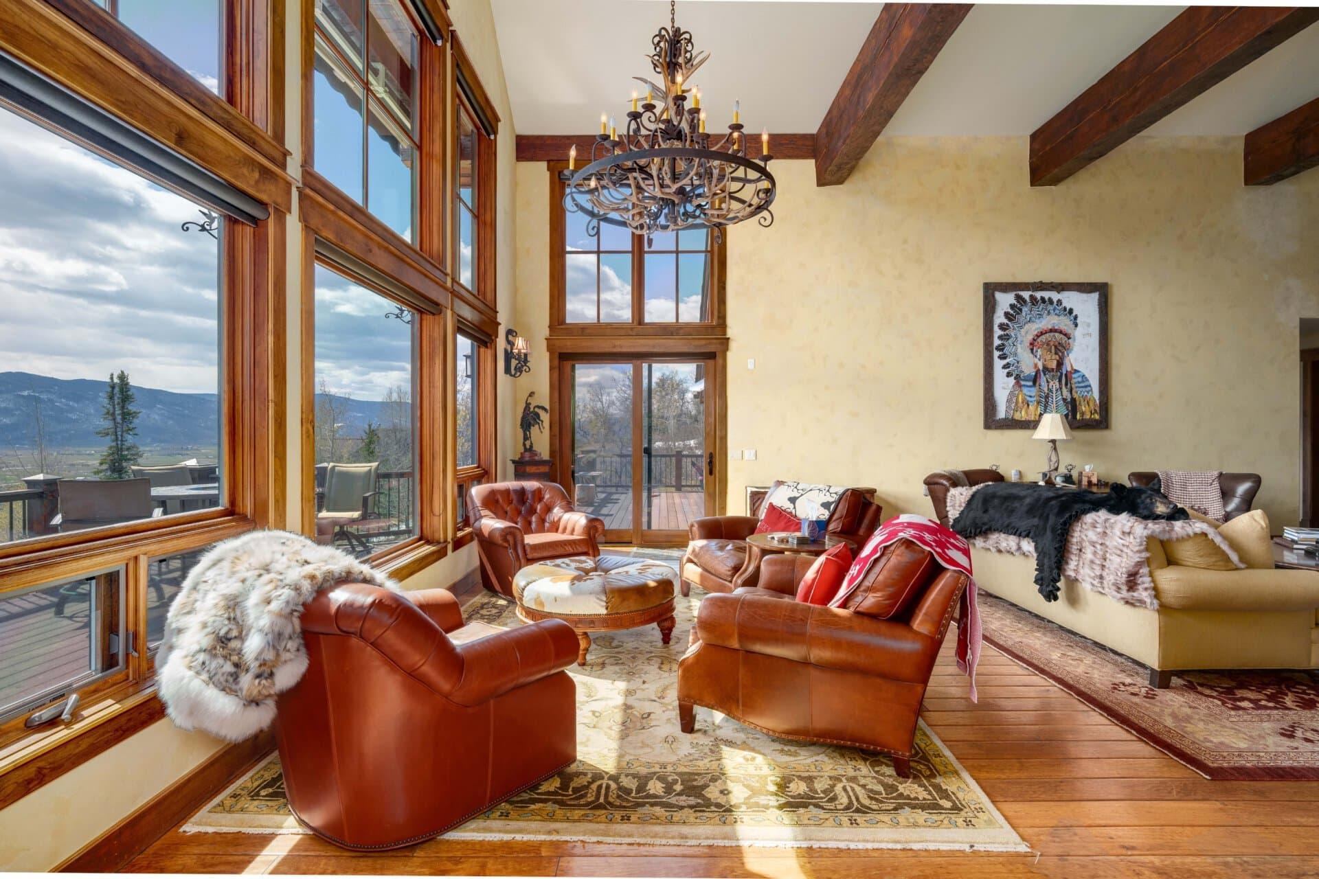 Upon entering the home, the great room welcomes you with cathedral ceilings, rough-hewn timber beams, a magnificent floor-to-ceiling custom rock fireplace, hand-scraped pecan floors, and large bay windows bathing the interior space in natural light. A gourmet kitchen with SubZero and Dacor appliances, custom cabinetry, a large breakfast area, a butler’s pantry, and just off the kitchen is a private deck for grilling. The dining room includes vaulted ceilings and picture-framed views of Steamboat Ski Mountain.