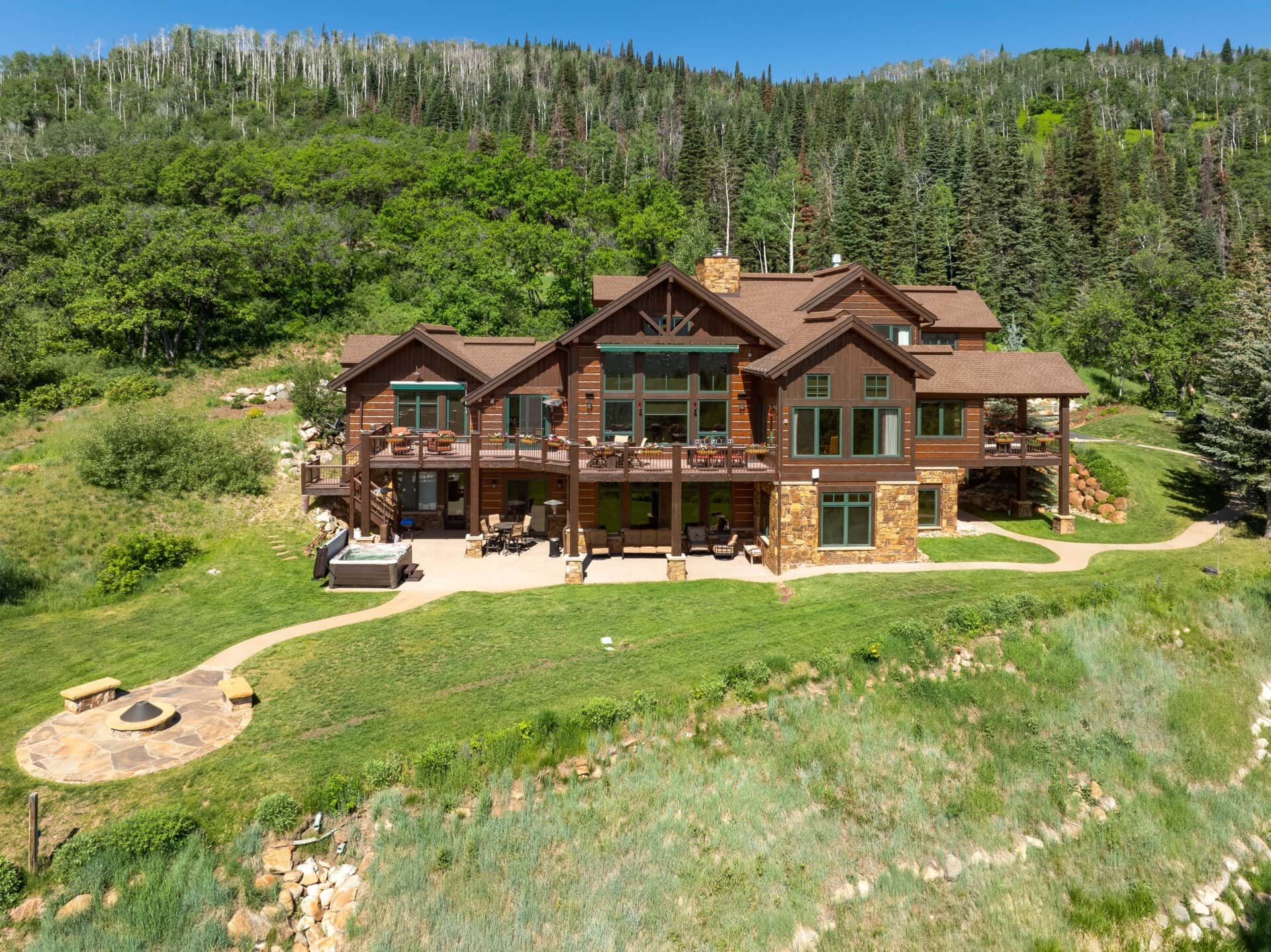 The main-level private primary suite includes a sitting area with a fireplace, a private deck for morning coffee, his and her vanities, walk-in closets, and a spa-like bathroom with a steam shower and jetted tub. Downstairs offers three en-suite bedrooms and an expansive family room with a bar area, pool table, card table, and a large rock fireplace. Downstairs opens to the outside for easy access to the manicured lawns, hot tub, and custom gas firepit. Upstairs includes two en-suite bedrooms connected by a relaxed living area with a rock fireplace and TV. This professionally furnished home includes an oversized three-car garage and downstairs gym area with large built-in cabinetry for all your recreation gear storage needs. Laundry rooms are located on the main and lower levels. The 8.5± acres have end-of-the-road privacy and a professionally manicured landscape, including several wildlife sculptures. Only minutes from town, Sweetwater Estate at Agate Creek Preserve is the perfect canvas for Steamboat Springs’ mountain living.