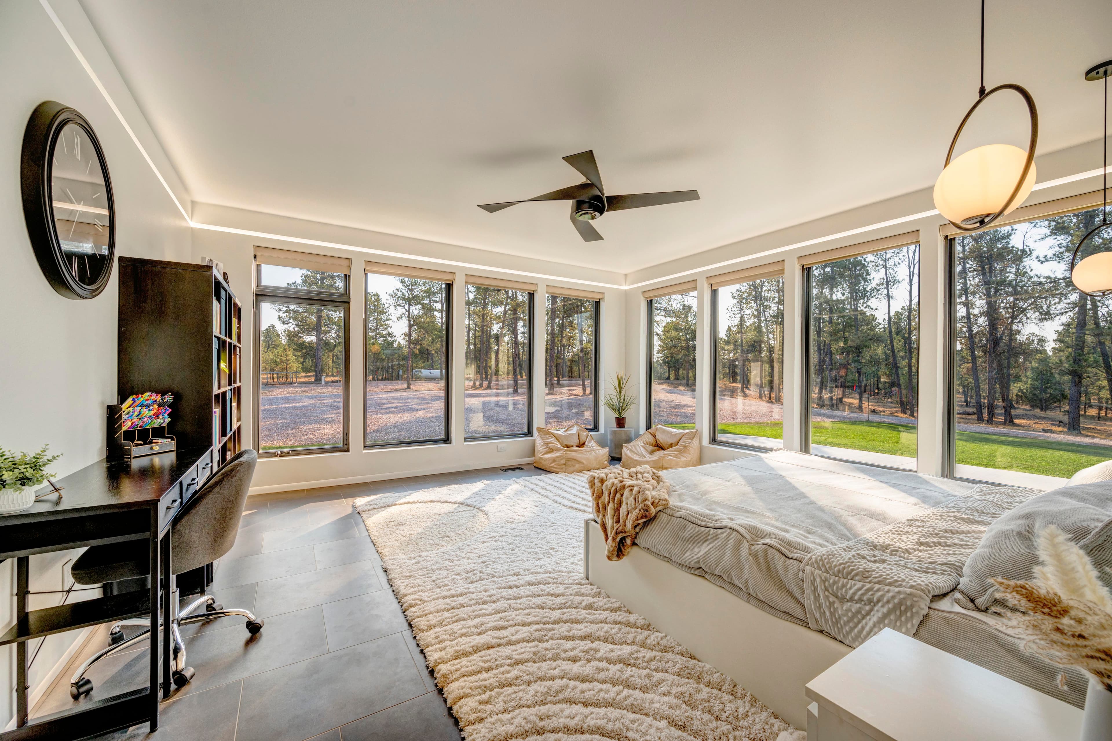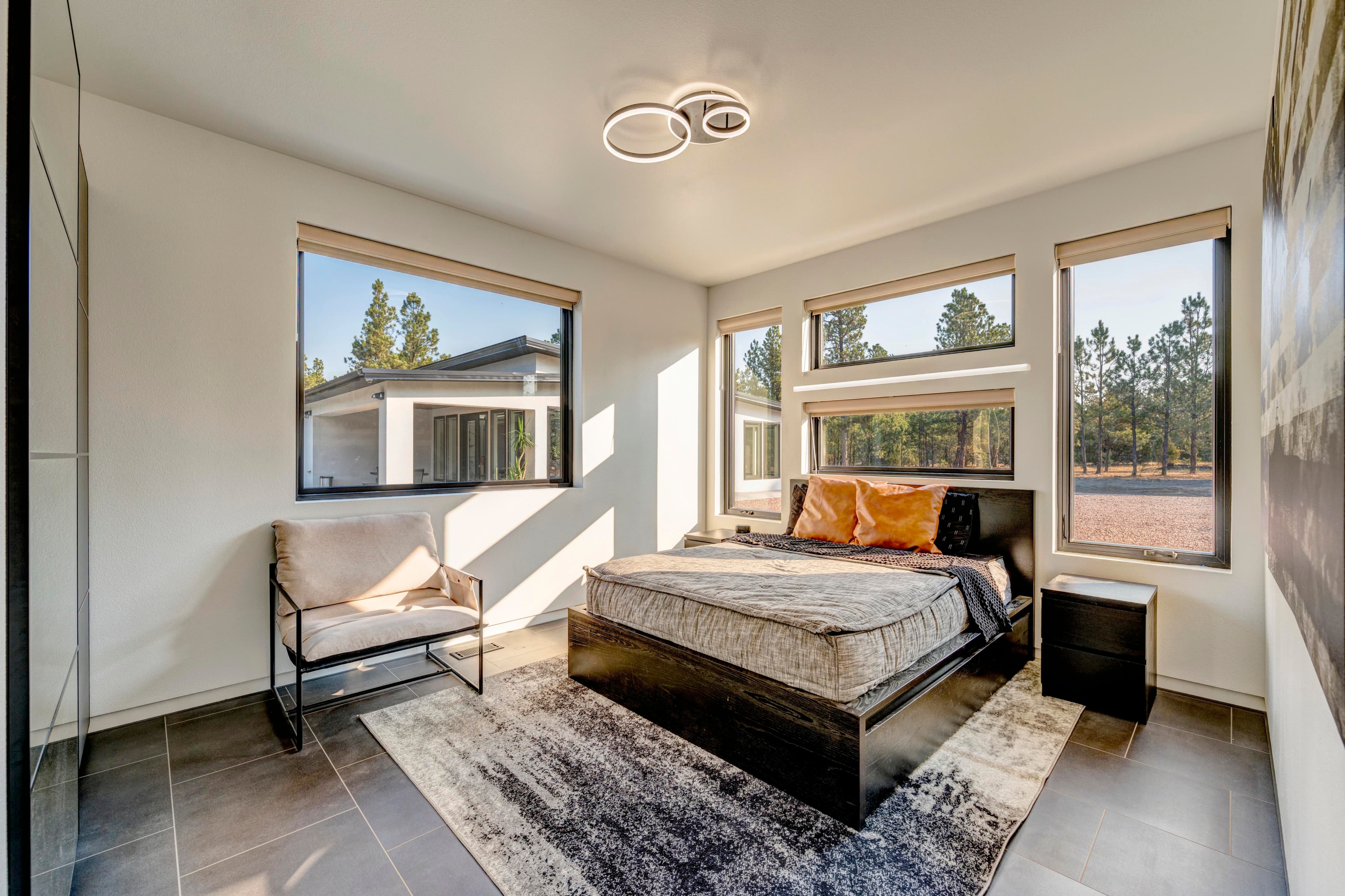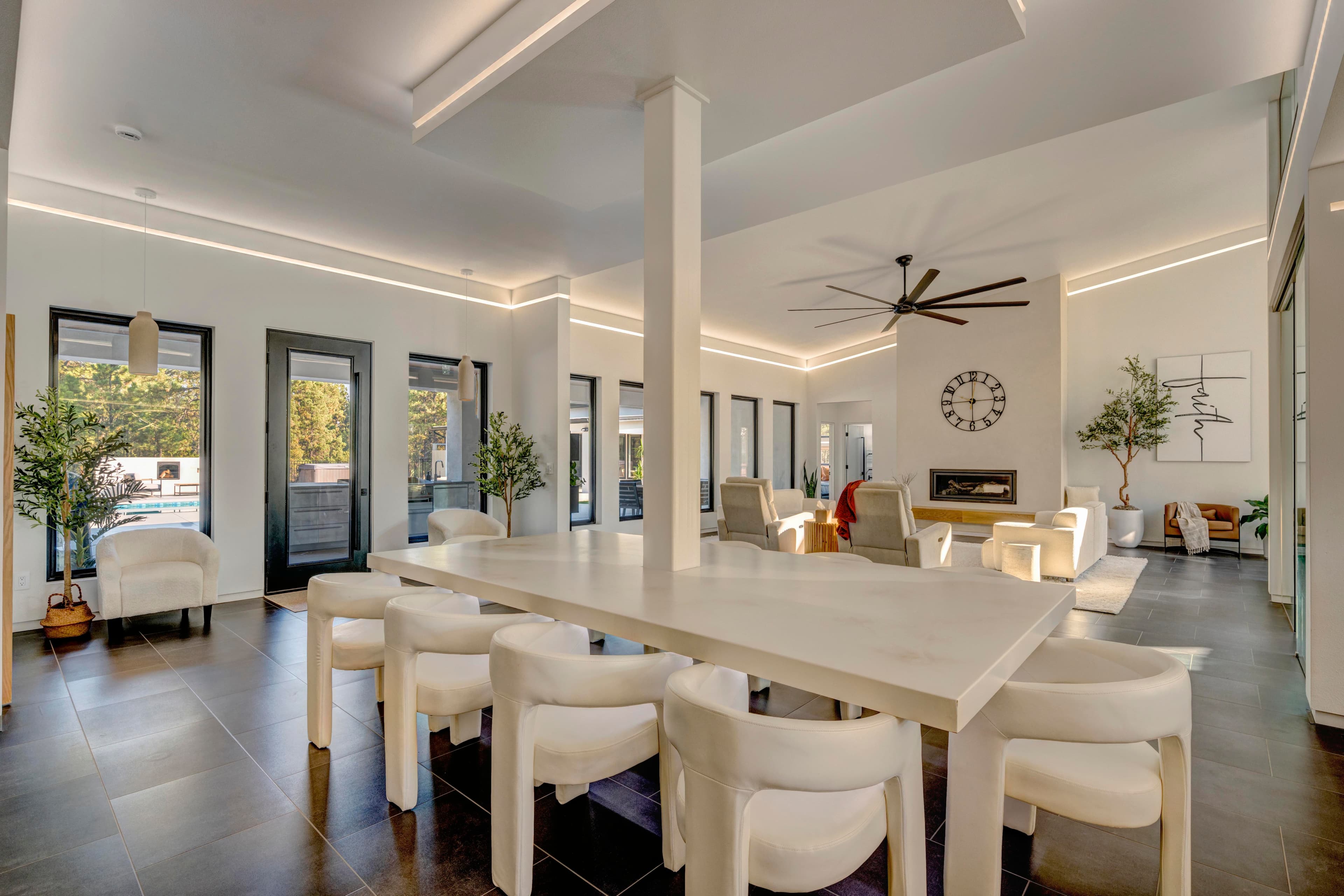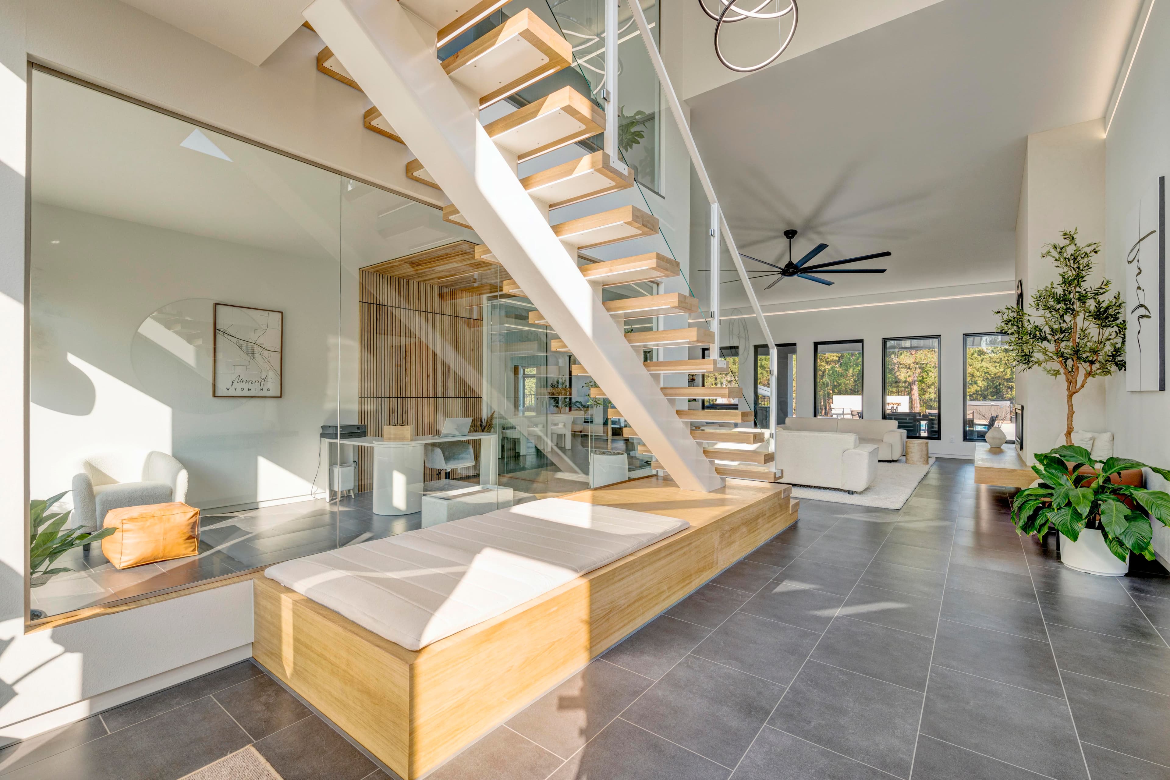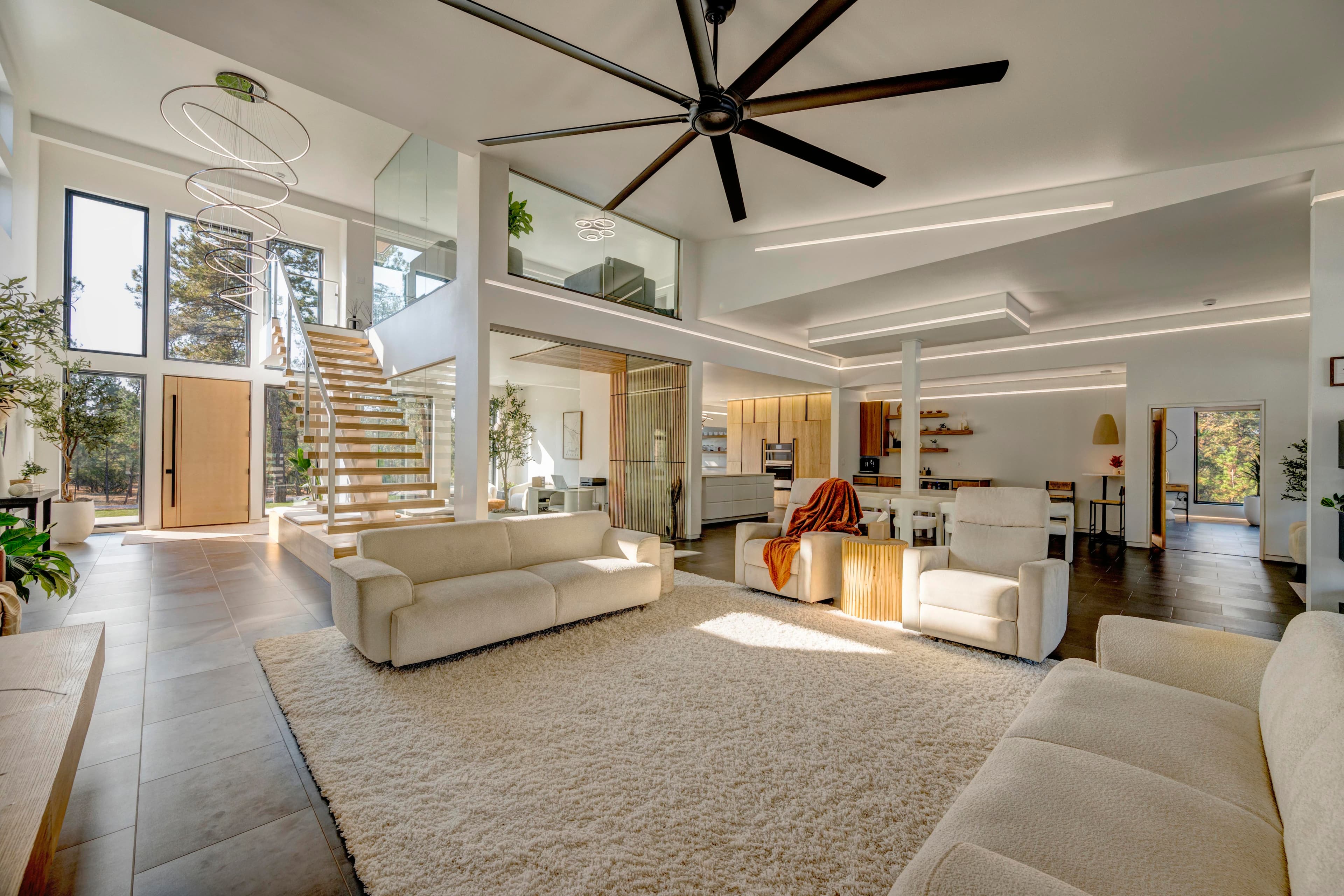 This modern home with abundant natural light is loaded with modern smart home features, including a fully automated sprinkler-and-lawn-mowing system, creating a perfectly manicured lawn.