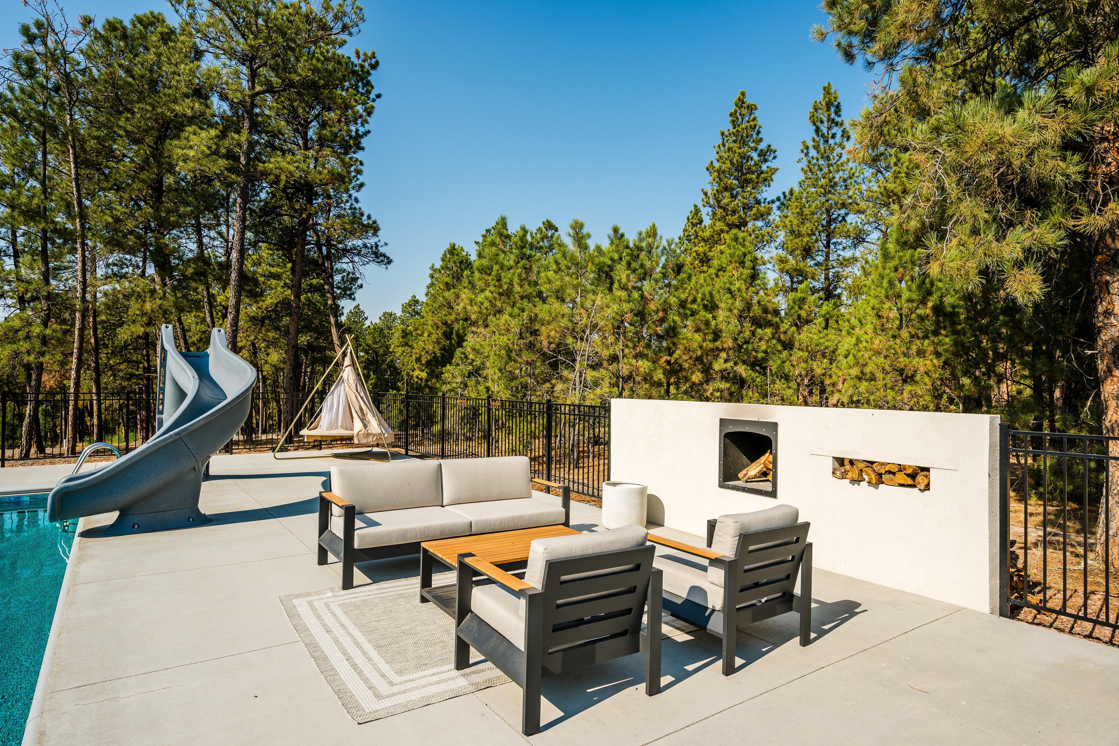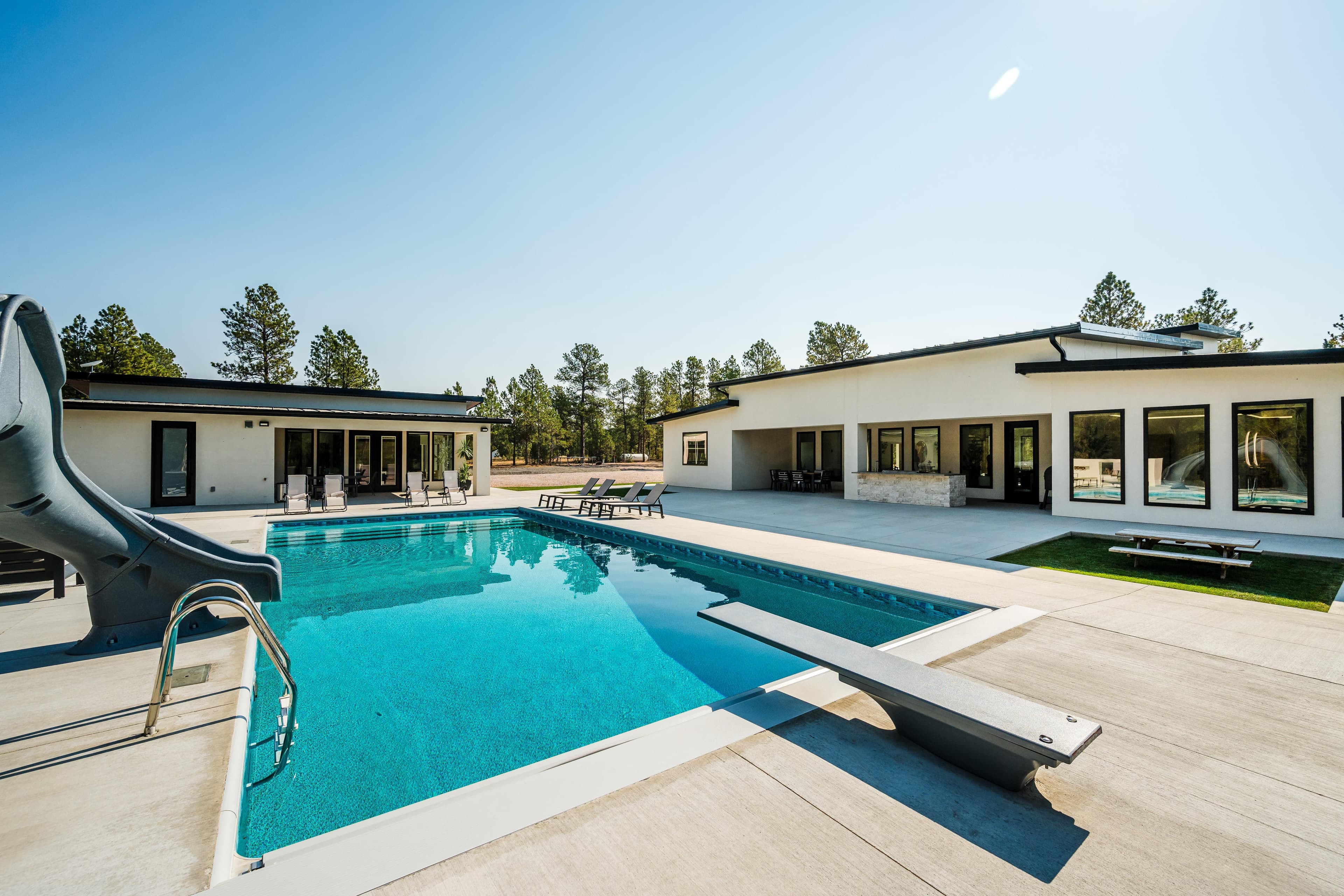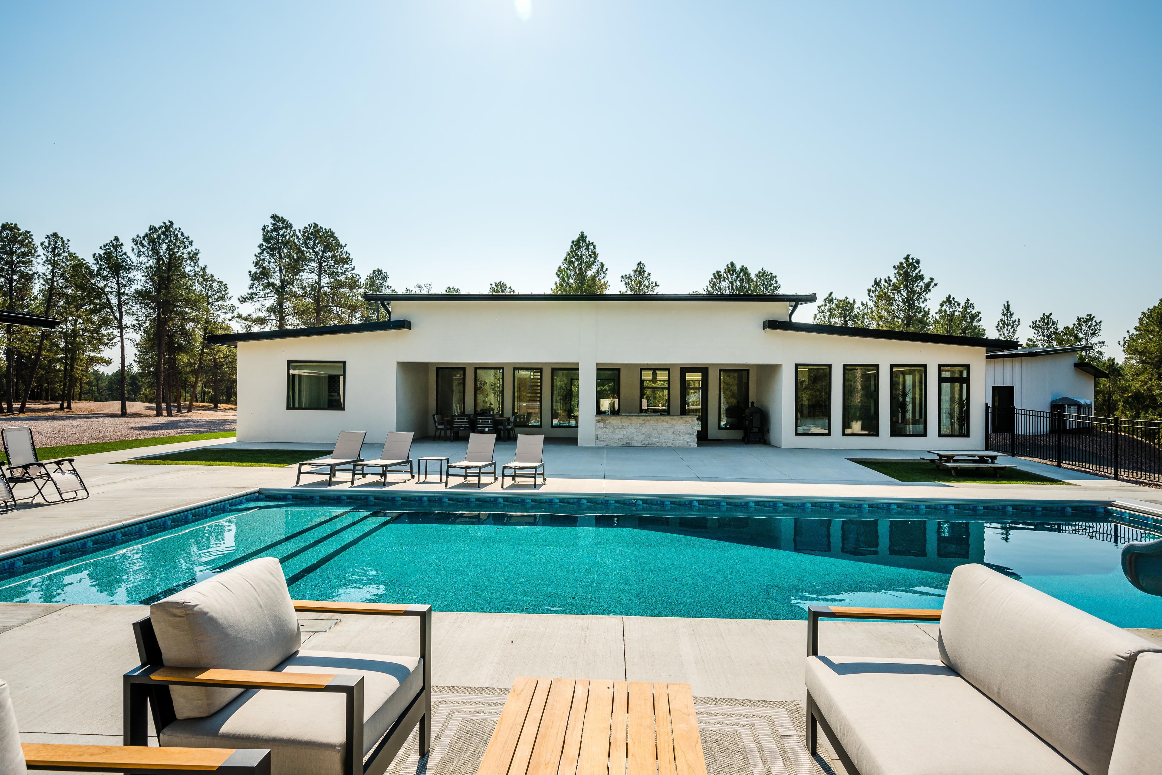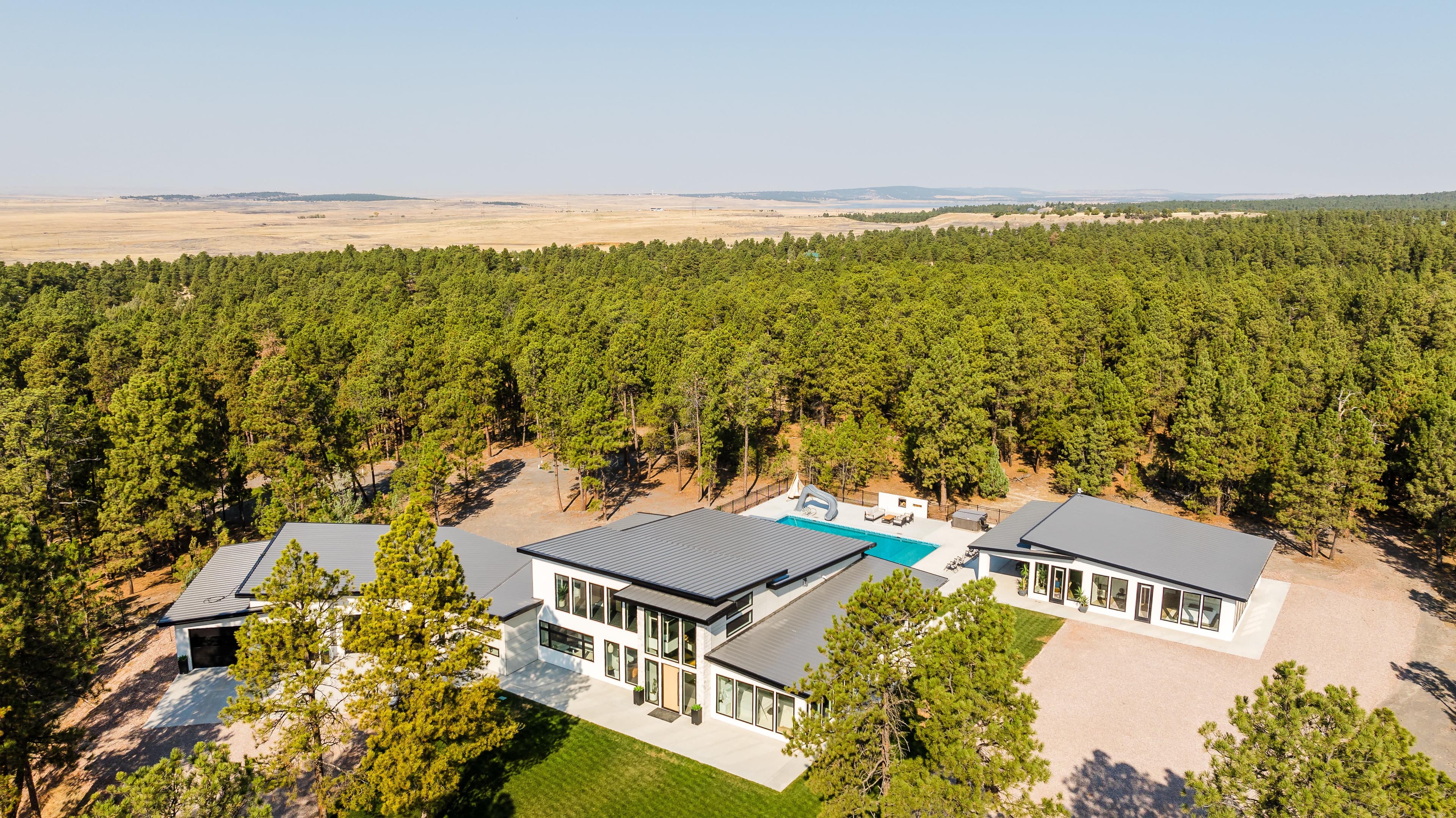 Nestled amongst the pines on the western edge of the Black Hills sits a secluded custom retreat with 5,765± square feet of indoor living space. Finished in 2024, the improvements feature a main home with 4 bedrooms and 3.5 bathrooms, an outdoor pool, a pool house with an additional bedroom, 2 full bathrooms, a kitchen area, and a sauna. Boasting exceptional privacy and surrounded by 7.81 acres of pine trees, you feel as if you are miles away from it all.
