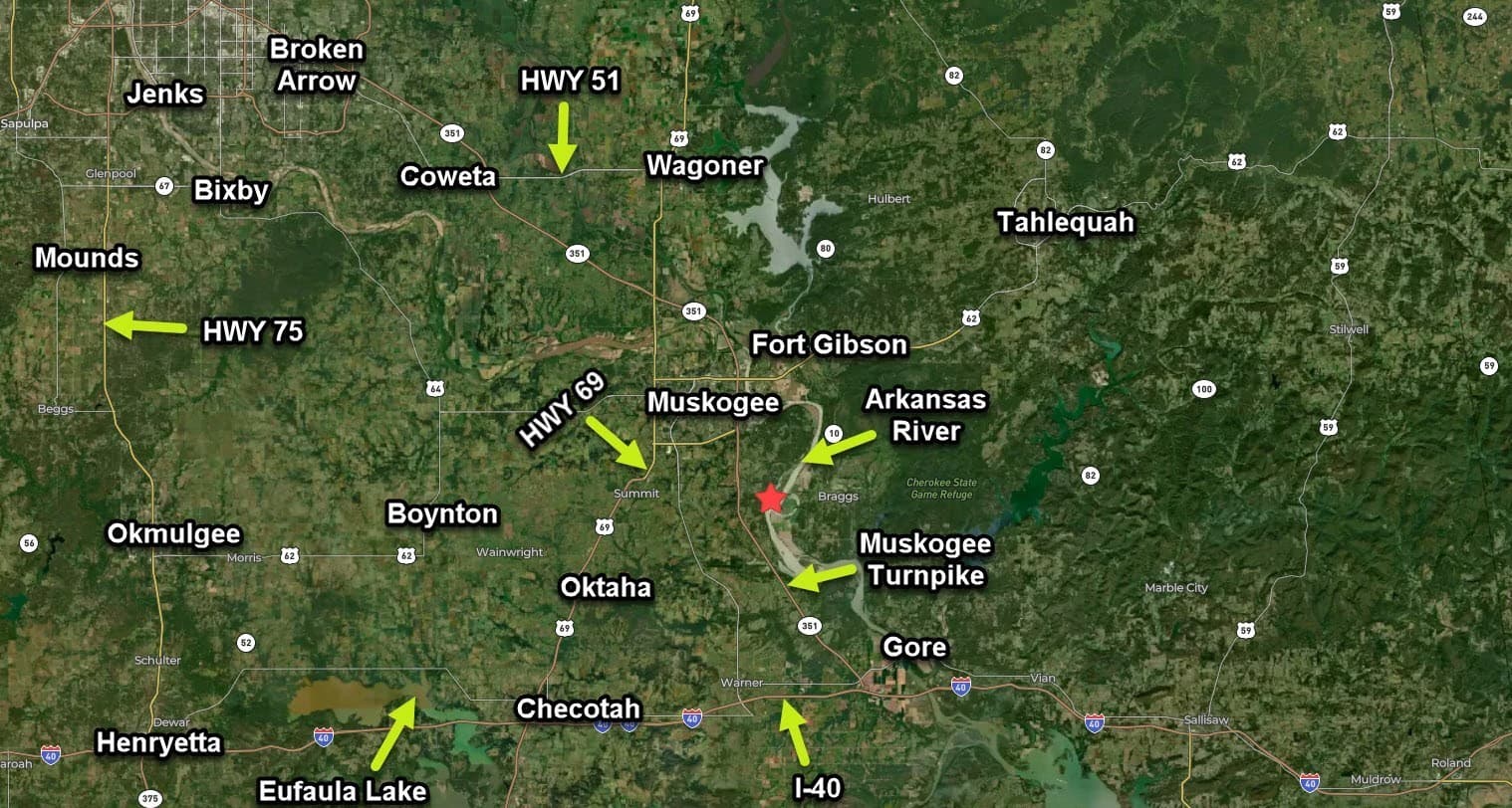 PHENOMENAL YEARROUND RECREATIONAL PROPERTY WITH 87 +/- ACRES IN MUSKOGEE—LESS THAN 1 MILE FROM THE ARKANSAS RIVER! This amazing 87 +/- acre property backs up to Corps Land, providing a natural retreat with mature trees and small cleared areas, perfect for wildlife observation. Located just 7 miles from Muskogee's amenities, including Walmart and Lowe's, this property balances seclusion with convenience. Situated just 2 miles from the Muskogee Turnpike, 8 miles to HWY 69, and 12 miles to I-40, this property is conveniently located to be a prime hunting retreat or recreational getaway. Water and outdoor enthusiasts will be thrilled to own this property that sits mere steps away from the Arkansas River, 6 miles from Greenleaf State Park, only 12 miles from Lake Tenkiller, and 20 miles to Eufaula Lake, where they can take advantage of the numerous adventures and aquatic activities readily available at each location during the spring and summer. Its proximity to Camp Gruber Wildlife Management Area further enhances its appeal for nature lovers. Whether you're looking for a private escape or an outdoor playground, this 87 +/- acre property presents a rare opportunity to own a piece of Oklahoma's natural beauty. Don't miss the chance to own such a unique piece of land. Schedule a showing today!