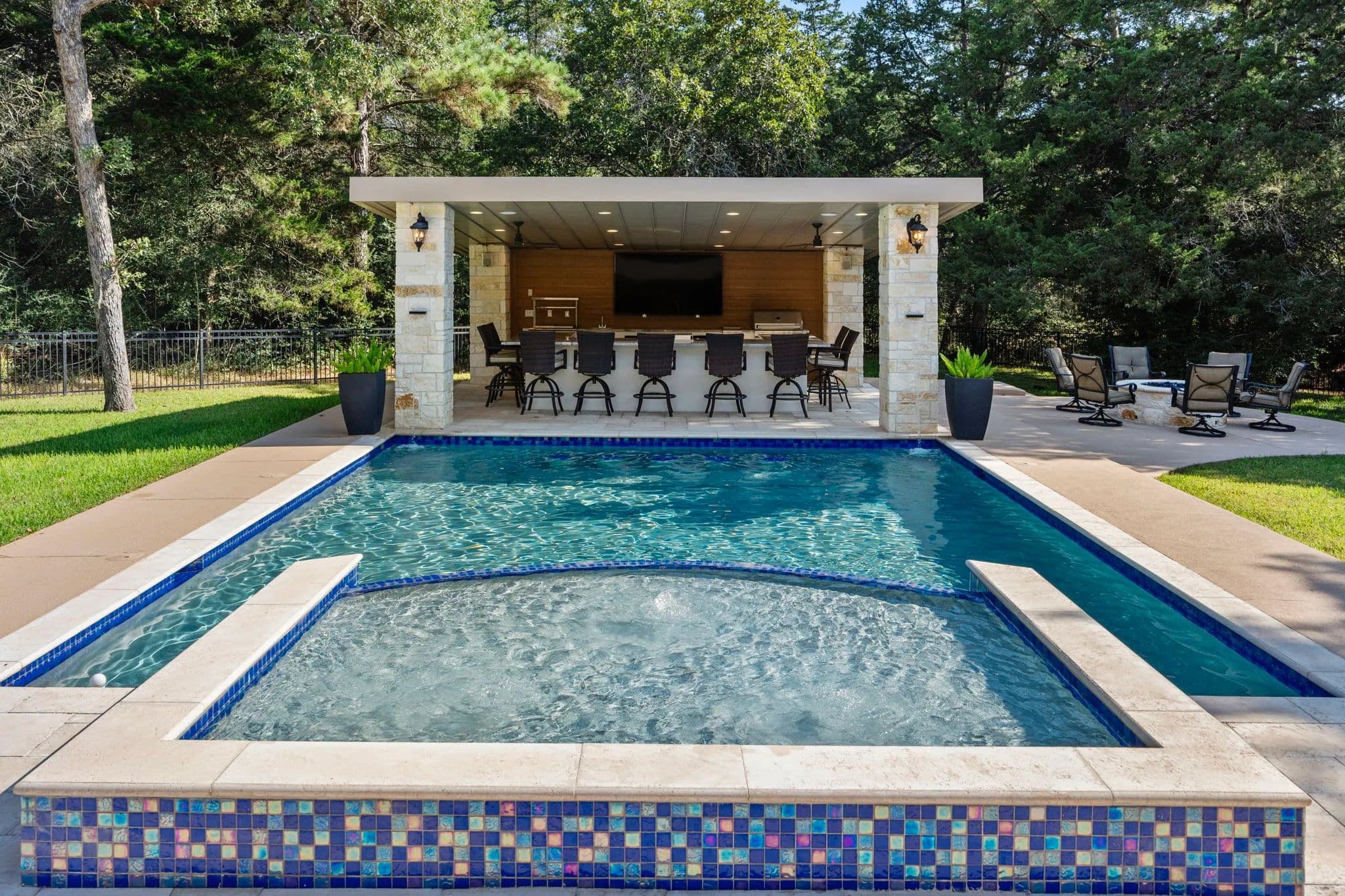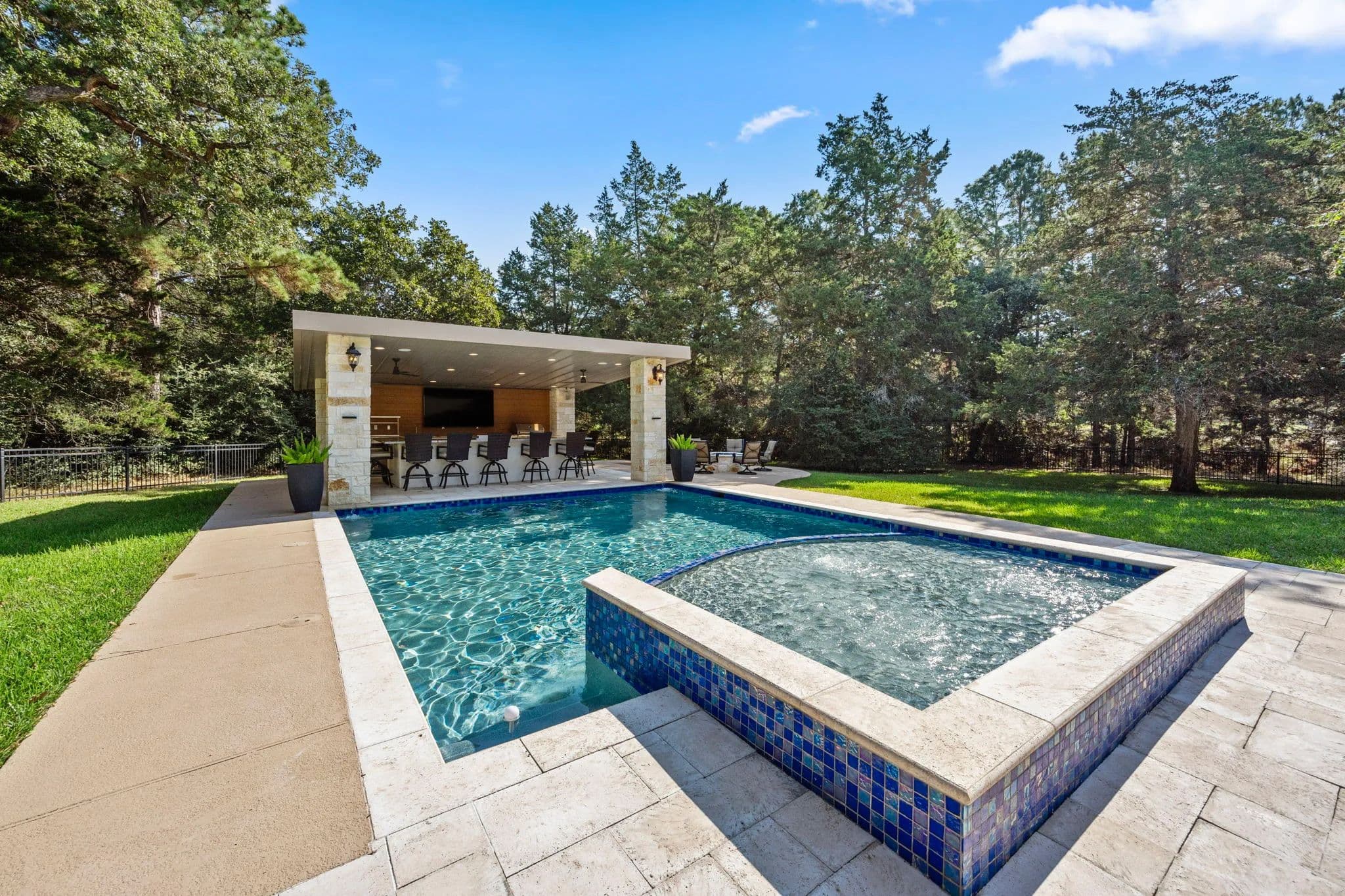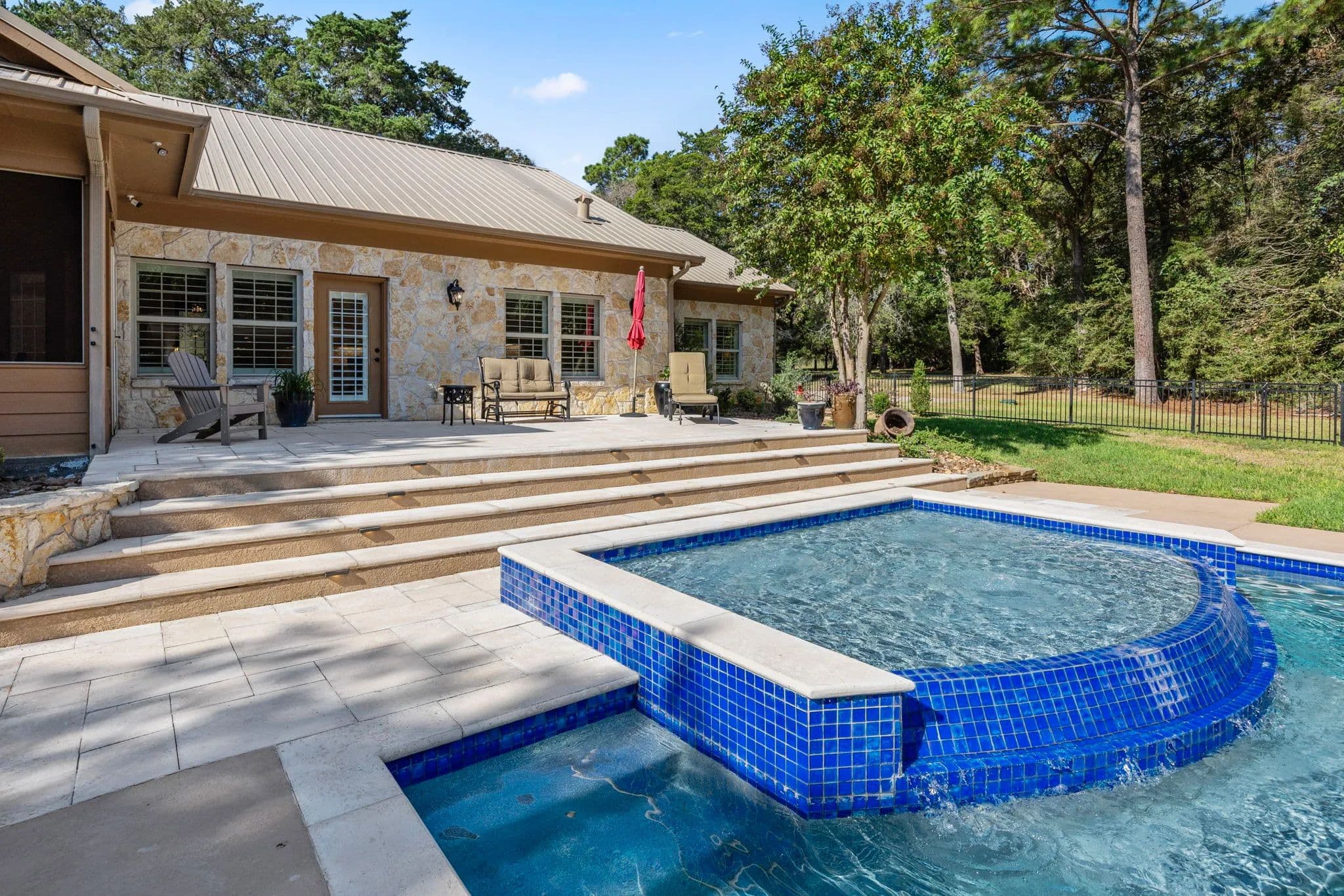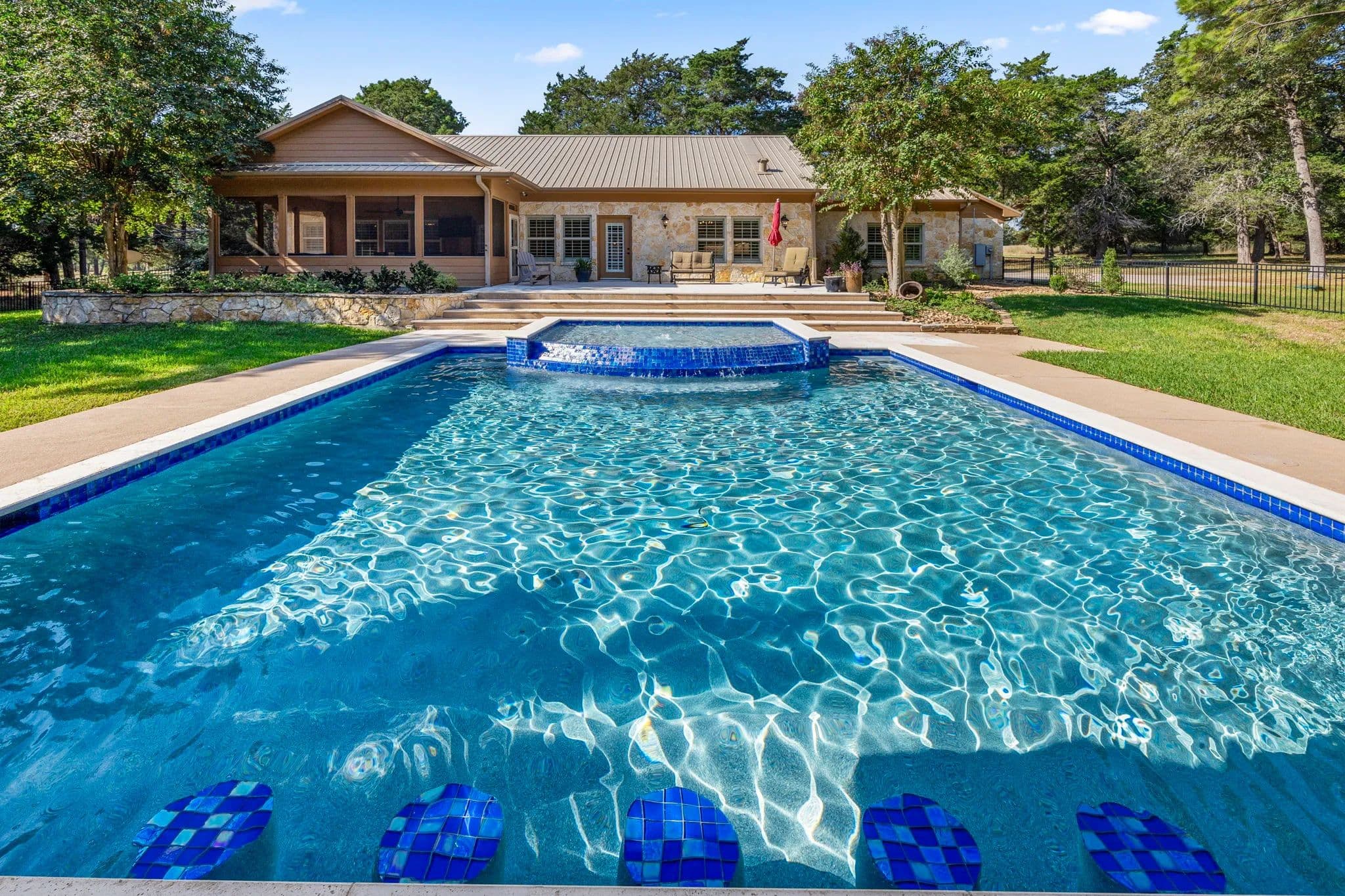 Discover the pinnacle of luxury living in this exquisitely remodeled 2,540 sq. ft. limestone masterpiece, nestled in "The Falls", a prestigious gated community offering a Championship Golf Course and Resort, just 45 minutes from Katy. Completely transformed between 2021 and 2022, this stunning 3 bedroom, 2 bath, 3 car garage home is crafted for both ultimate comfort and refined entertaining with every inch thoughtfully designed. Sitting on two large lots, this one has to be seen to be fully appreciated. Step into an open concept living space that radiates sophistication. The amazing living room flows seamlessly into the elegant dining area and the truly gourmet island kitchen. Custom cabinetry streamlined quartz countertops, and top-of-the-line KitchenAid appliances make this kitchen a culinary haven! The primary suite is nothing short of extraordinary. A serene retreat where luxury meets tranquility. Unwind in the spa-like bathroom, featuring a supersized wet room with a jetted hydro spa soaking tub, multiple showerheads, and a custom-built walk-in closet that is as functional as it is beautiful. Two additional bedrooms offer spacious comfort, accented with crown molding, plantation shutters and rich wood-look tile flooring, while the guest bathroom impresses with quartz countertop and a sleek freestanding tile shower. Your private paradise awaits! A screened-in patio leads to a cutting-edge heated gunite pool, complete with iAquaLink automation, an inviting sun deck, and in-pool stools. The adjacent outdoor kitchen cabana, finished in 2022, is a dream for entertainers featuring professional grade appliances, including a Paradise grill, hibachi griddle, cocktail station and ample bar seating. As the sun sets, gather around the limestone gas firepit, surrounded by lush landscaping and tastefully enclosed by a wrought iron fence. Additional highlights include a climate controlled attic storage room, epoxy coated garage floors and a full security system with cameras for peace of mind. This home is a true embodiment of elegance, luxury, and comfort crafted for those who demand the very best. Watch Walk Trough Video!! Call to schedule your private showing! NOTE - Dining Room and one of the guest bedroom pictures are digitally staged. Nicola Hammett 979/733/4594. All information is deemed accurate but should be independently verified.