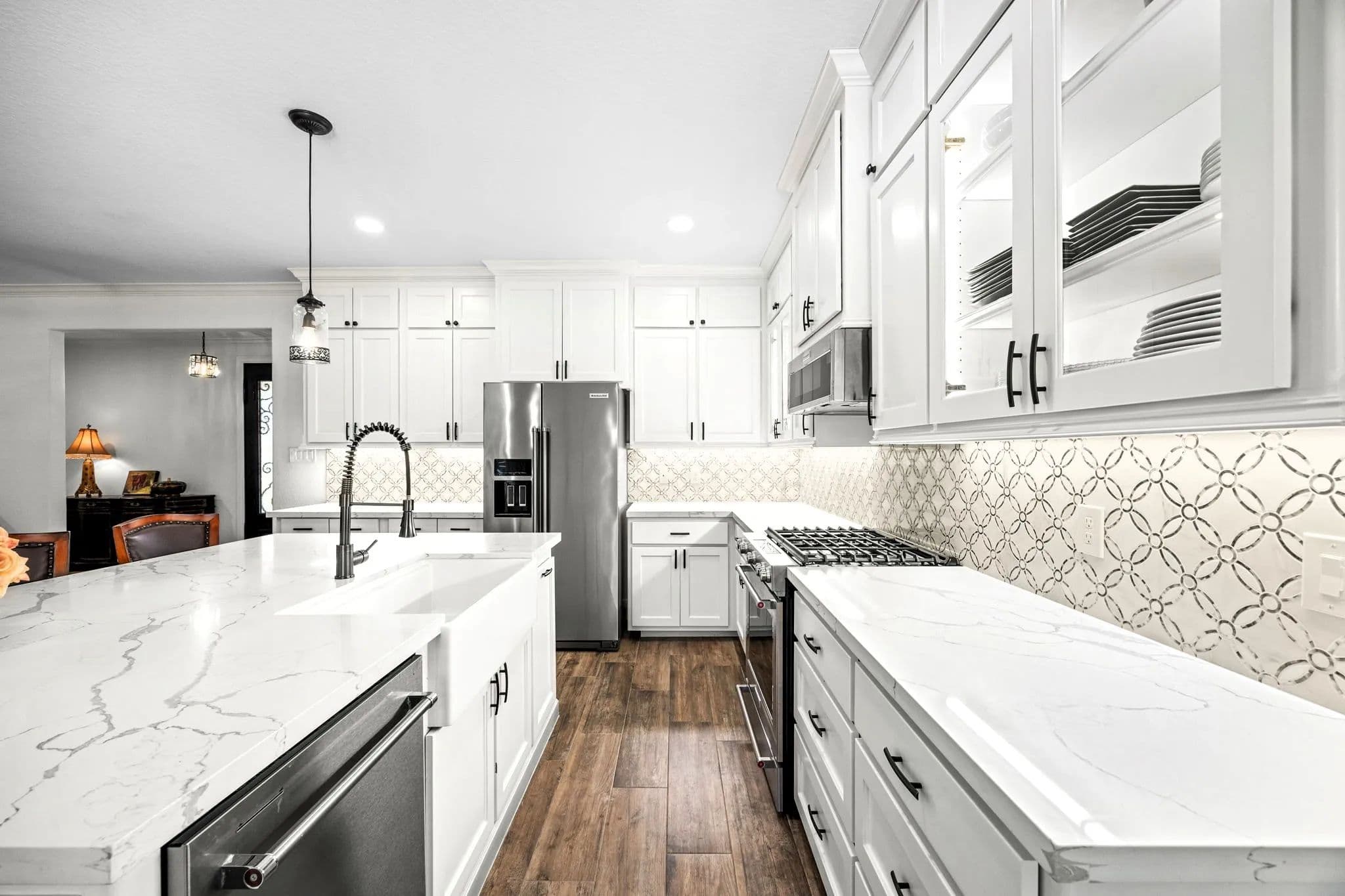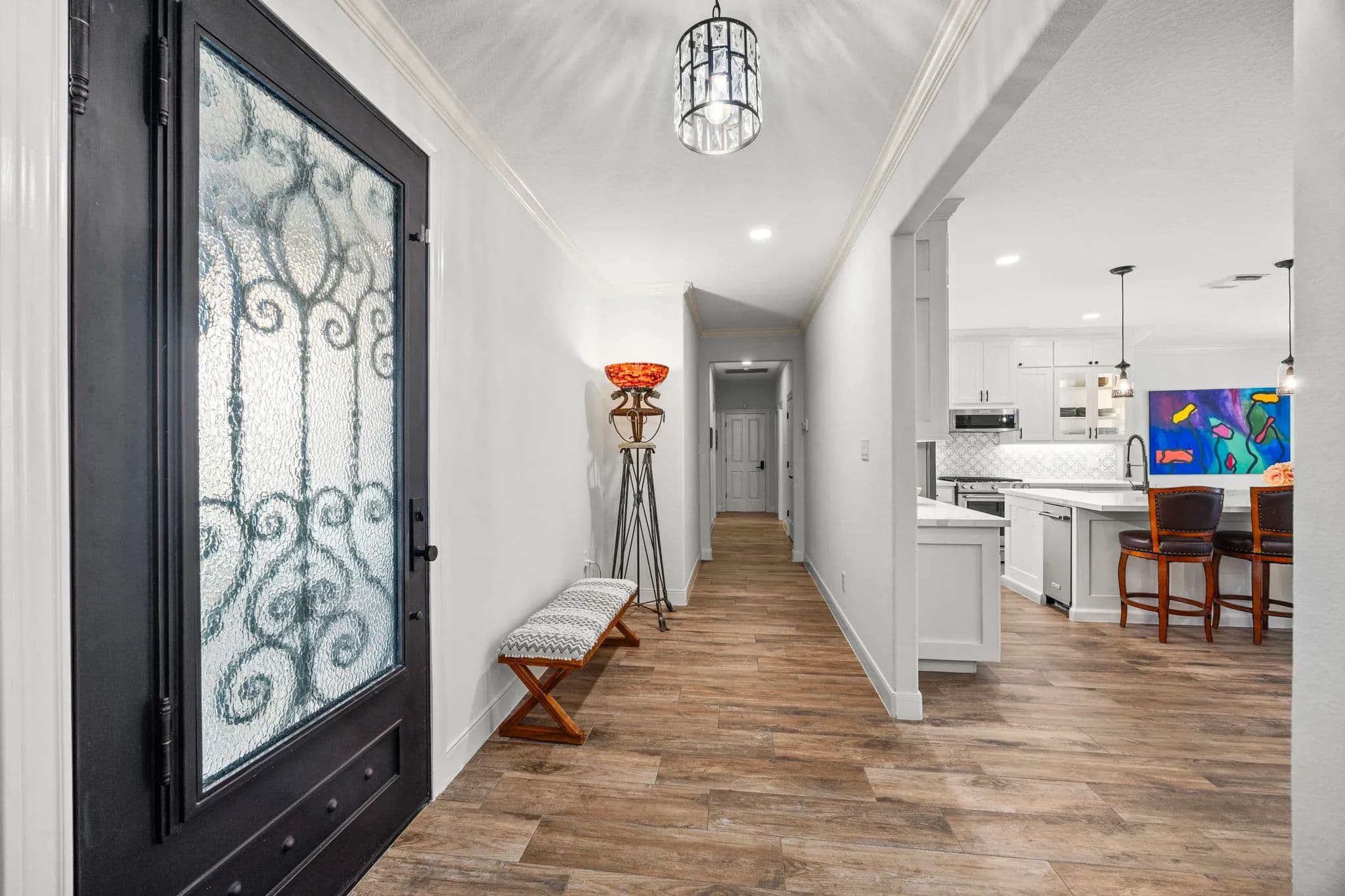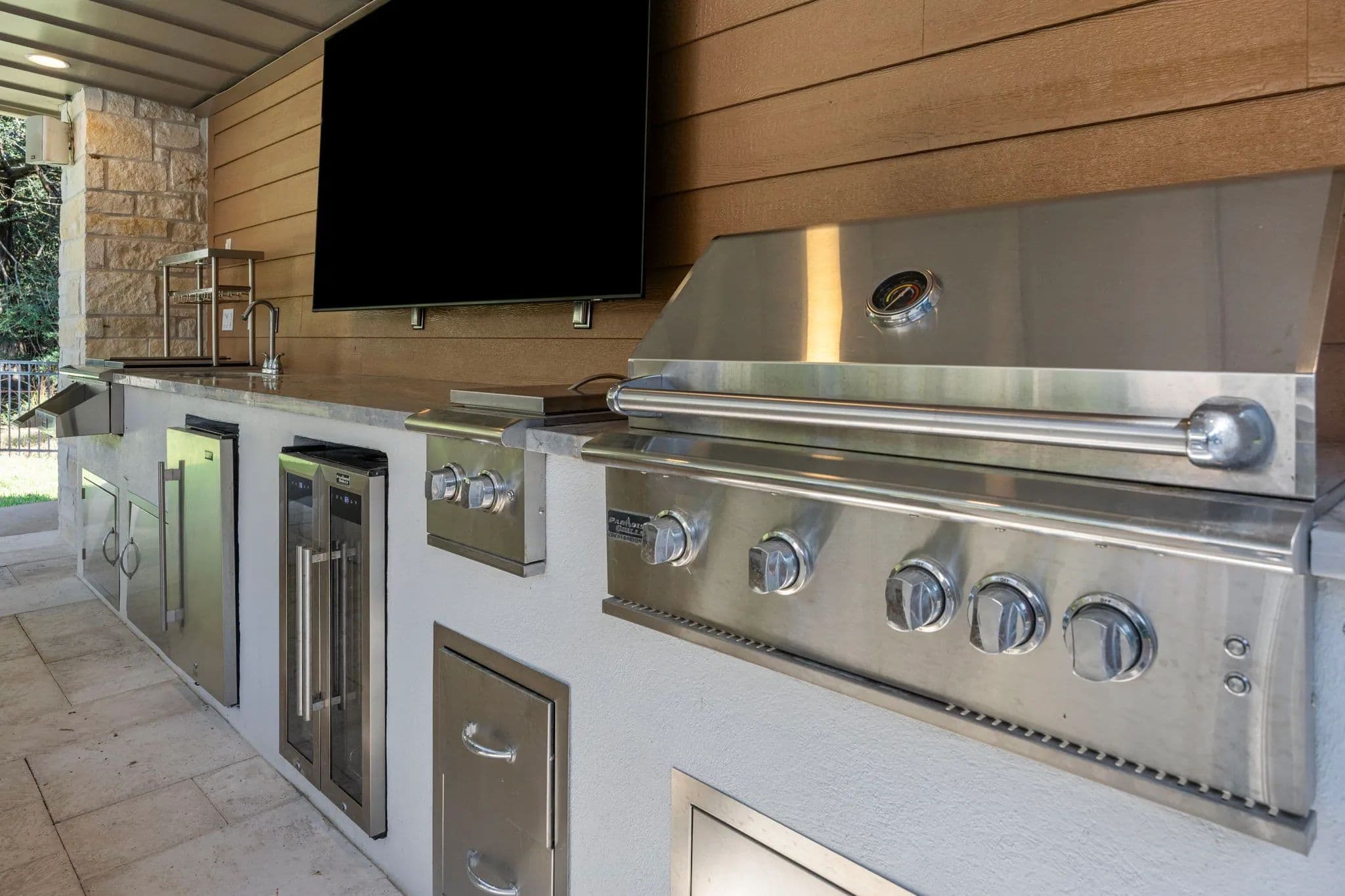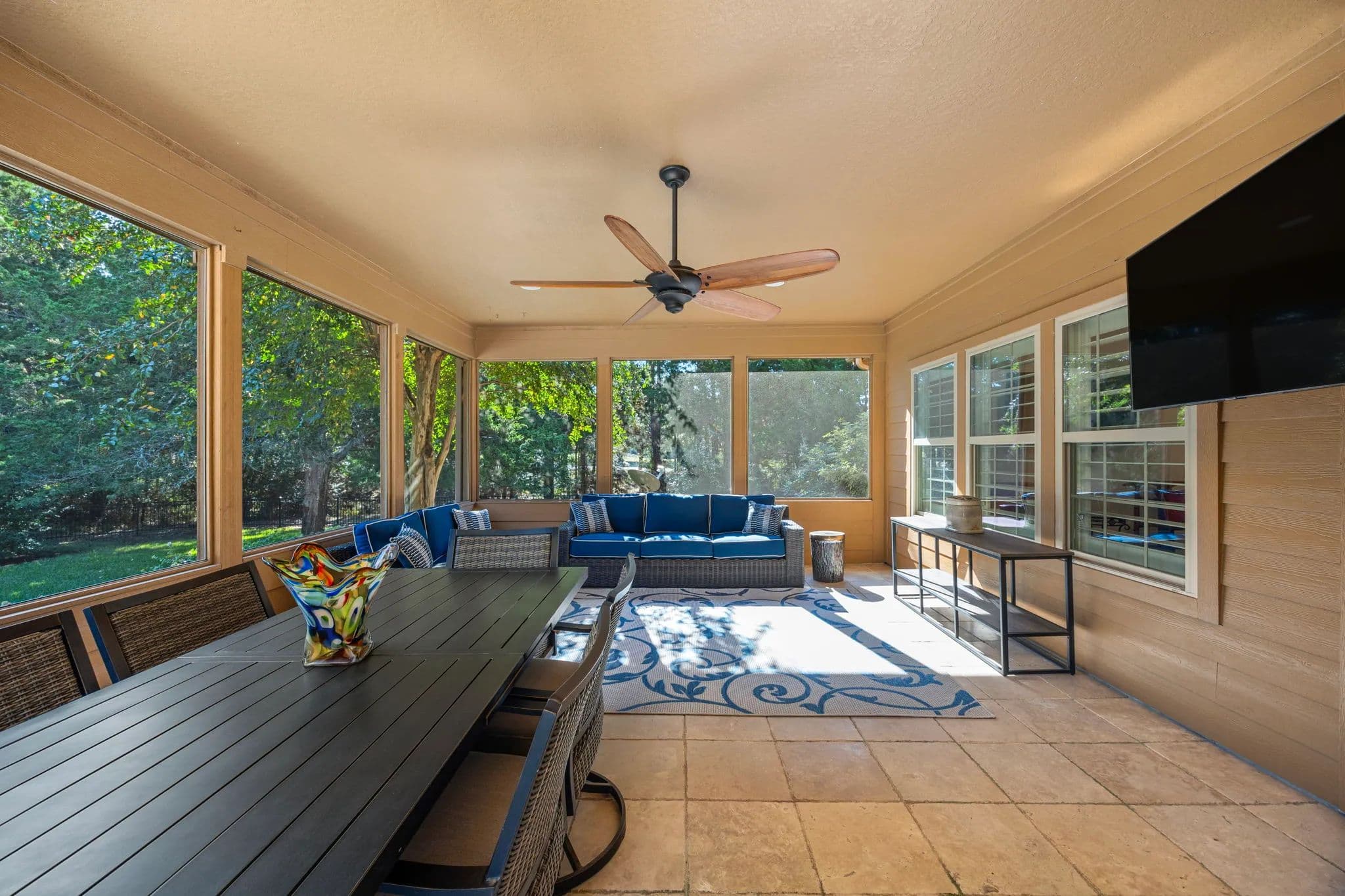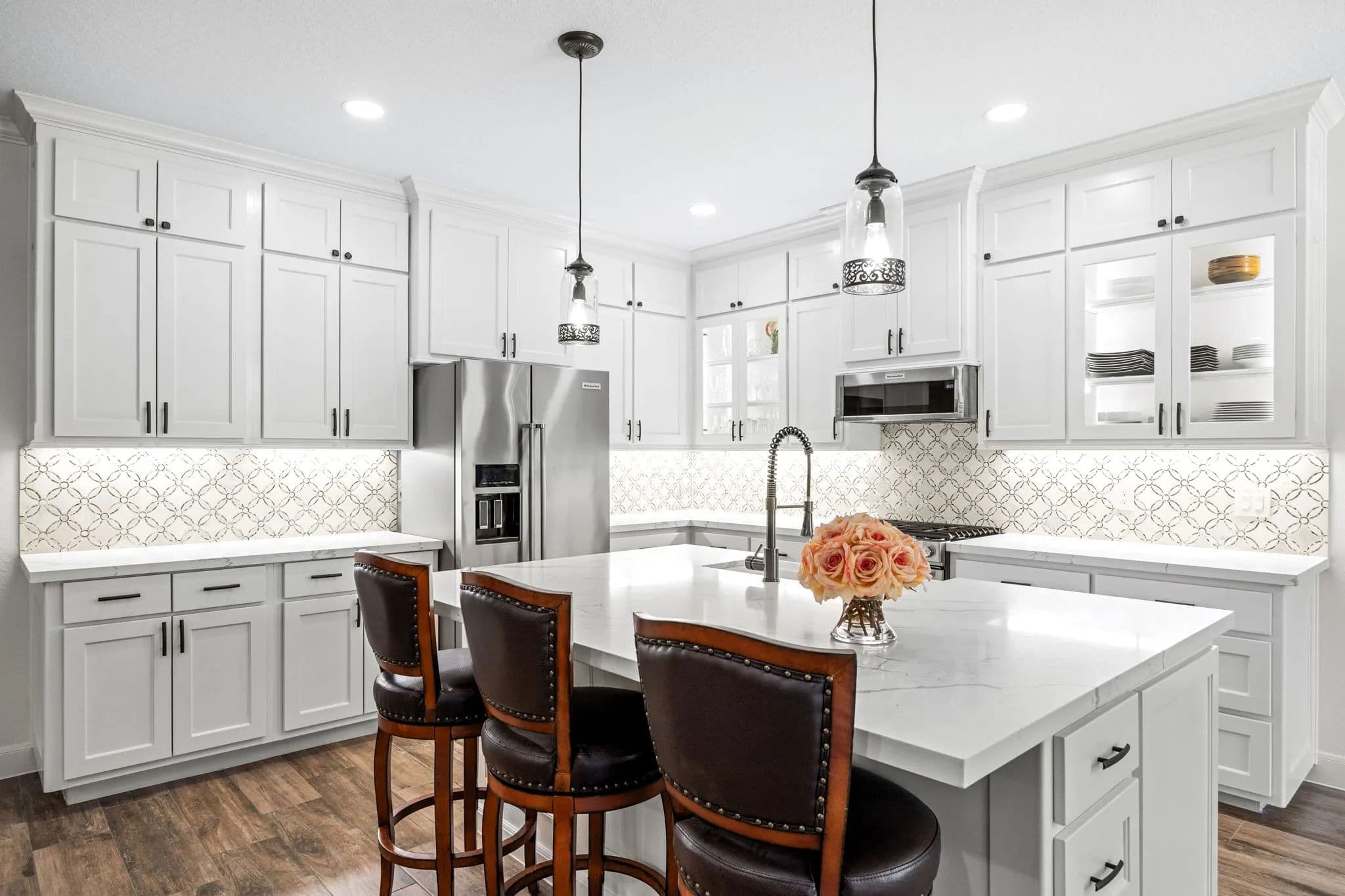 Discover the pinnacle of luxury living in this exquisitely remodeled 2,540 sq. ft. limestone masterpiece, nestled in "The Falls", a prestigious gated community offering a Championship Golf Course and Resort, just 45 minutes from Katy. Completely transformed between 2021 and 2022, this stunning 3 bedroom, 2 bath, 3 car garage home is crafted for both ultimate comfort and refined entertaining with every inch thoughtfully designed. Sitting on two large lots, this one has to be seen to be fully appreciated. Step into an open concept living space that radiates sophistication. The amazing living room flows seamlessly into the elegant dining area and the truly gourmet island kitchen. Custom cabinetry streamlined quartz countertops, and top-of-the-line KitchenAid appliances make this kitchen a culinary haven! The primary suite is nothing short of extraordinary. A serene retreat where luxury meets tranquility. Unwind in the spa-like bathroom, featuring a supersized wet room with a jetted hydro spa soaking tub, multiple showerheads, and a custom-built walk-in closet that is as functional as it is beautiful. Two additional bedrooms offer spacious comfort, accented with crown molding, plantation shutters and rich wood-look tile flooring, while the guest bathroom impresses with quartz countertop and a sleek freestanding tile shower. Your private paradise awaits! A screened-in patio leads to a cutting-edge heated gunite pool, complete with iAquaLink automation, an inviting sun deck, and in-pool stools. The adjacent outdoor kitchen cabana, finished in 2022, is a dream for entertainers featuring professional grade appliances, including a Paradise grill, hibachi griddle, cocktail station and ample bar seating. As the sun sets, gather around the limestone gas firepit, surrounded by lush landscaping and tastefully enclosed by a wrought iron fence. Additional highlights include a climate controlled attic storage room, epoxy coated garage floors and a full security system with cameras for peace of mind. This home is a true embodiment of elegance, luxury, and comfort crafted for those who demand the very best. Watch Walk Trough Video!! Call to schedule your private showing! NOTE - Dining Room and one of the guest bedroom pictures are digitally staged. Nicola Hammett 979/733/4594. All information is deemed accurate but should be independently verified.