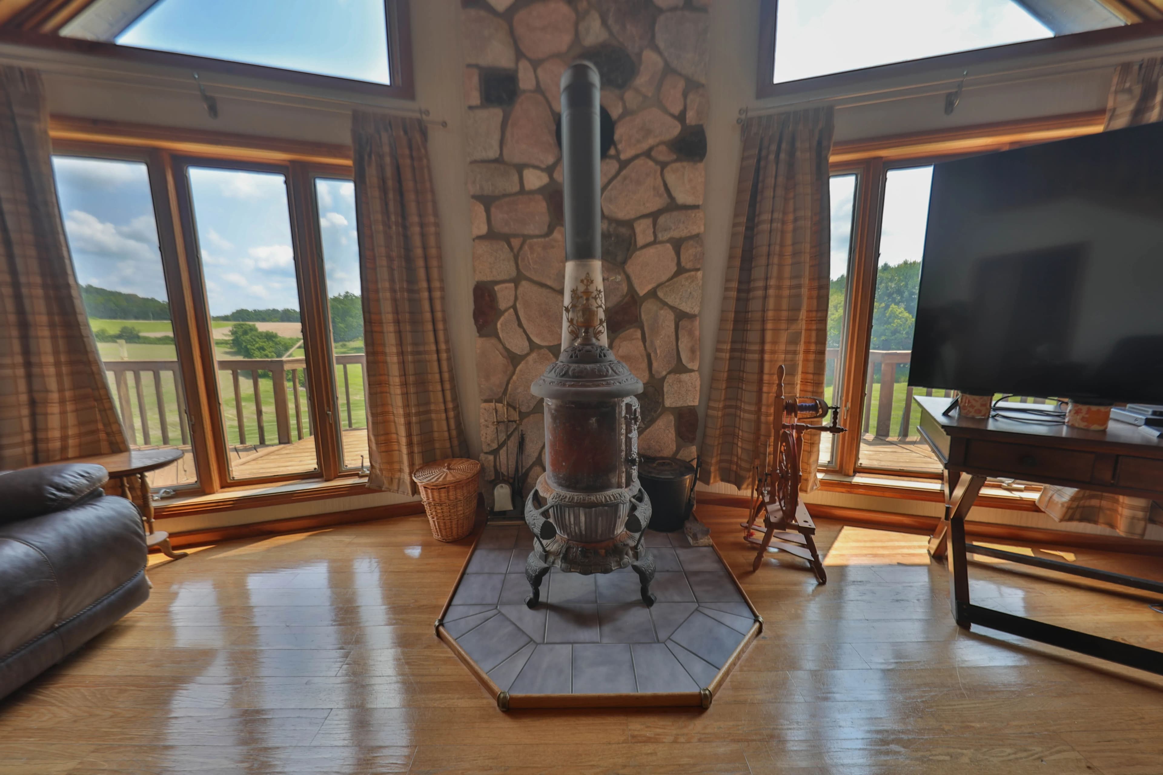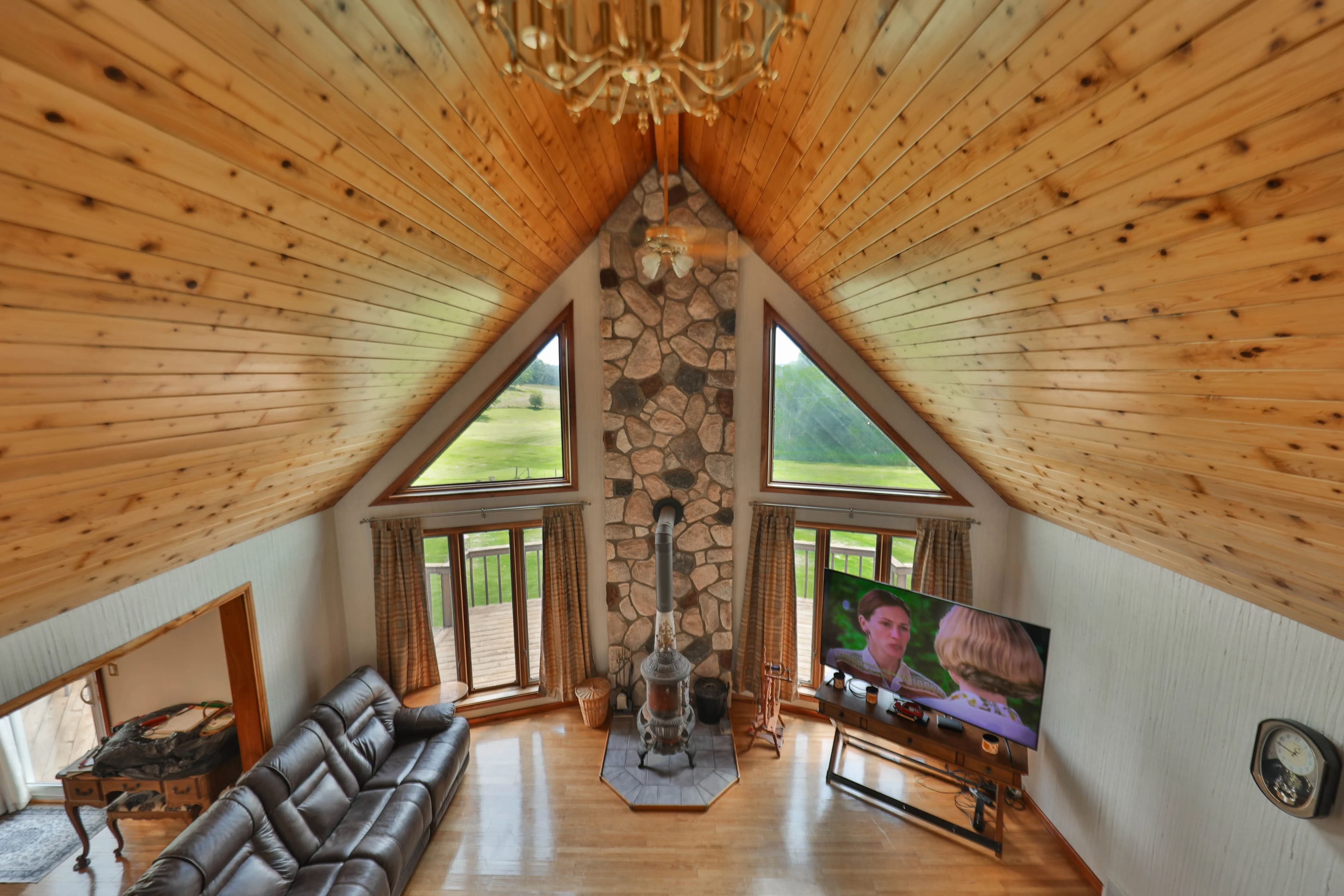 Entertaining is effortless with two wood burning stoves, new paella windows enhancing energy efficiency, and a walk-out deck overlooking rolling hills where wildlife roams freely. The walkout basement adds versatility with exposed aggregate patio flooring, seamlessly blending indoor and outdoor living spaces.