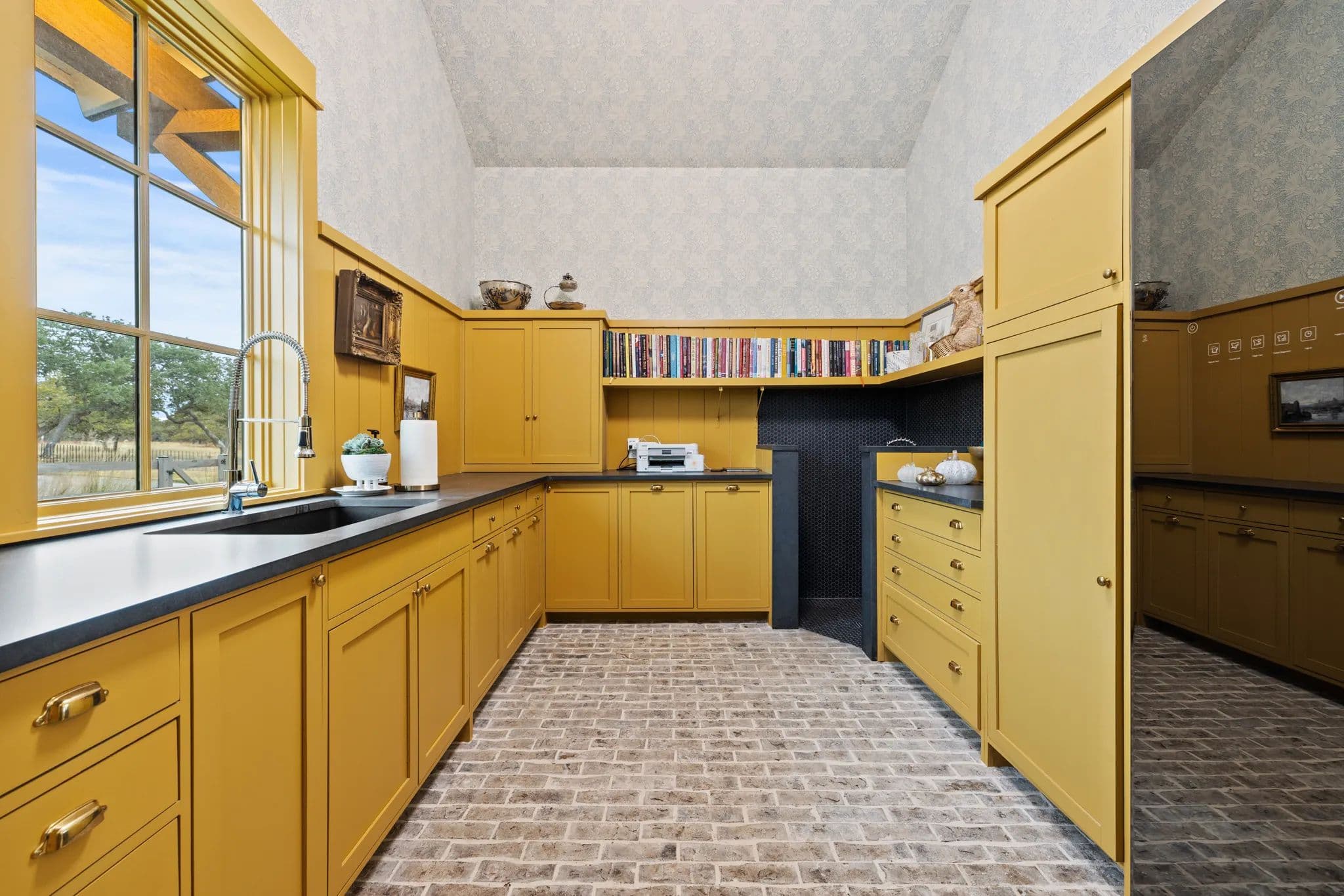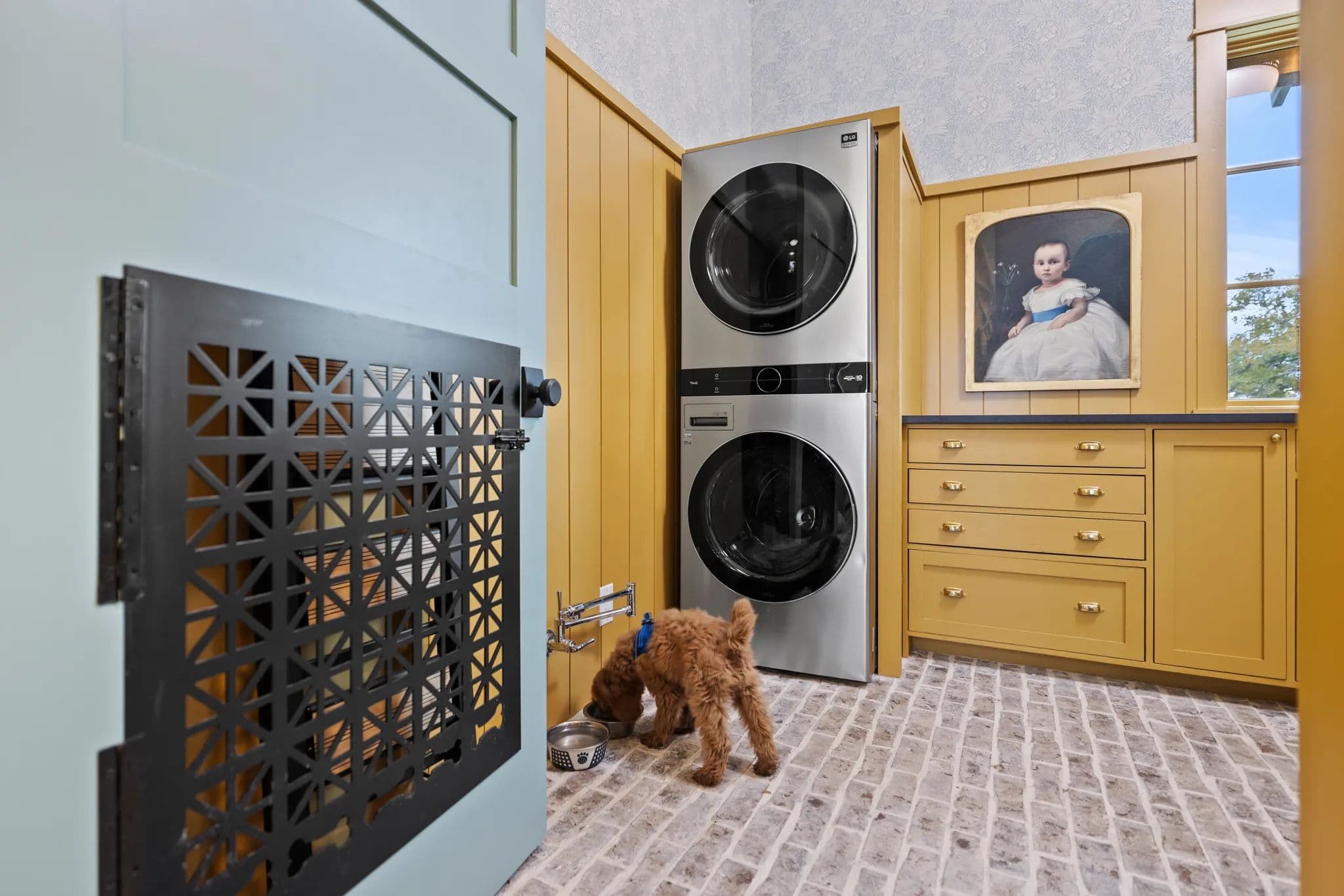 The home's kitchen is equipped with top-of-the-line Samsung Signature Series appliances, including a double oven, microwave, gas stove top with 4 burners, a sous vide, and an induction burner. There is also a separate fridge and freezer, dishwasher, and an extra-large island with quartz countertops. The butler's pantry features a second dishwasher, additional oven and microwave, sink, small wine fridge, and a drinking water dispenser. The laundry room includes a washer/dryer, sink, clothes steamer closet, and a dog bath/shower.