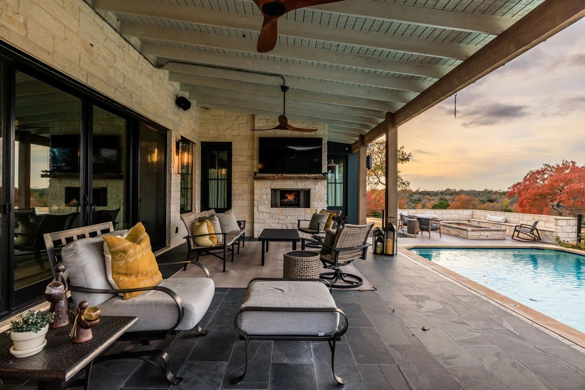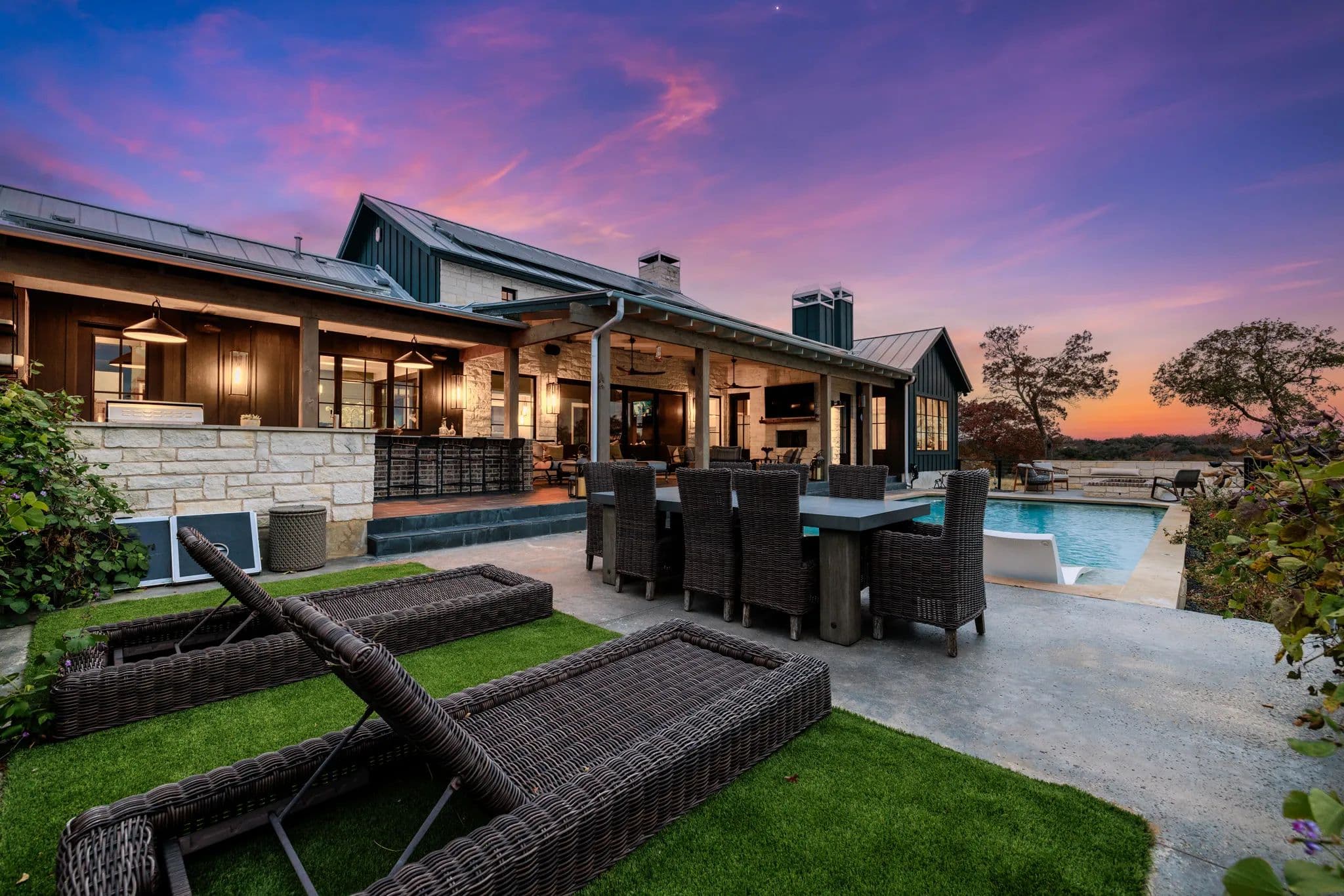Outside, there is a covered living area with an outdoor kitchen, 2 sinks, a Renaissance Cooking system, 2 cold drawers, 2 beer taps, 2 wine fridges, a fireplace, TV, and leathered quartz countertops. The outdoor space also includes a fire pit, pool, table, chairs, and many great extras. Solar panels are in place and the large 3-car garage includes a water softener and 2 extra large batteries for solar panel back-up. There is a 20KW generator and 2-500 gallon propane tanks. Additionally, there is fiber optic cable for high-speed internet.