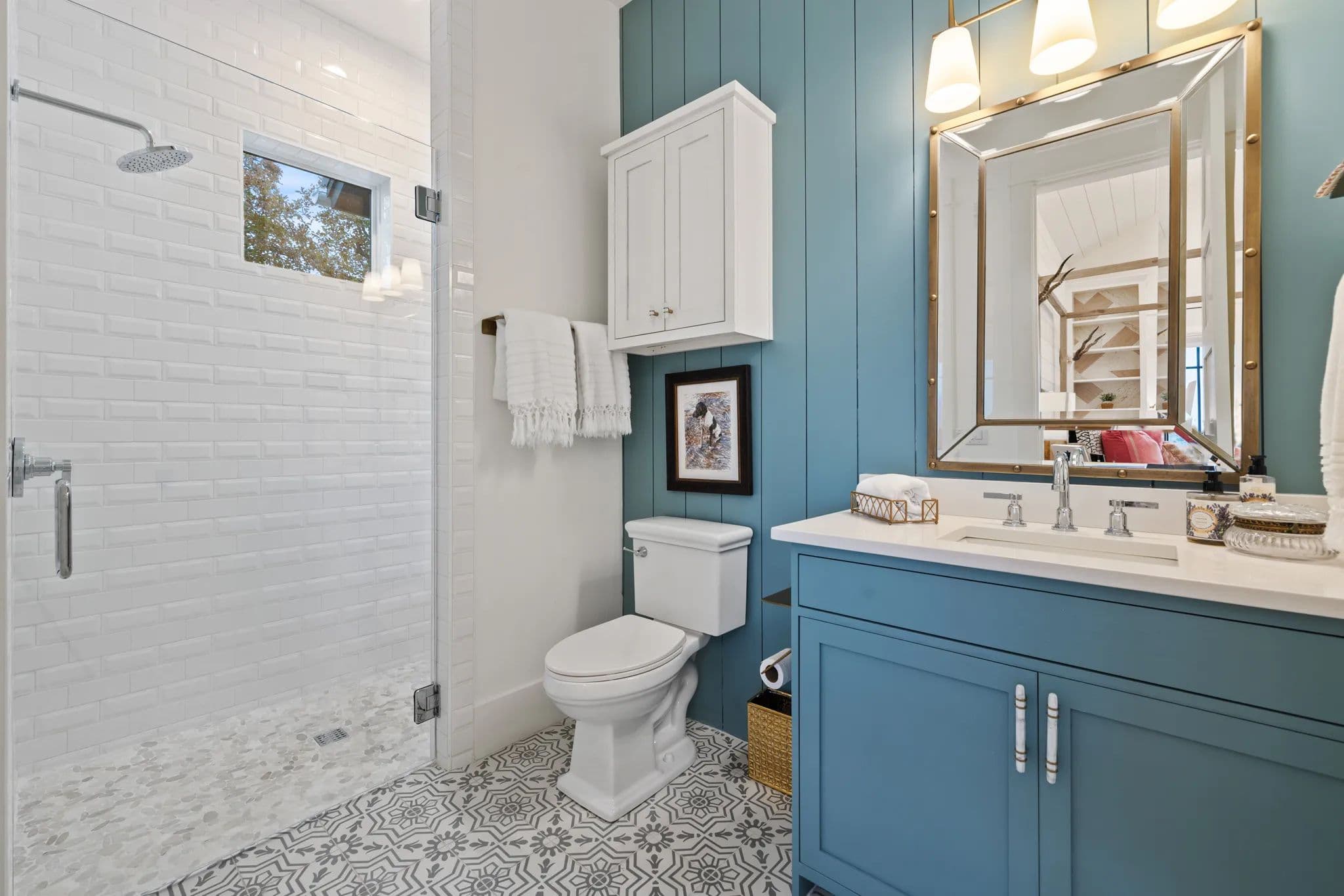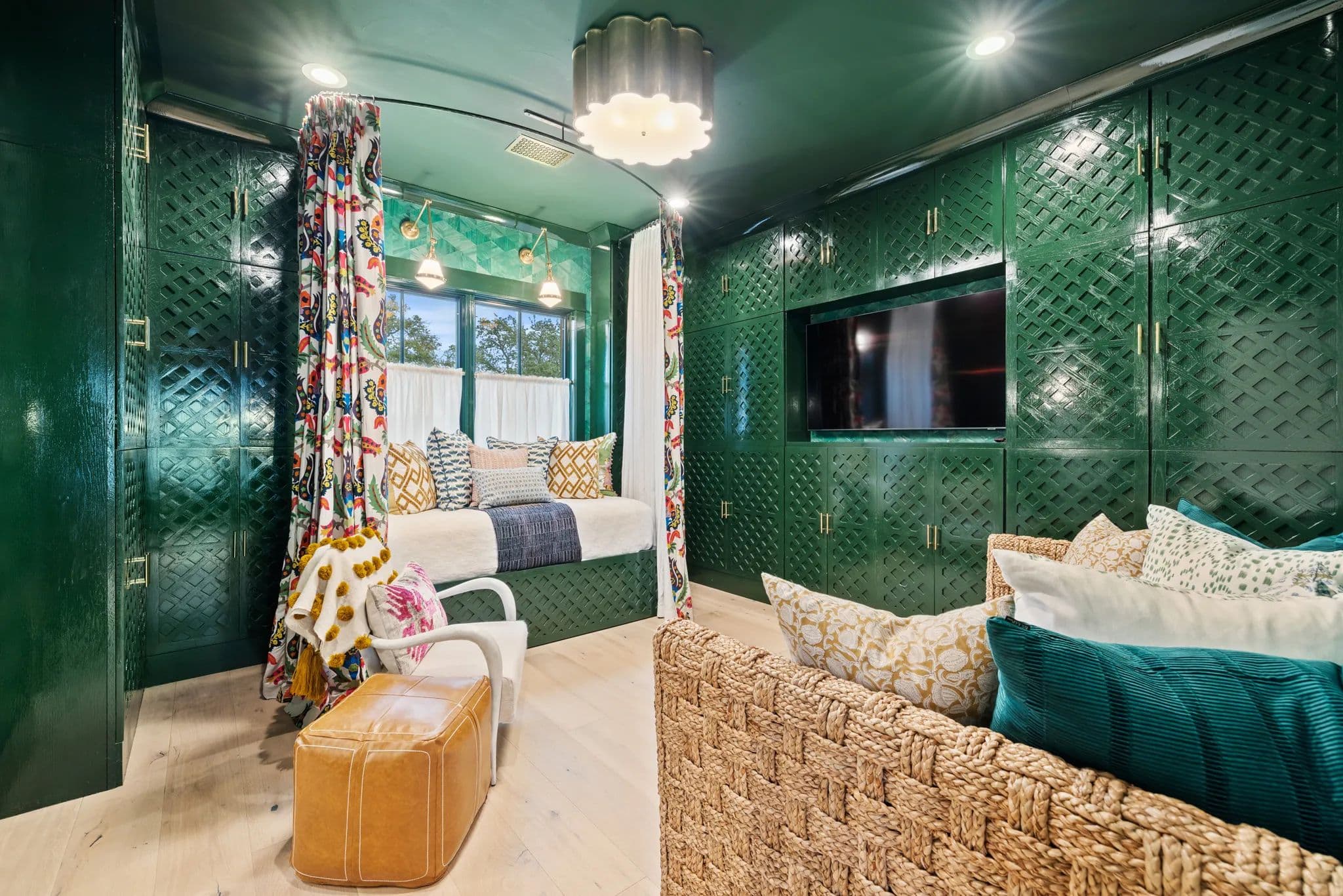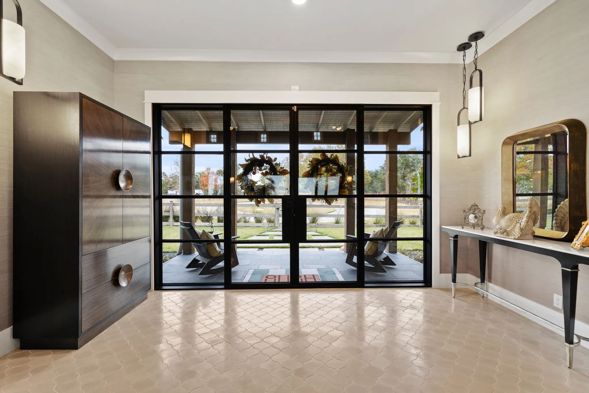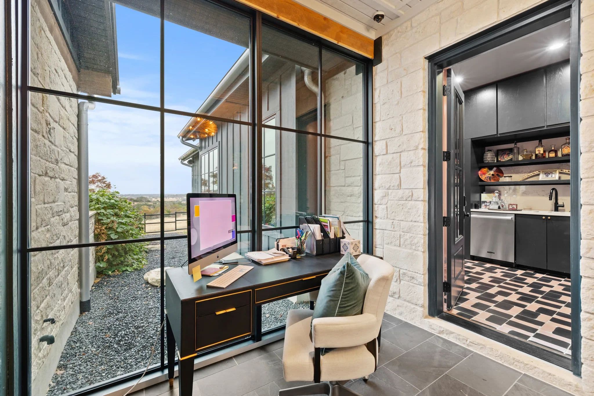 The home also boasts an office breezeway enclosed with heat and A/C, a bar with a third dishwasher, sink, 2 cold drawers, and a large wine fridge, as well as a small comfy den with 2 additional ensuite bedrooms. The living room is a great room with a dining table, sofa, chairs, TV, and a gas fireplace. The powder room is privately located off of the living room with access to the outdoor living area.