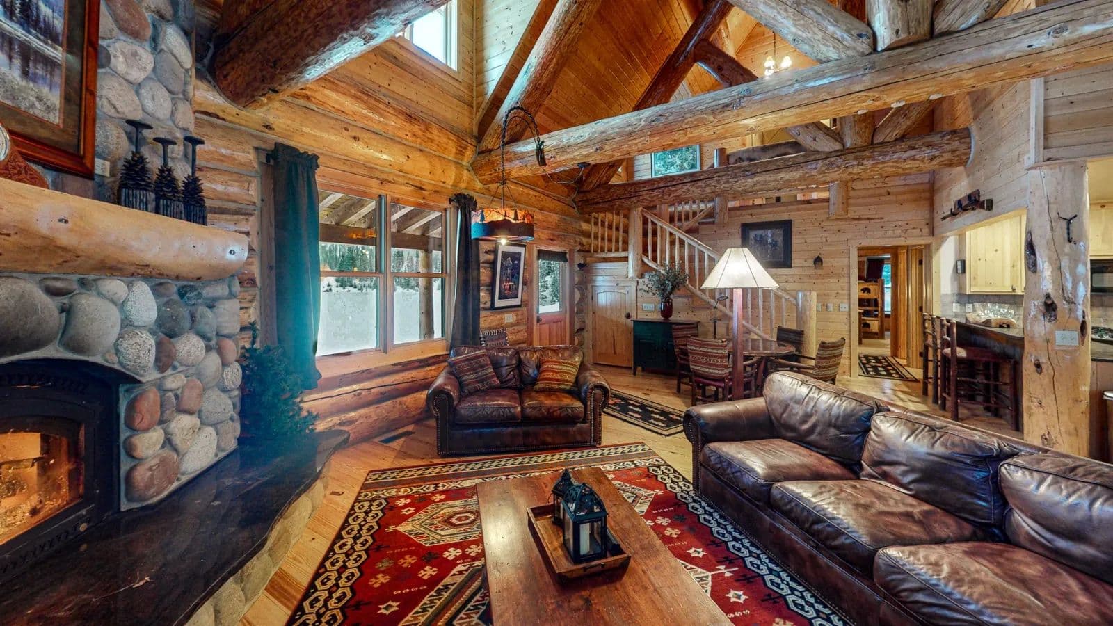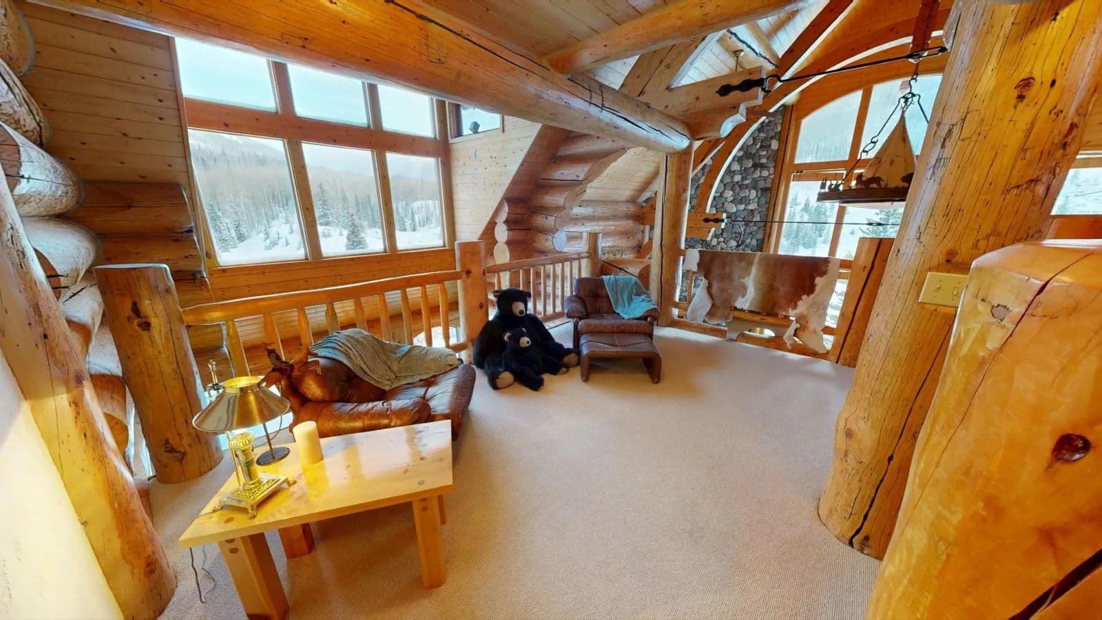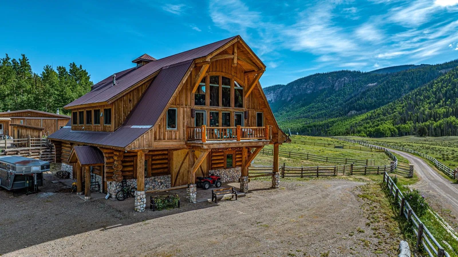 The estate includes multiple well-appointed structures, including an Engelmann Spruce Log Cabin boasting 4,193± square feet of living space with extraordinary high ceilings, a floor-to-ceiling three-story fireplace, and expansive windows showcasing the properties breathtaking views. Additional structures on the ranch include a large barn with a caretaker’s apartment above, a second log cabin, a fully equipped workshop, and a dedicated yoga/exercise room near the main house.
