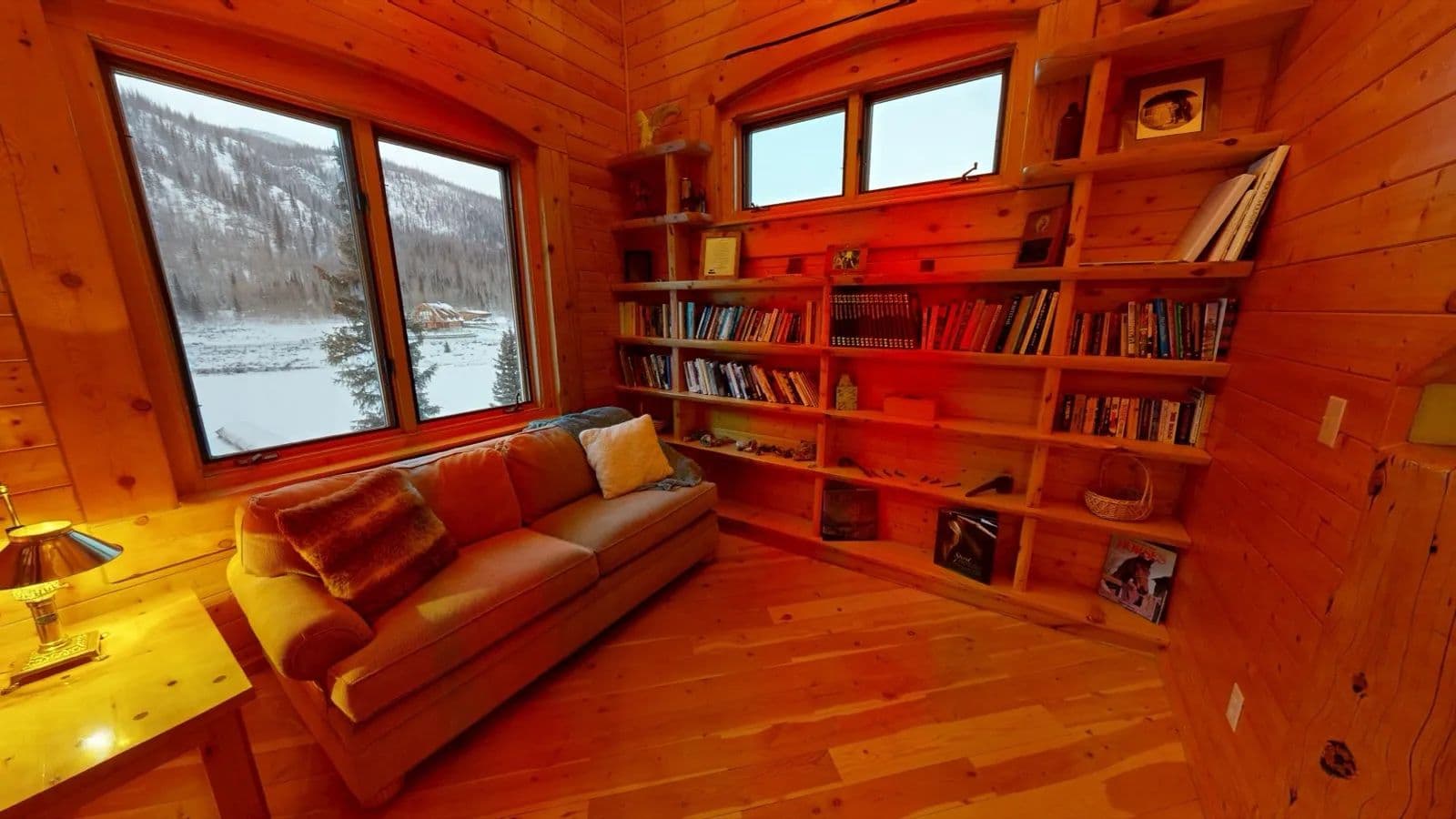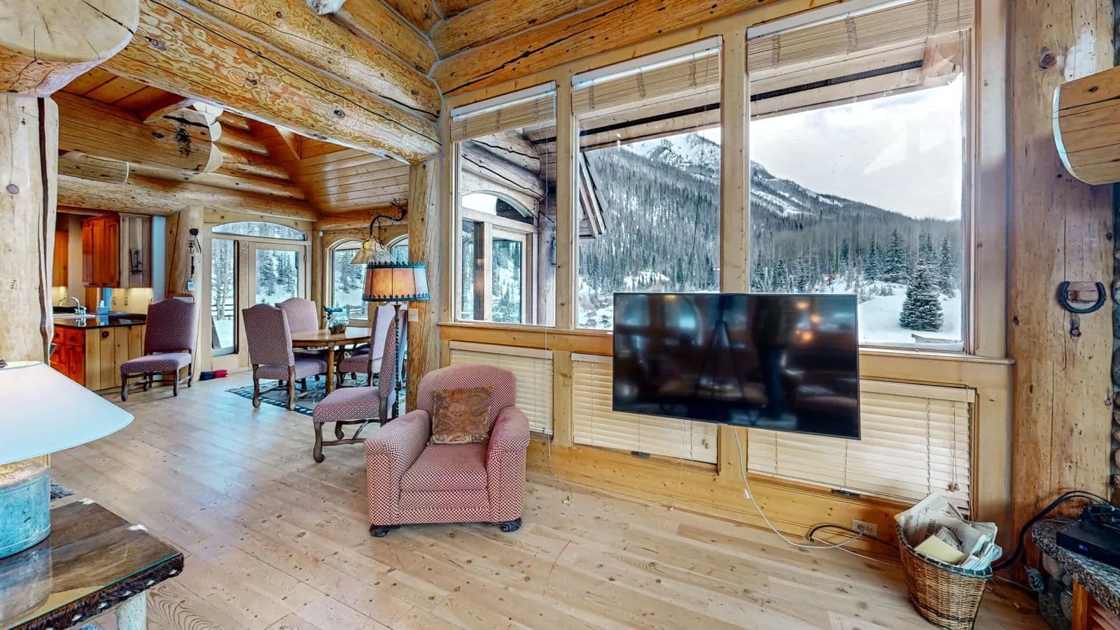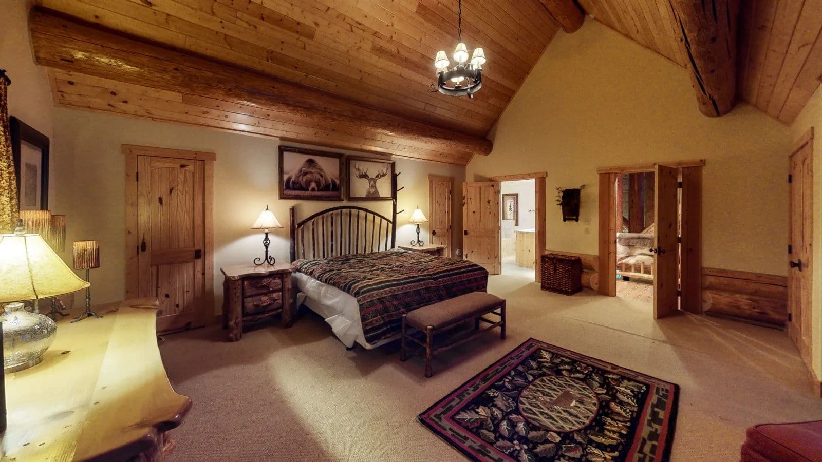 The estate includes multiple well-appointed structures, including an Engelmann Spruce Log Cabin boasting 4,193± square feet of living space with extraordinary high ceilings, a floor-to-ceiling three-story fireplace, and expansive windows showcasing the properties breathtaking views. Additional structures on the ranch include a large barn with a caretaker’s apartment above, a second log cabin, a fully equipped workshop, and a dedicated yoga/exercise room near the main house.