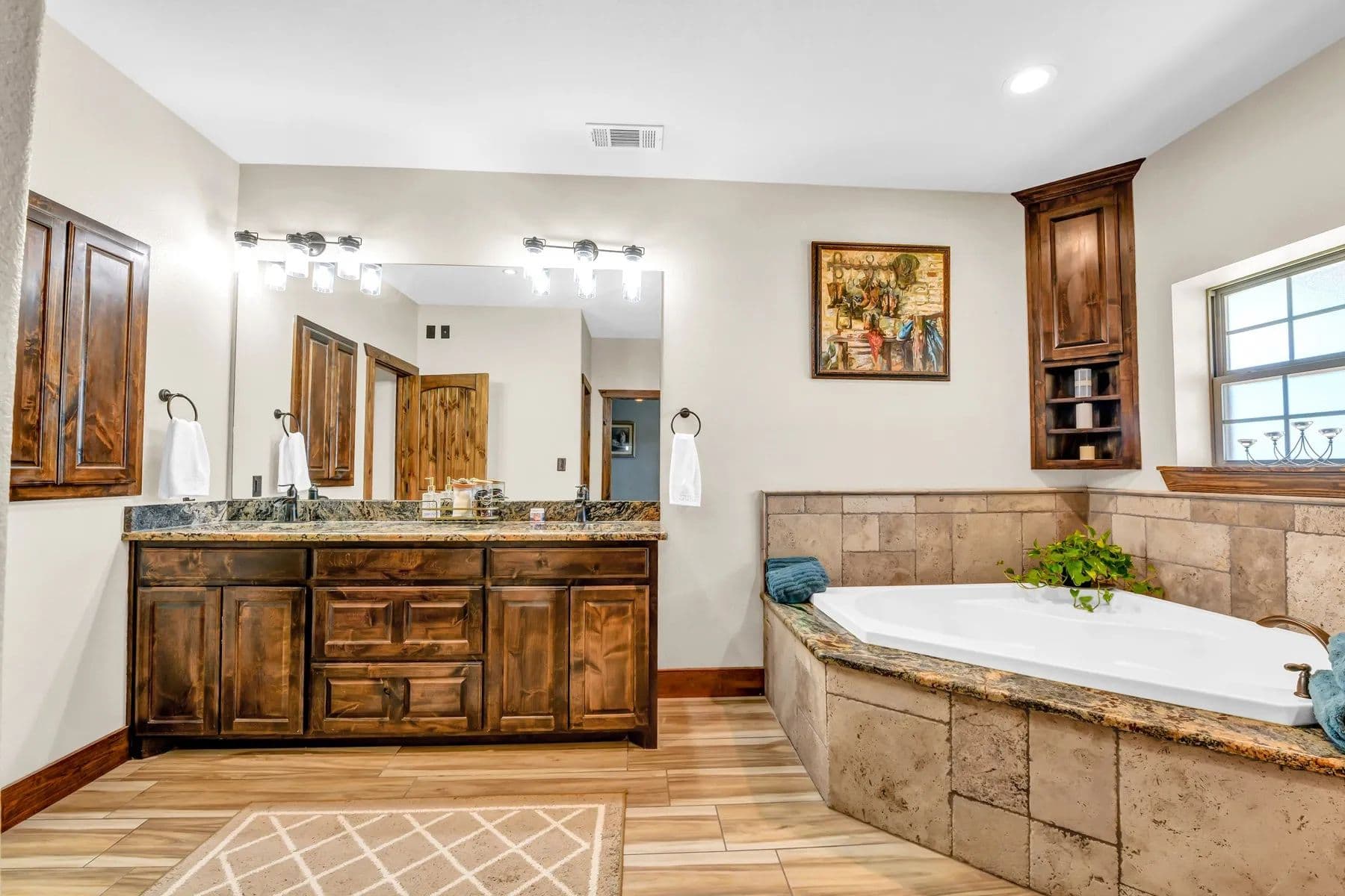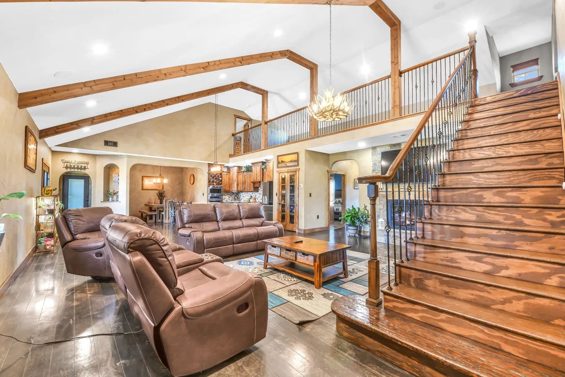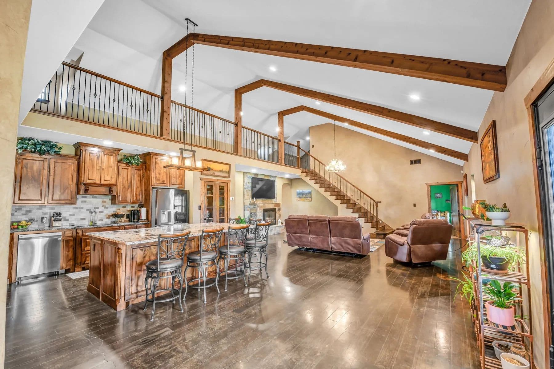 The kitchen boasts an oversized island, LG stainless appliances such as convection oven, induction cooktop, microwave, dishwasher, beautiful real wood cabinetry not only in the kitchen but throughout the home. The open living room features an Oklahoma stone fireplace with a mantle and raised hearth. The primary bedroom offers a spa-like bathroom with a rain showerhead, water jets, and an oversized soaking tub for total relaxation. The loft includes a media-sitting area with built-ins and 2 large bedrooms.